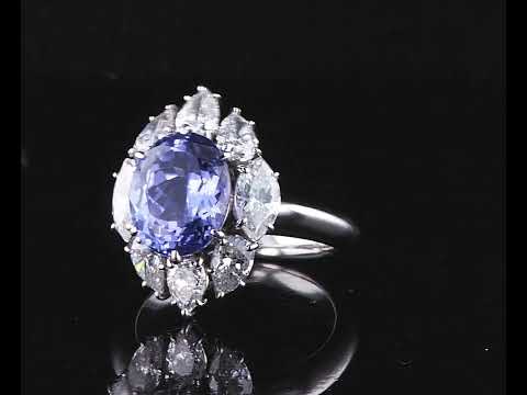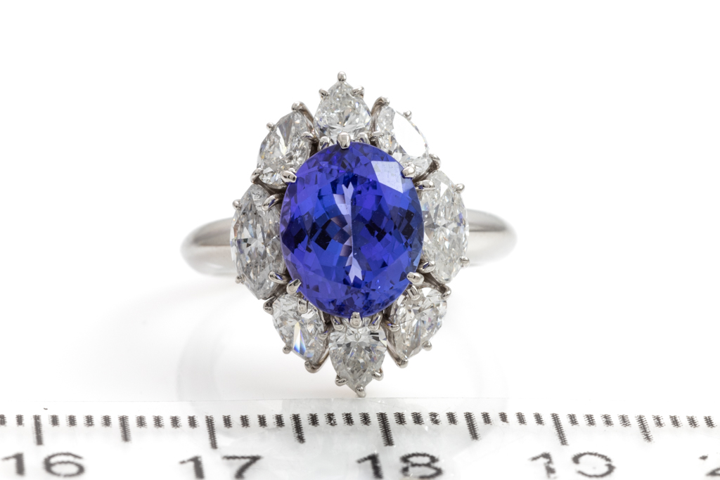 Tanzanite and Diamond ring with oval shape Tanzanite of 3.41ct and marquise cut & pear shape Diamonds totalling 2.07cts (Estimated grading: G-H SI-P1). Platinum. Ring size K. Weight: 9.4g. With Certificate #416350. (Pre-owned)