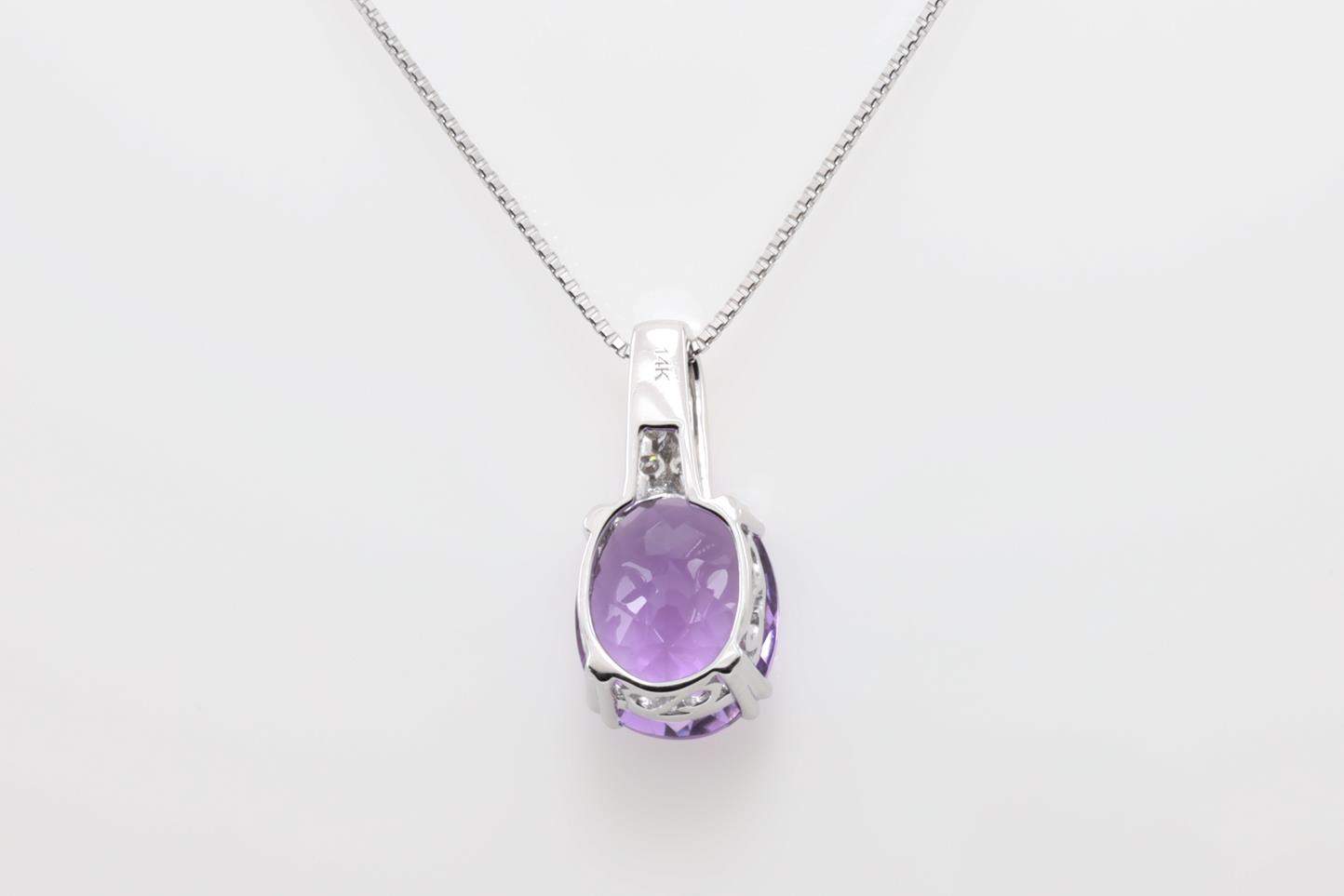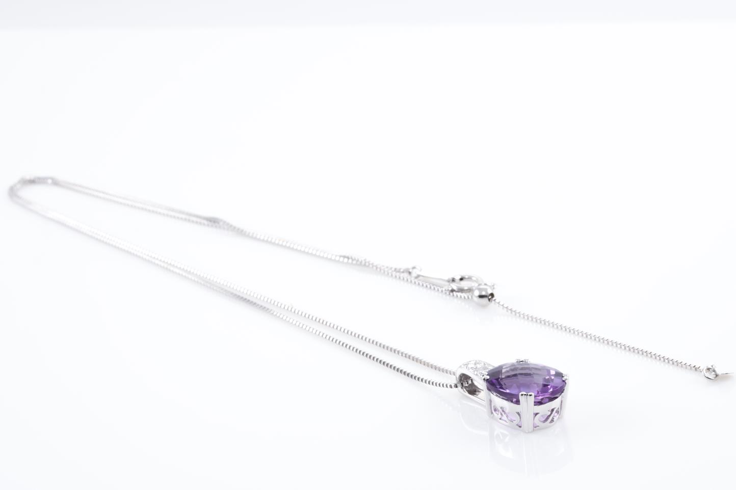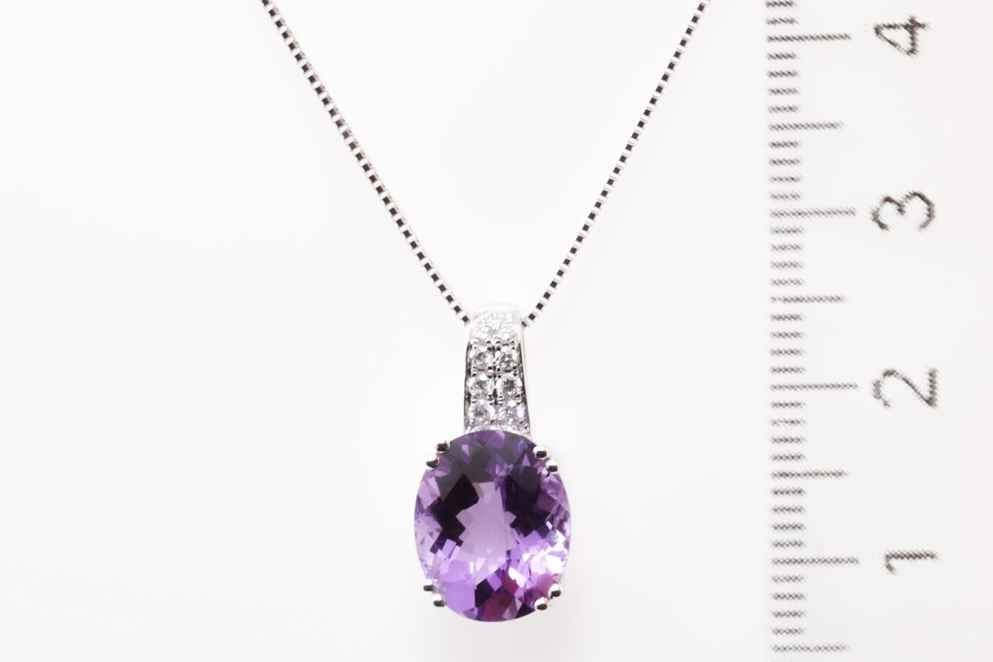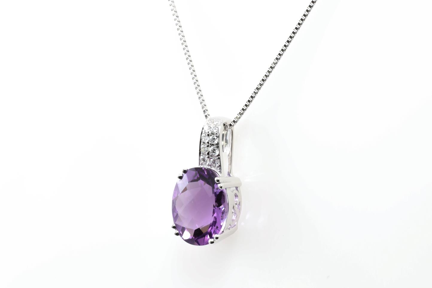 Amethyst and Diamond pendant with oval shape Amethyst of 3.42ct and Diamonds totalling 0.10cts. 14ct white gold with 18ct gold adjustable 45cm chain. Weight: 3.6g (New).