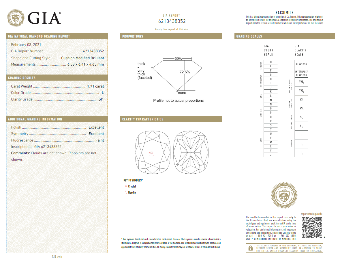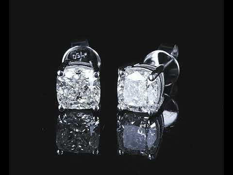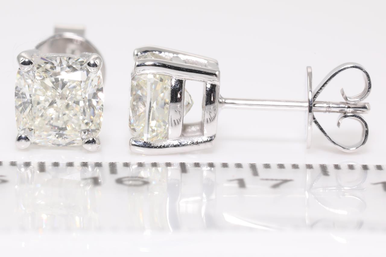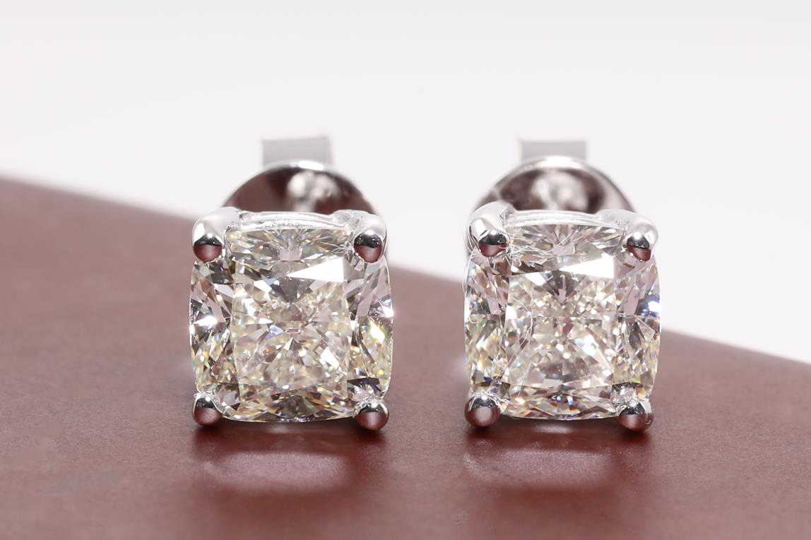 Diamond stud earrings with 2 cushion cut Diamonds totalling 3.42cts (with GIA reports graded as L SI1#6213438352, 2387687340). 18ct white gold. Weight: 3.7g (New).