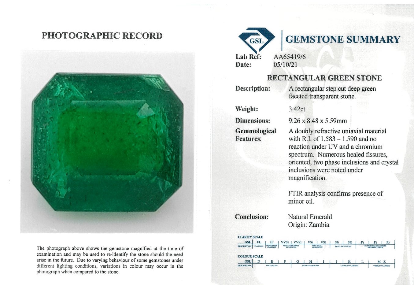 A loose Zambian emerald cut Emerald of 3.42ct (with GSL Gemstone summary report #AA65419/6). Dimensions: 9.26 x 8.48 x 5.59mm. (New)