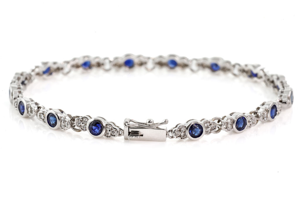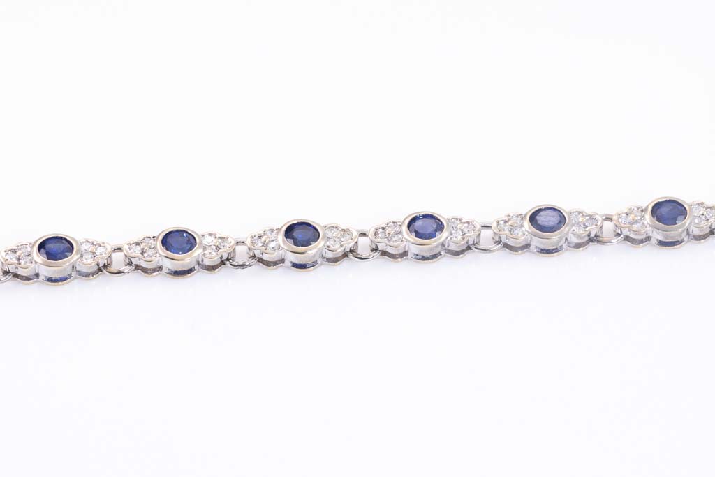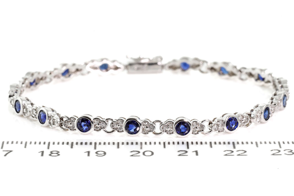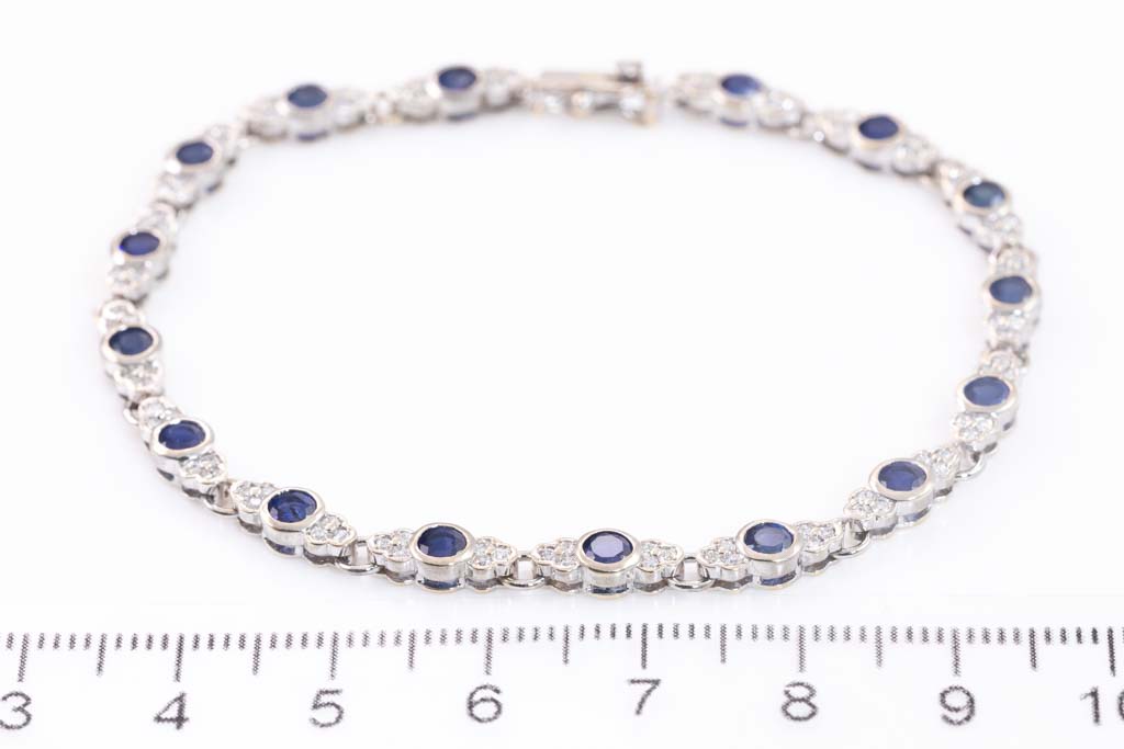 Sapphire and Diamond bracelet with round blue Sapphires totalling 3.43cts and round Diamonds totalling 0.60cts (Estimated grading: H SI). 18ct white gold. Length: 18.0cm. Weight: 10.2g. (Pre-owned)