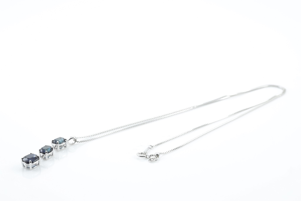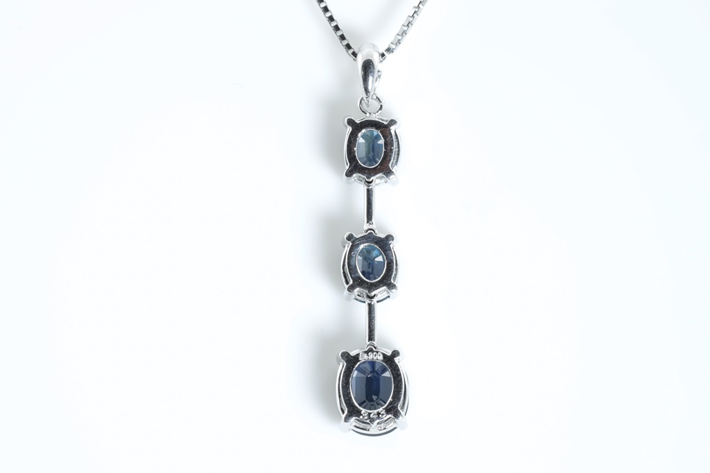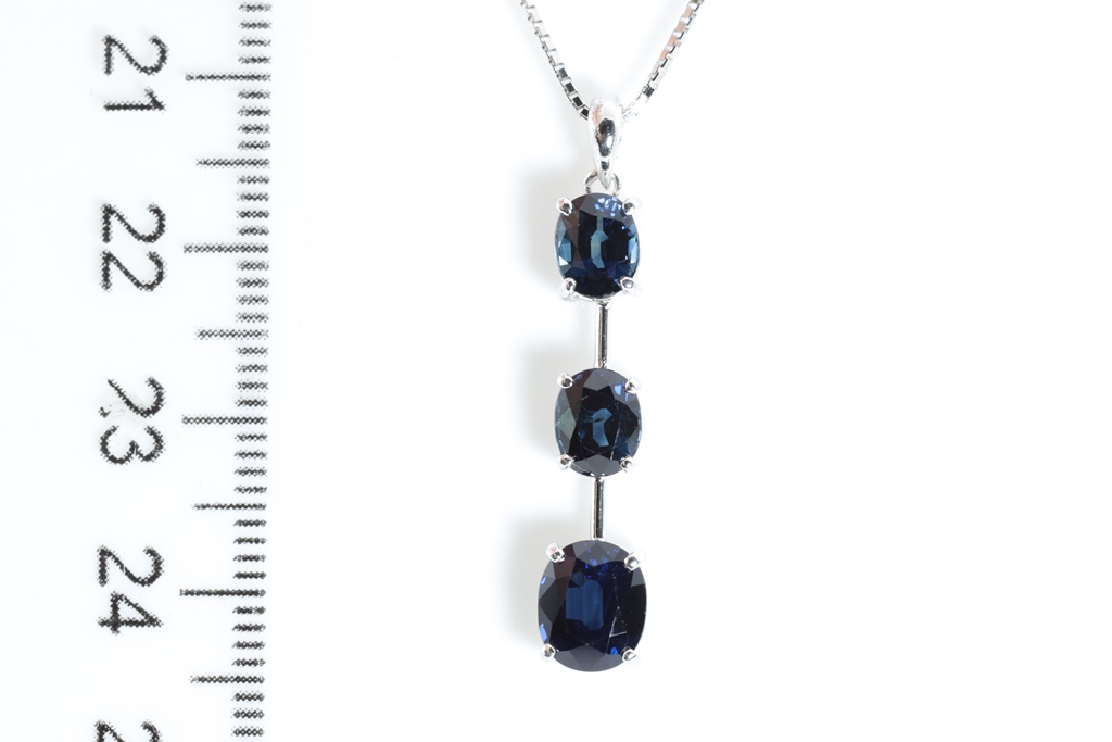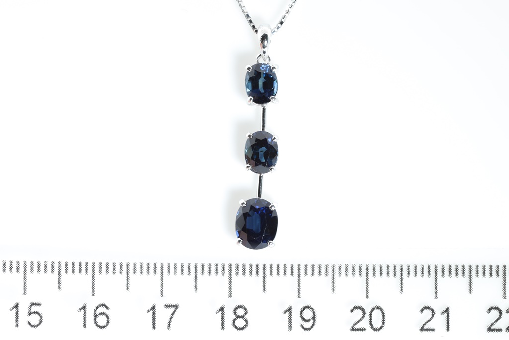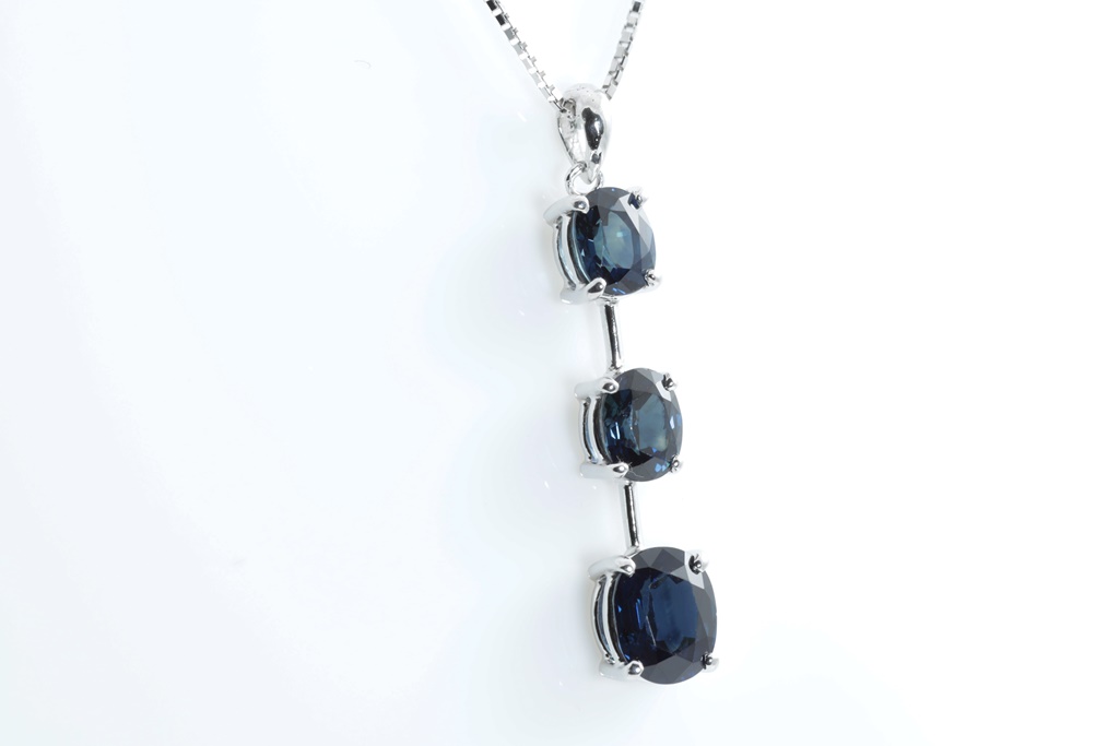 Sapphire pendant with 3 oval shape dark blue Sapphires totalling 3.43cts. Platinum with adjustable 44cm 18ct white gold chain. Weight: 5.0g. (Pre-owned)