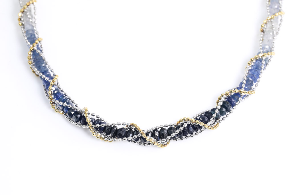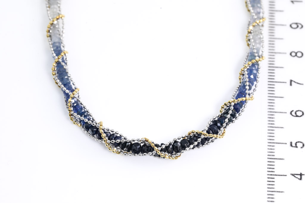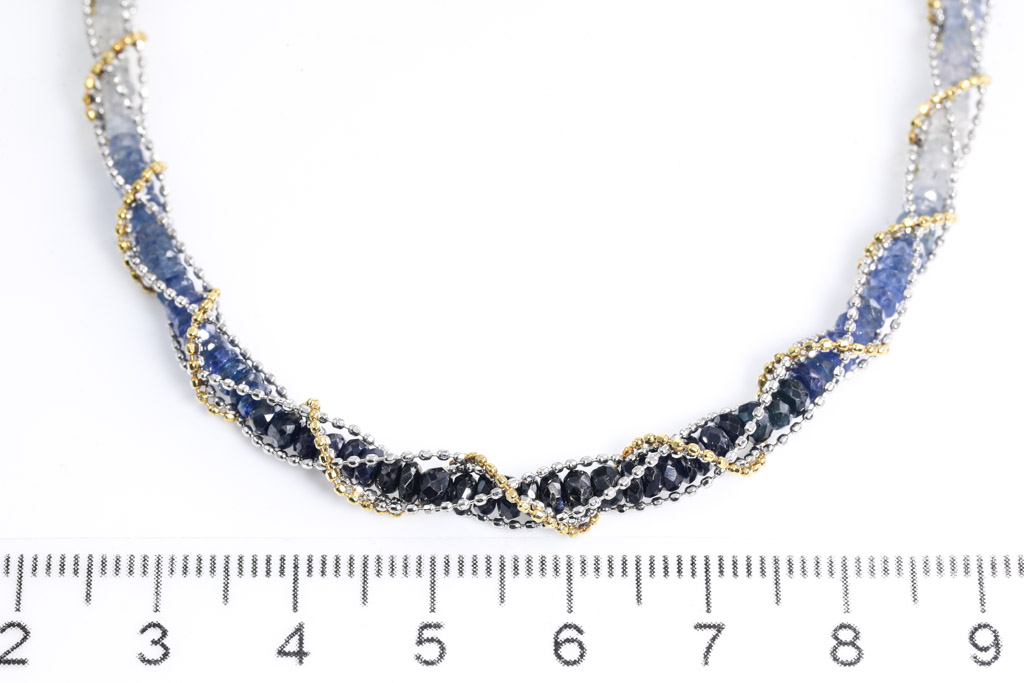 Sapphire necklace with dark blue - colourless Sapphire Beads totalling 34.50cts. 18ct yellow and white gold. Length:48cm. Weigth: 16.5g. (Pre-owned)