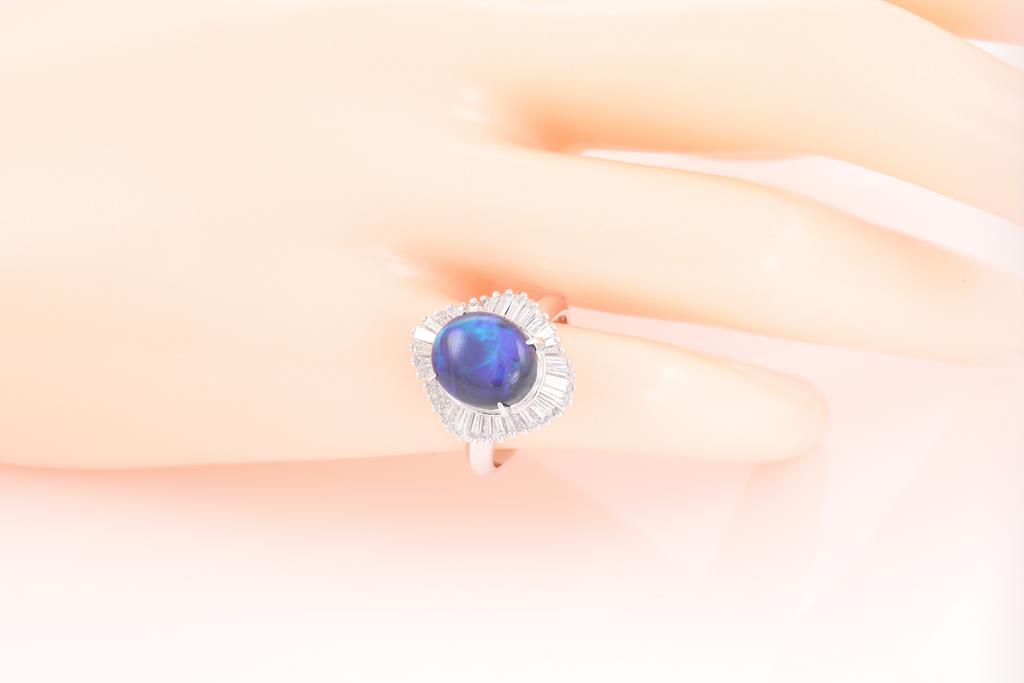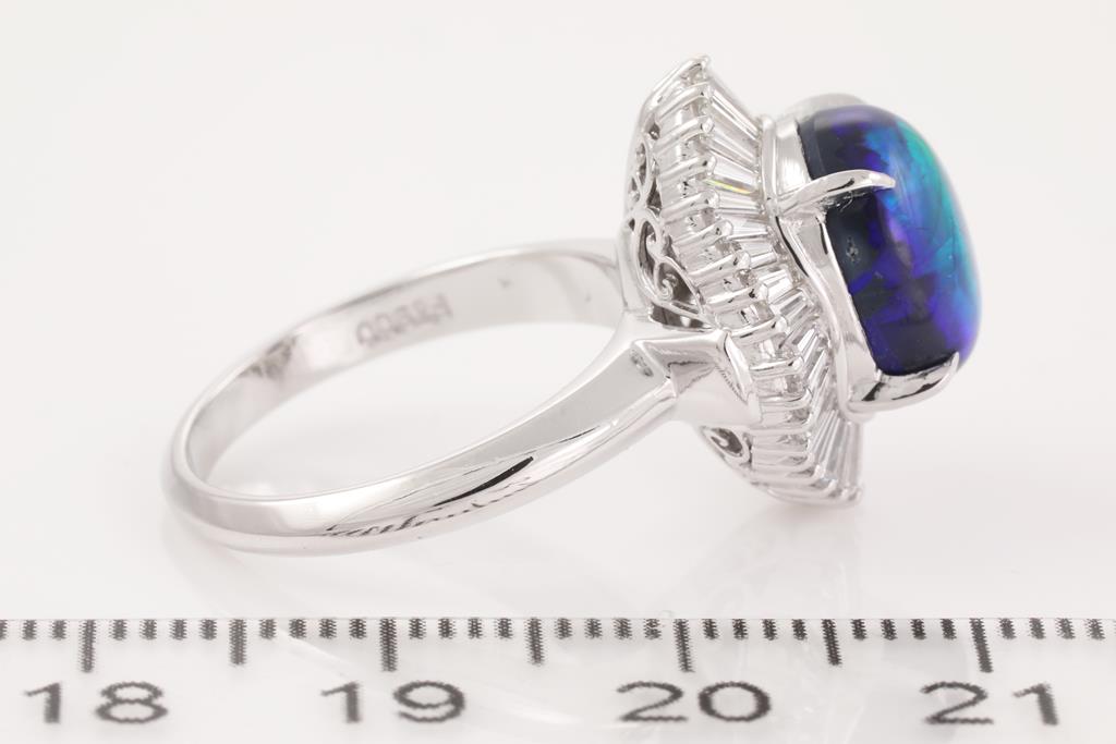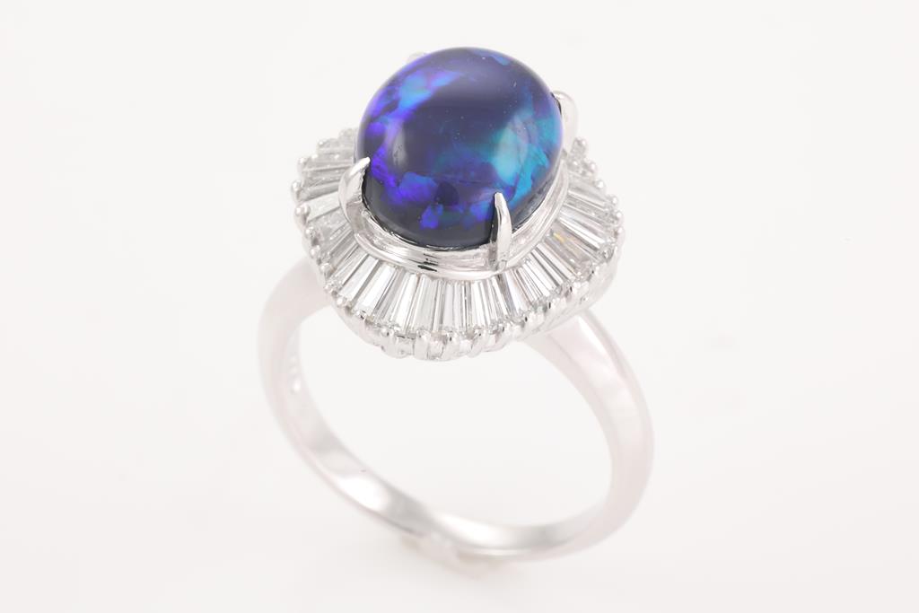 Opal and Diamond ring with an oval Black Opal of 3.45ct and baguette cut Diamonds totalling 0.98cts (Estimated grading: F-G VS-SI). Platinum. Ring size K1/2. Weight: 9.1g. (Pre-owned)