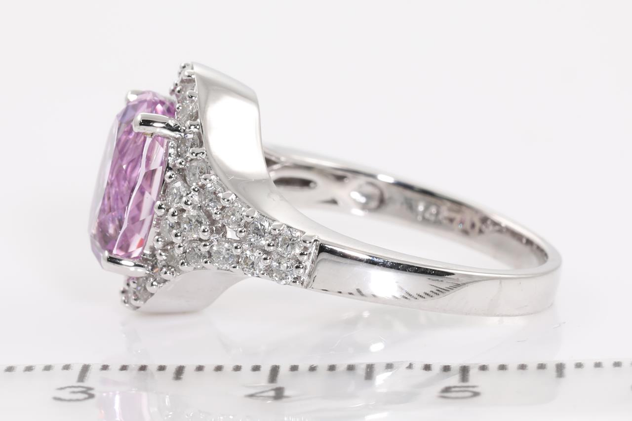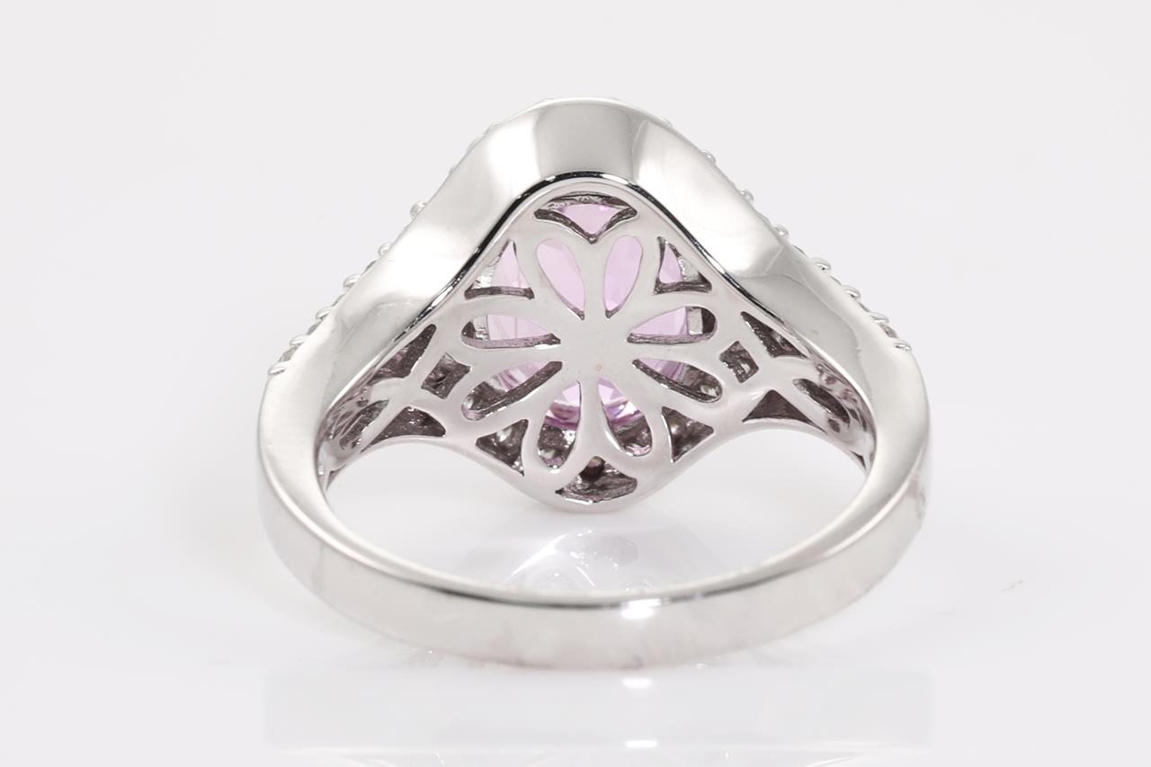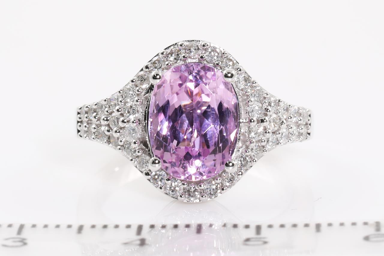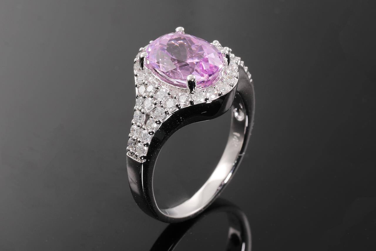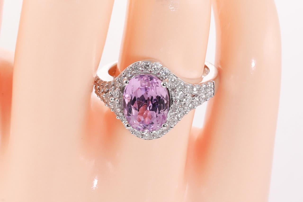 Kunzite and Diamond Ring with oval shape Kunzite of 3.45cts and Diamonds totalling 0.80cts (Estimated grading: G P1-2). 14ct white gold. Size: N1/2. Weight: 6.9g. (As new)
