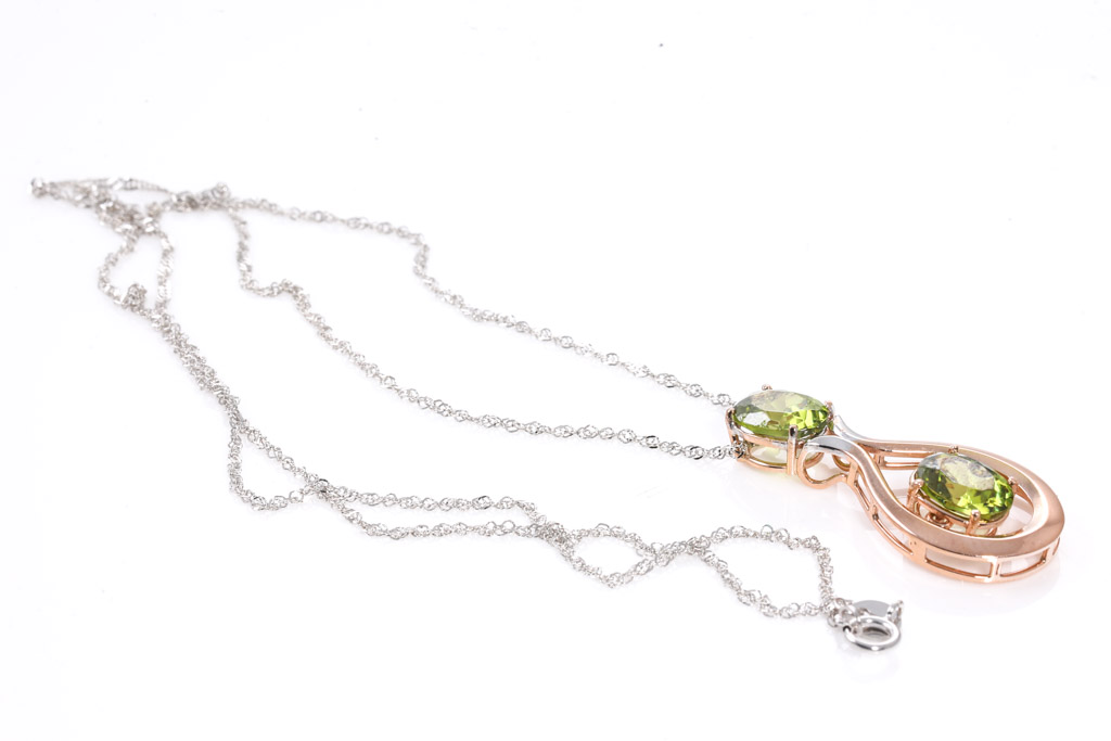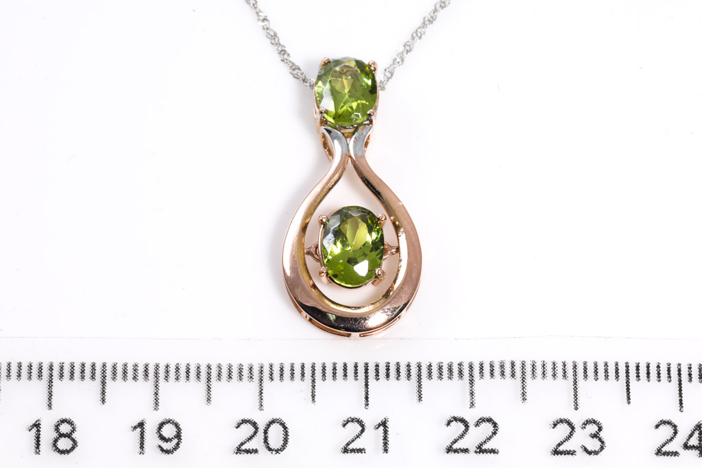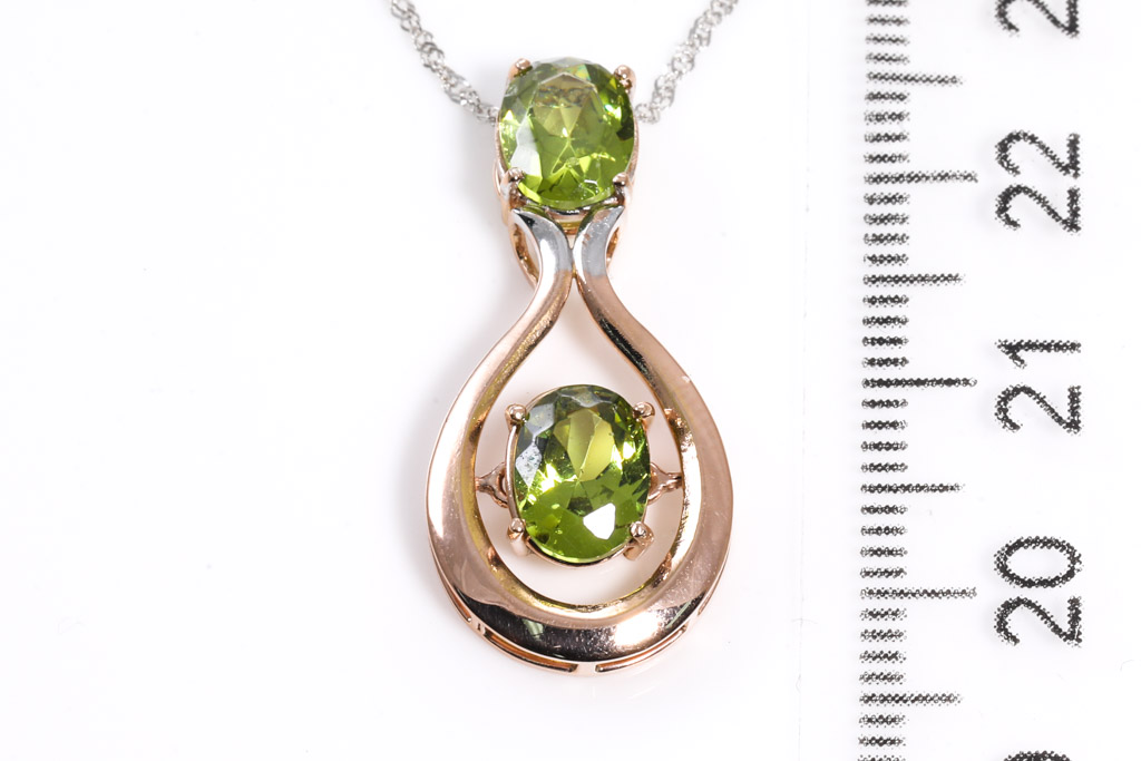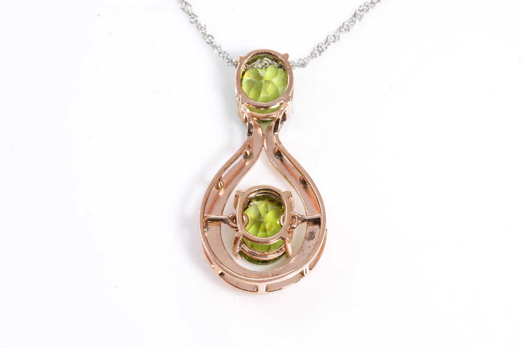 Peridot pendant with two oval cut Peridot totalling approximately 3.46cts - note: wear marks on surface of the stone. 18ct rose gold with 18ct white gold 44cm chain. Weight 3.9g. (Pre-owned)