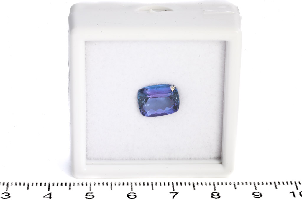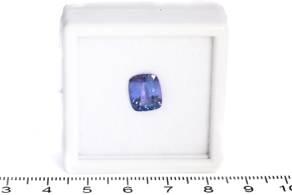 A loose cushion cut Tanzanite of 3.47ct. Dimensions: 10.07mm x 8.16mm x 4.96mm. (As New)