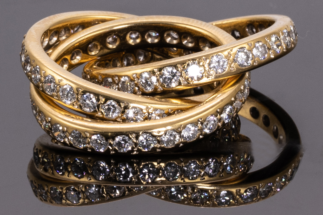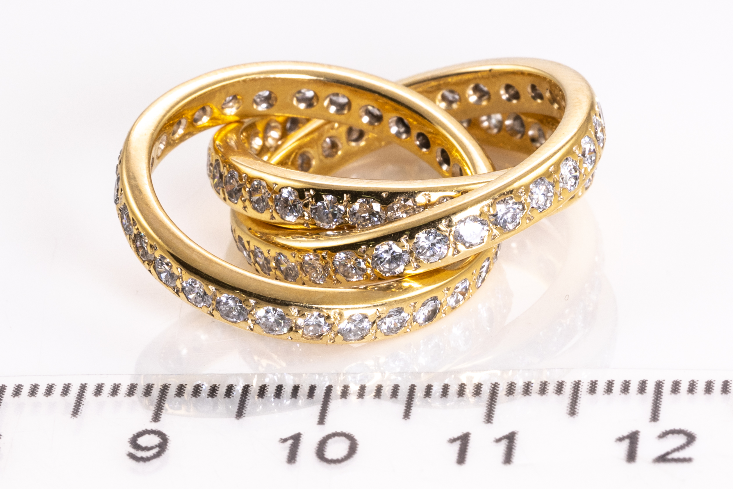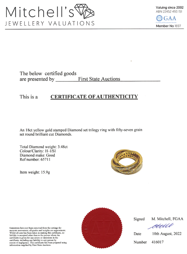 Trinity Diamond ring with round cut Diamonds totalling approximately 3.48cts (Estimated grading: H-I SI). 18ct yellow gold. Ring size N. Weight 15.9g. With Certificate #416017. (Pre-owned)