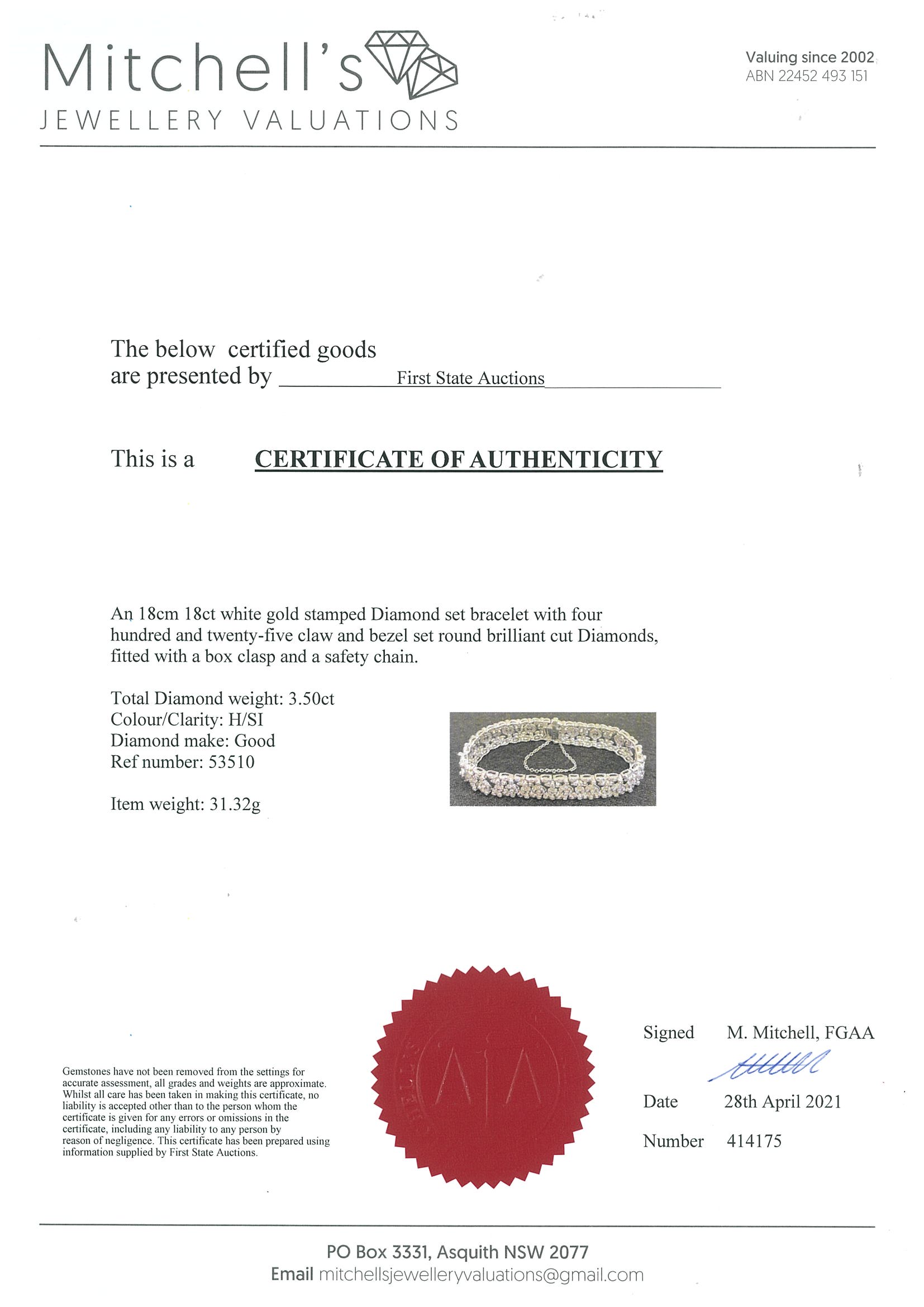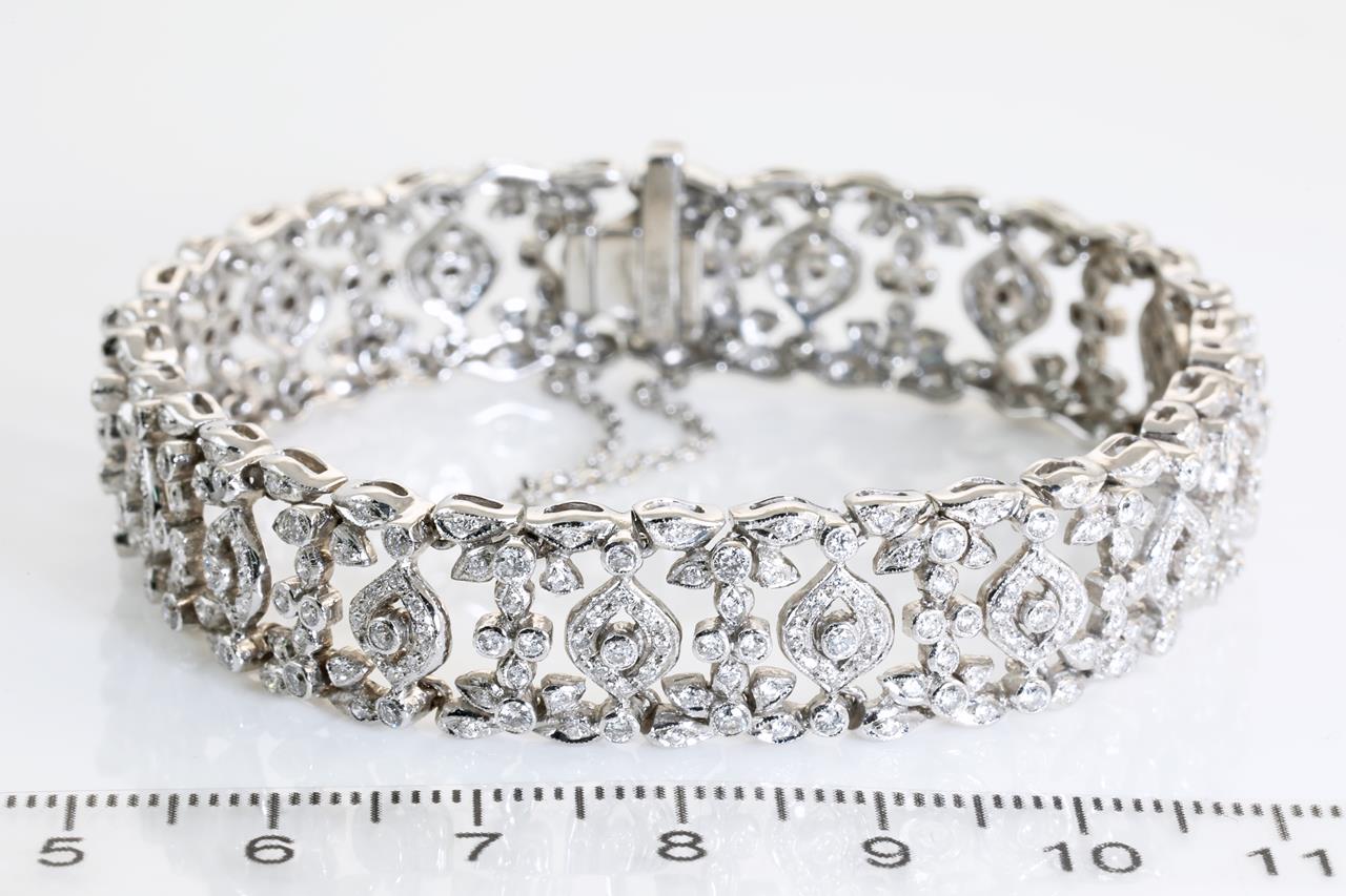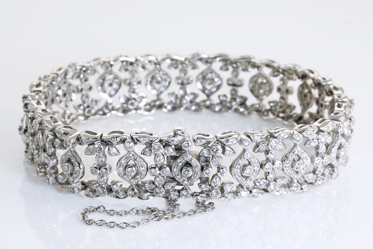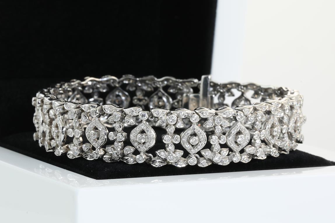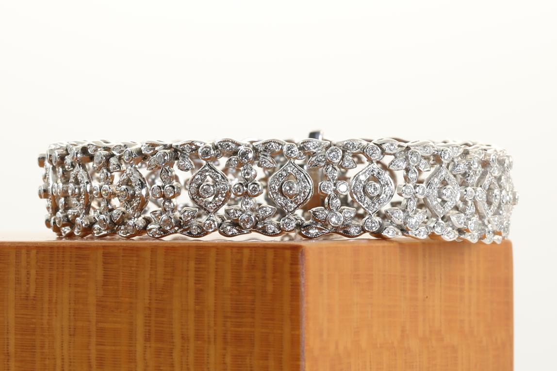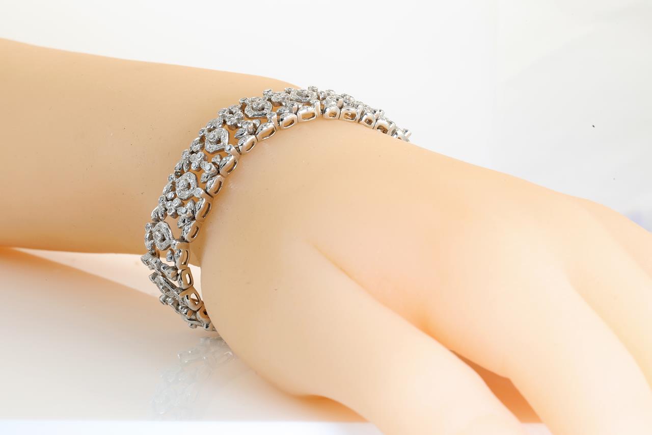 Diamond bracelet with round Diamonds totalling 3.50cts (Estimated grading: H SI). 18ct white gold. Length: 18cm. Weight: 31.3g. With certificate # 414175. (Pre-owned)