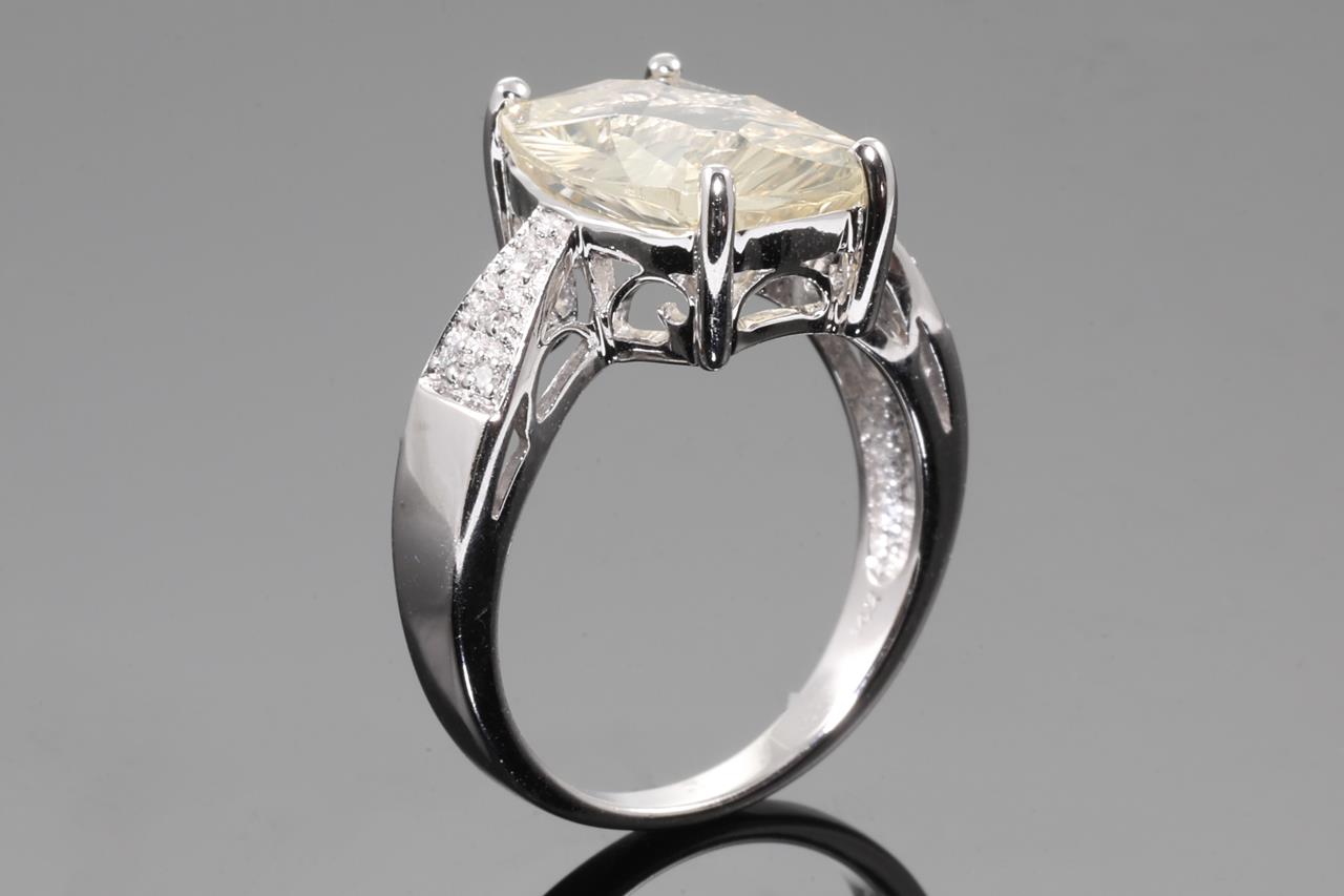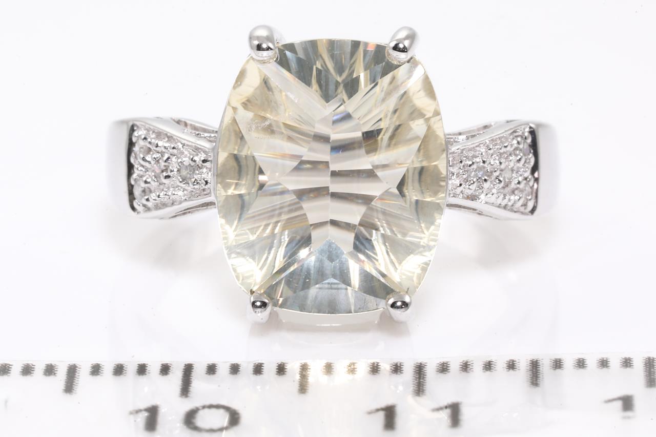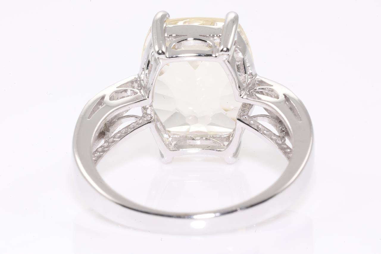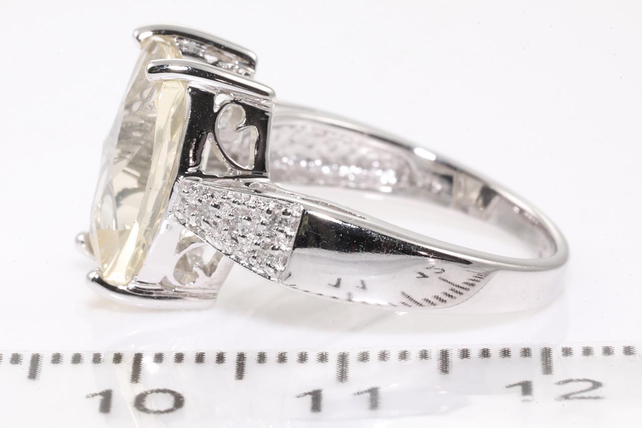 Quartz and Diamond ring with a fancy cut Lemon Quartz of approximately 3.50ct and Diamonds totalling approxmately 0.04cts. 14ct white gold. Ring size L. Weight: 4.6g. (As New)