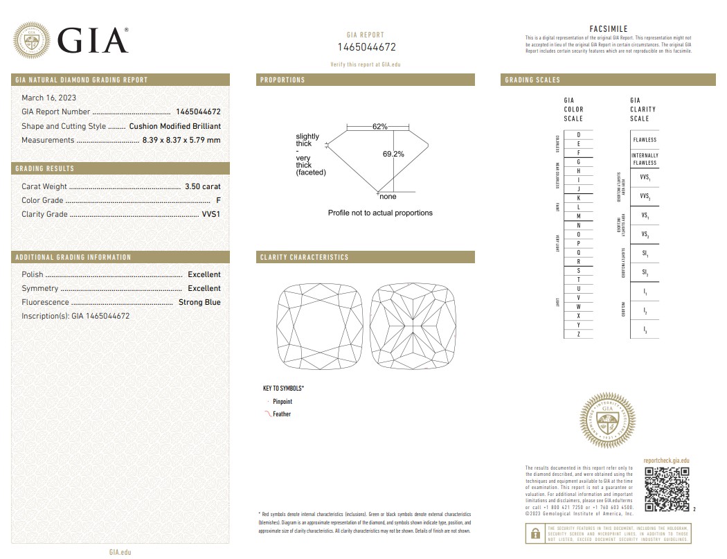 A loose cushion cut Diamond of 3.50ct (with GIA report graded as F VVS1 #1465044672). (New)<br><br><STRONG>*Shipping:</STRONG> <BR>This item will be dispatched 7 working days after full payment is received <BR><BR><STRONG>*Viewing:</STRONG> <BR>Pre-auction viewing is unavailable for this item