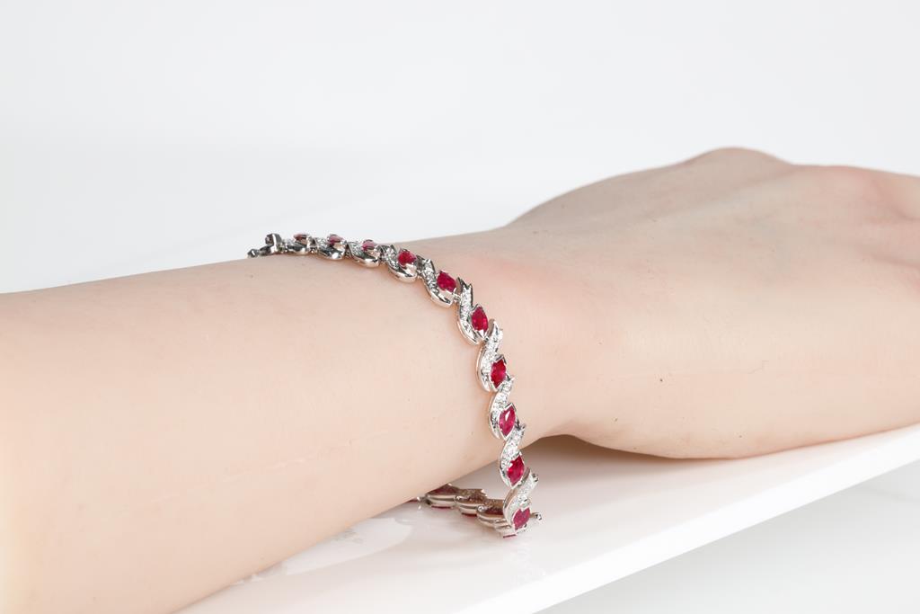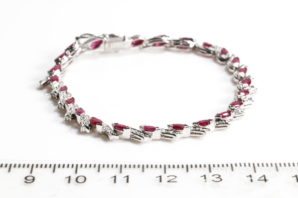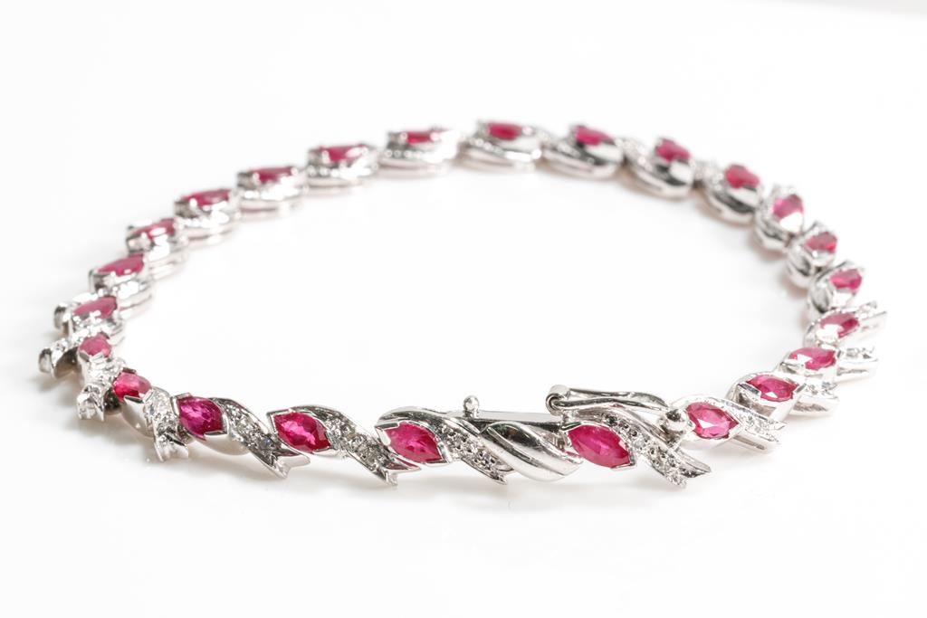 Ruby and Diamond bracelet with marquise cut Rubies totalling 3.50cts and round Diamonds totalling 0.34cts (Estimated grading: G-H VS-SI). Platinum. Length: 18cm. Weight: 12.3g. (Pre-owned)