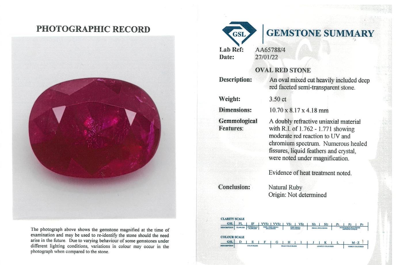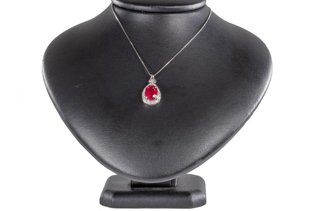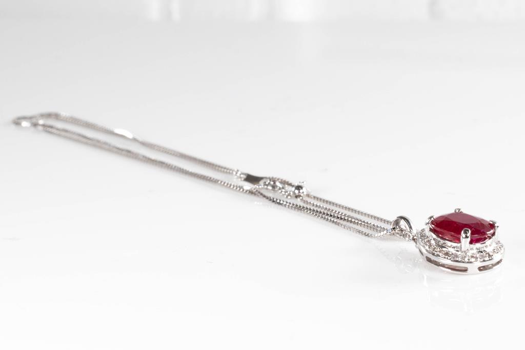 Ruby and Diamond pendant with an oval Ruby of 3.50ct (With GSL summary report #AA65788/4) and Diamonds totalling 0.25cts. 14ct white gold with 18ct gold adjustable 44cm chain. Weight: 5.8g. (New)
