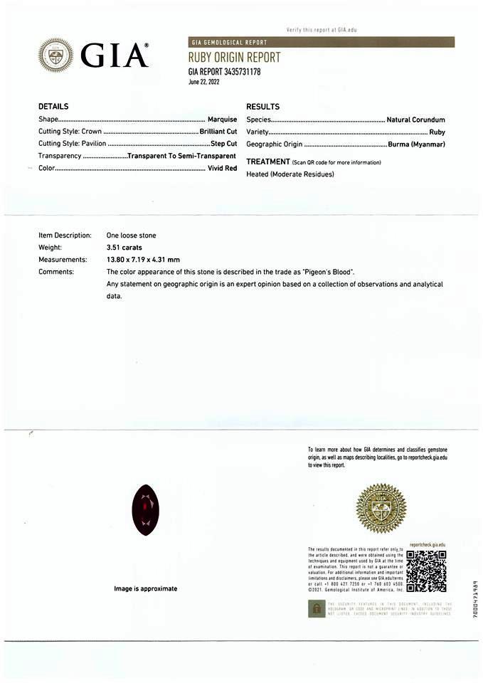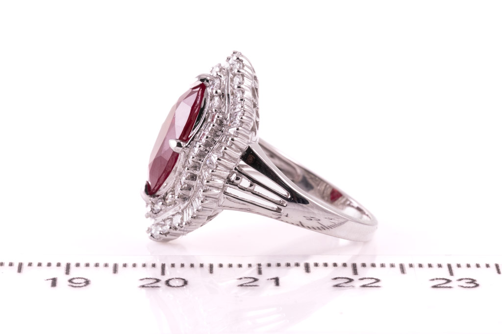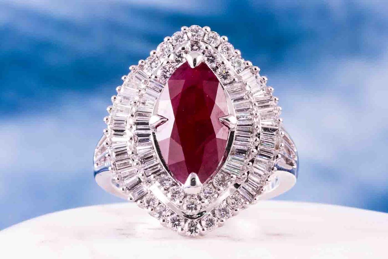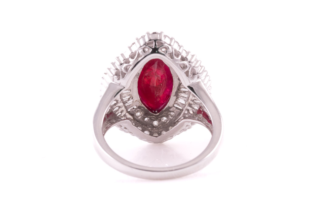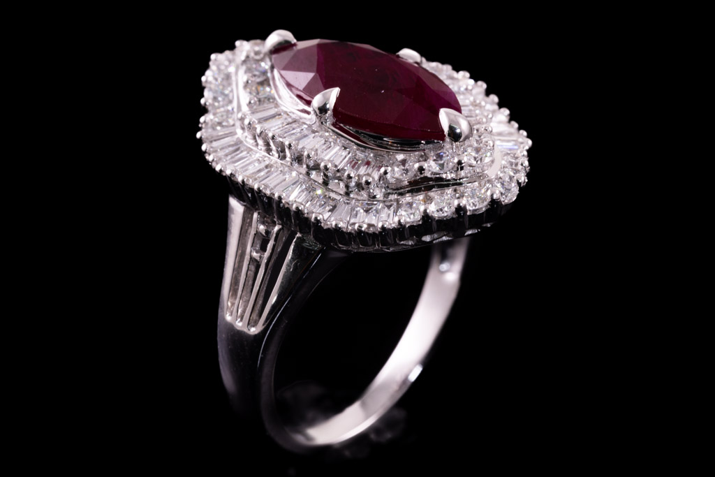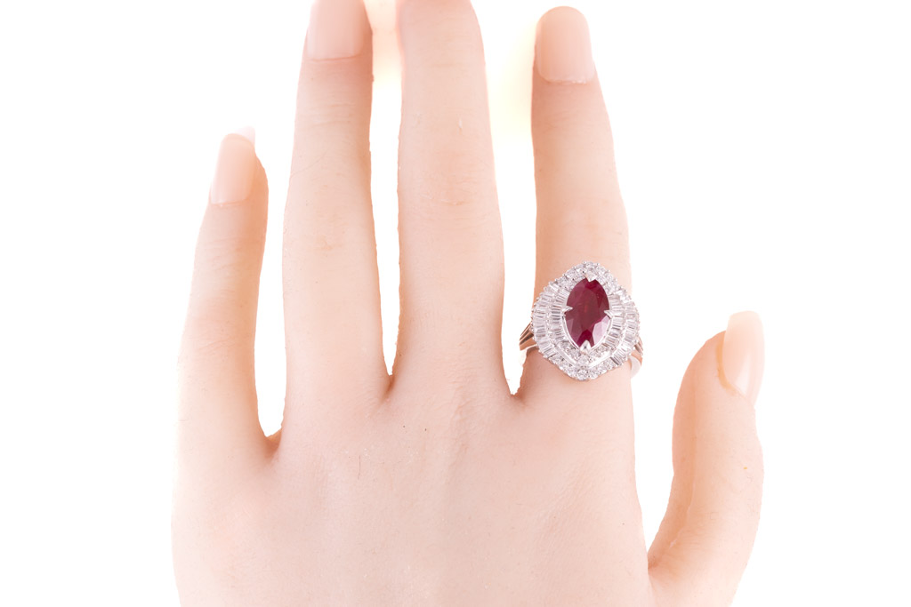 Ruby and Diamond Ring with marquise cut vivid red Pigeons Blood Burmese Ruby of 3.51ct and round & baguette cut Diamonds totalling 1.73cts (Estimated grading: G-H SI) 18ct white gold. Ring size: M1/2. Weight: 7.5g. With GIA Report# 3435731178. (Pre-owned)