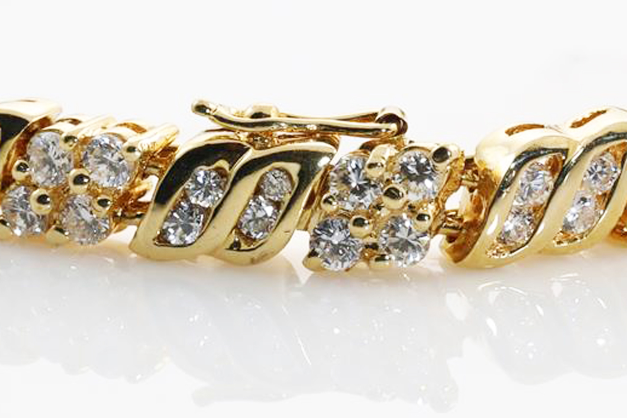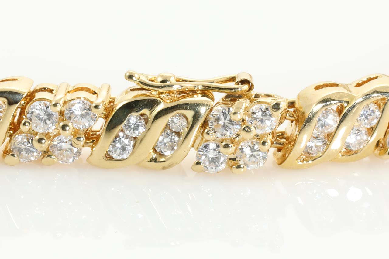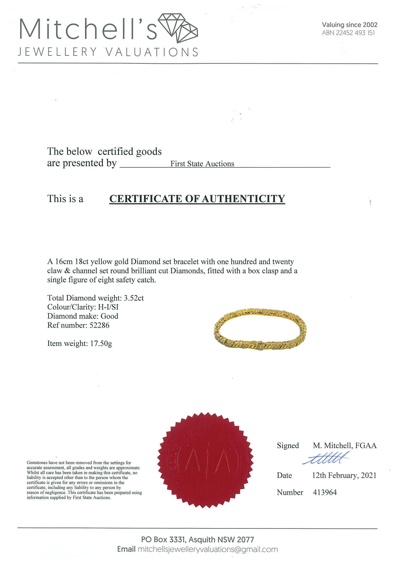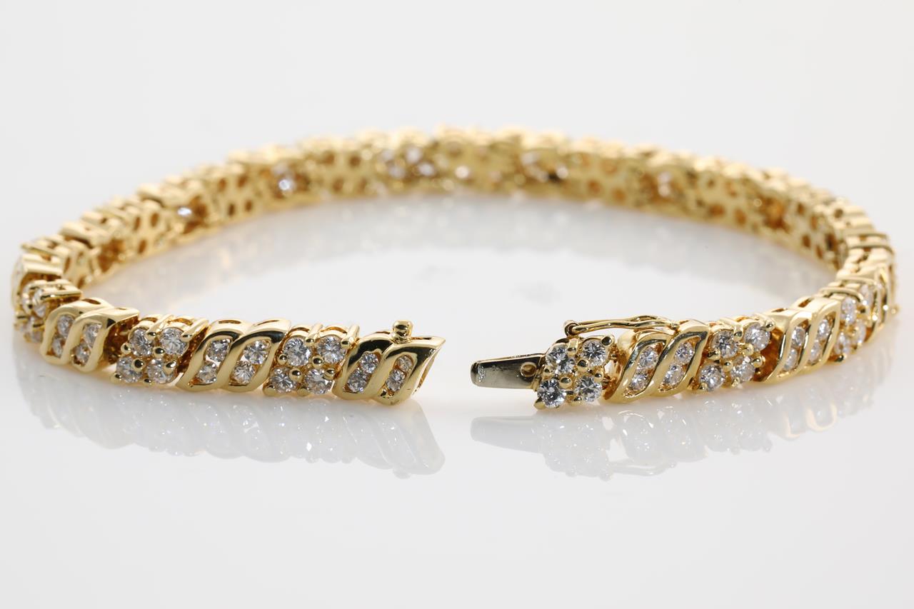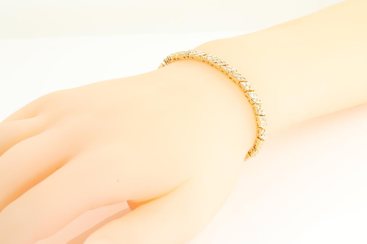 Diamond bracelet with round Diamonds totalling 3.52cts. (Estimated grading: H-I SI). 18ct yellow gold. Length: 16cm. Weight: 17.5g. (Pre-owned). With certificate #413964.