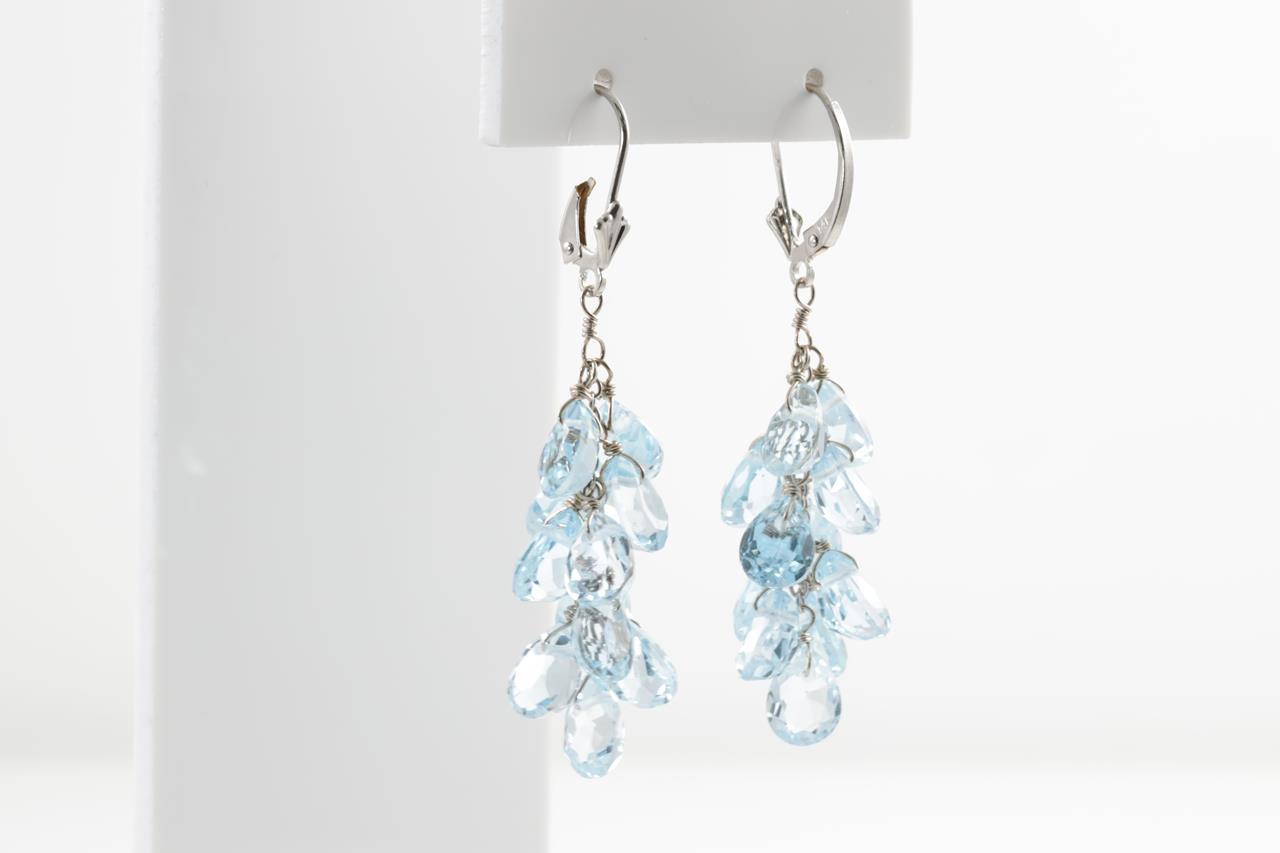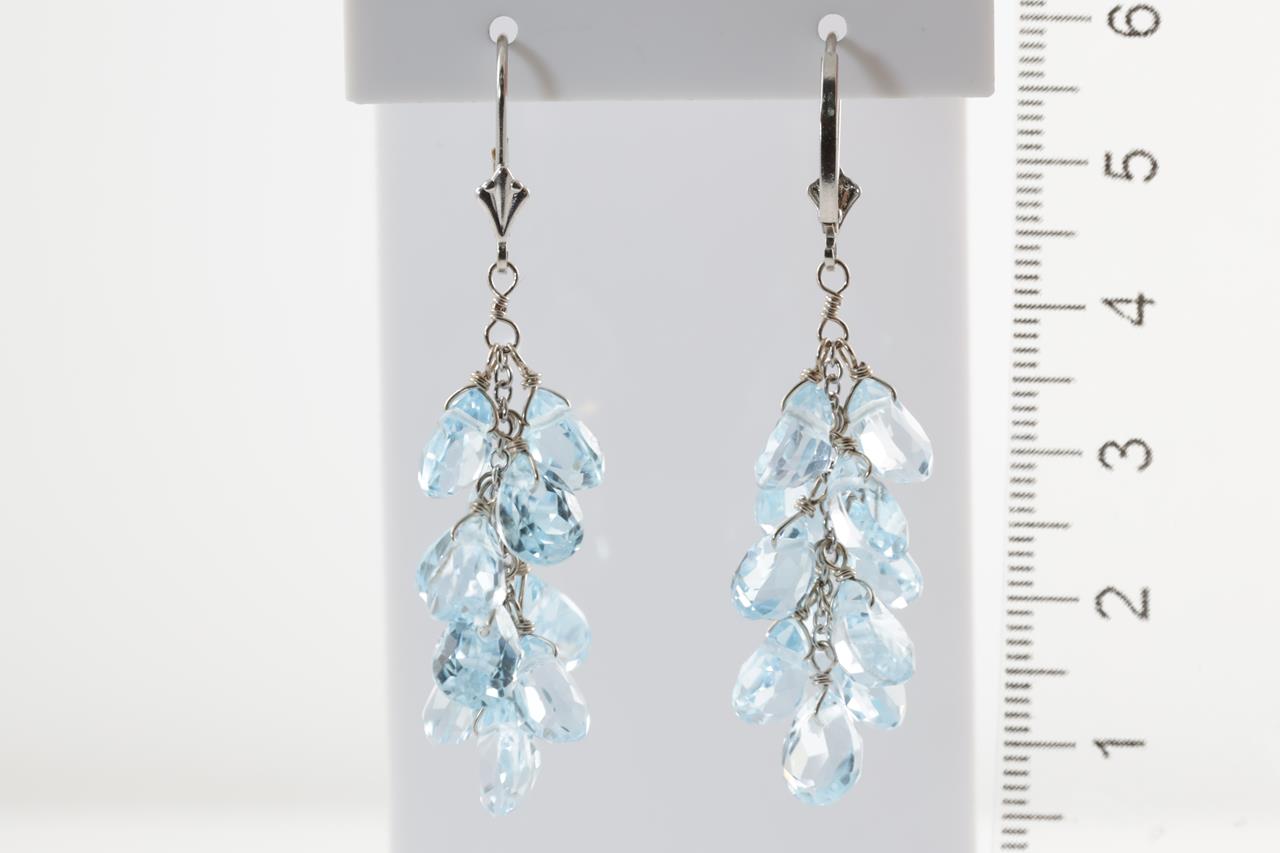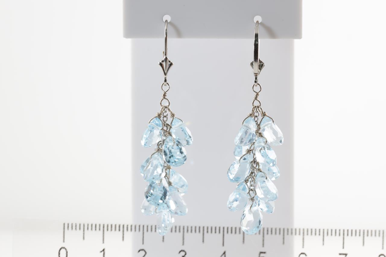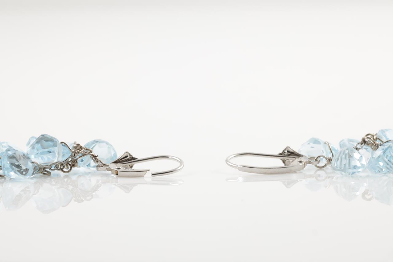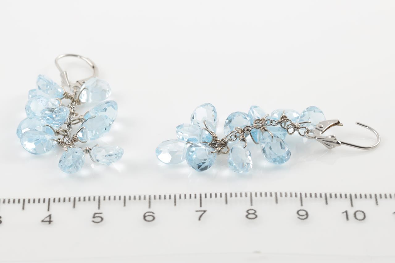 Topaz Leverback Earrings with fancy cut blue Topaz totalling approximately 35.30cts. 14ct white gold. Weight 9.1g. Damaged clasp. (Pre-owned)