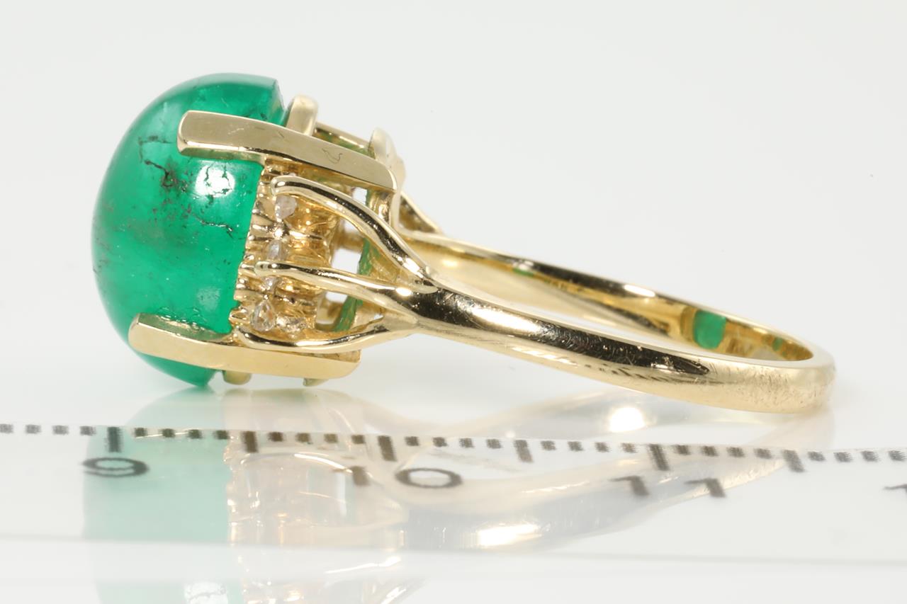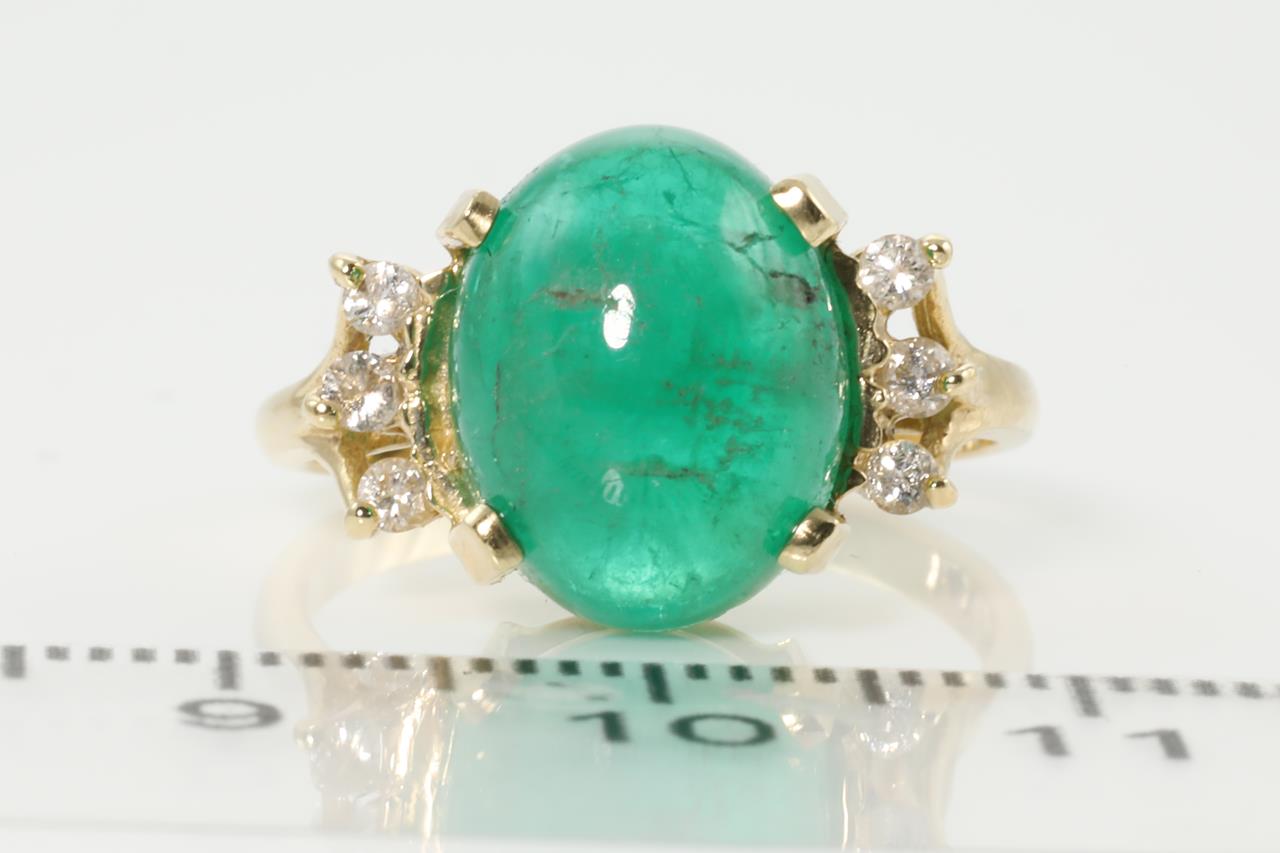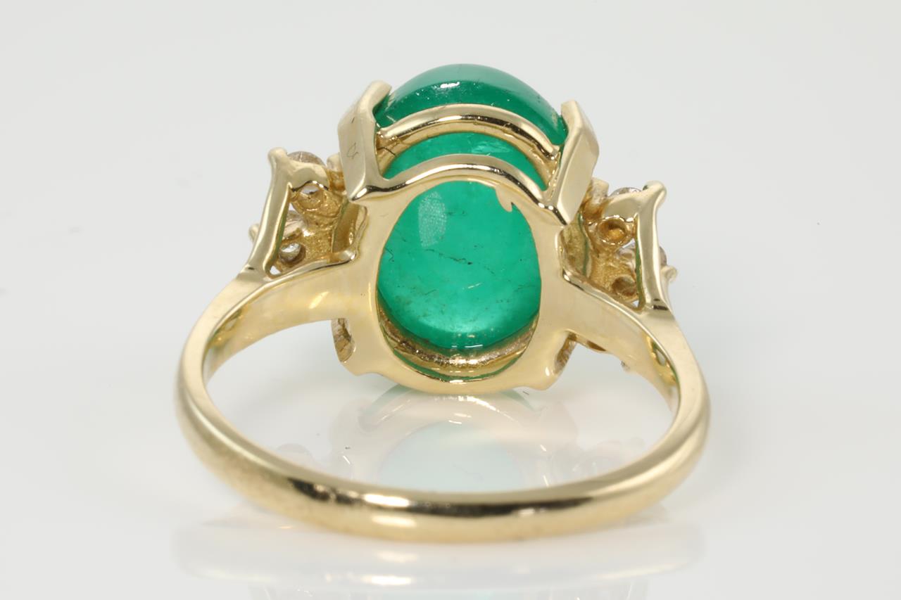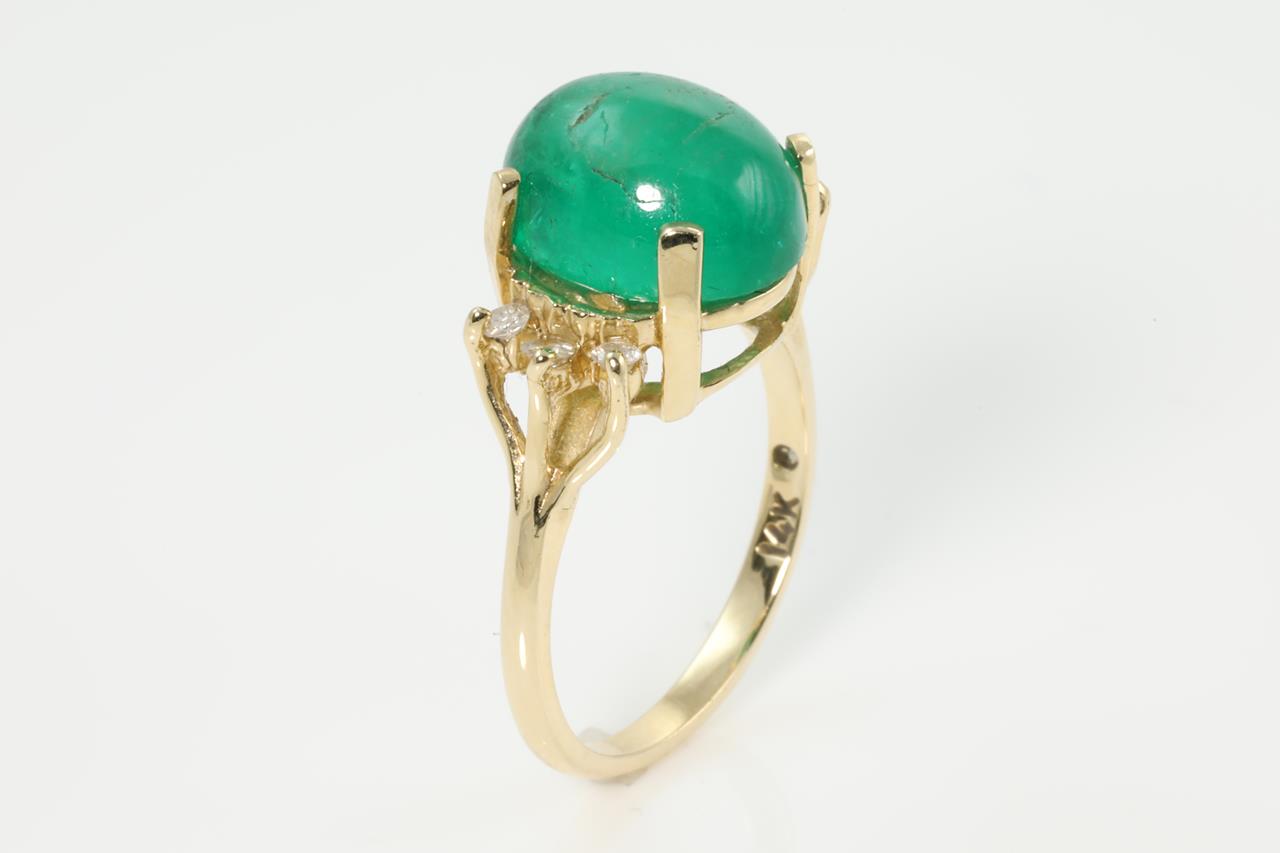 Emerald and Diamond ring with an oval cabochon cut Emerald of 3.55ct (note surface reaching inclusions) and Diamonds totalling 0.09cts. 14ct yellow gold. Ring size N. Weight: 4.7g (Pre-owned)