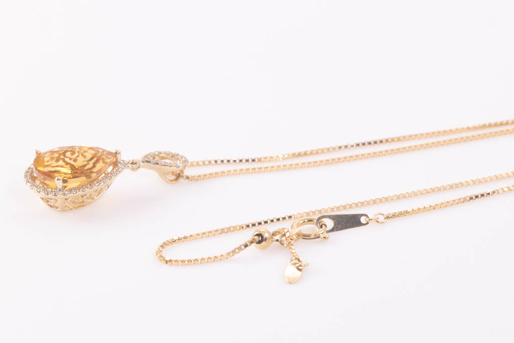 Citrine and Diamond pendant with pear checkerboard cut Citrine of 3.56ct and round Diamonds totalling 0.20cts. 14ct yellow gold with 18ct yellow gold adjustable 45cm chain. Weight: 4.3g. (New).