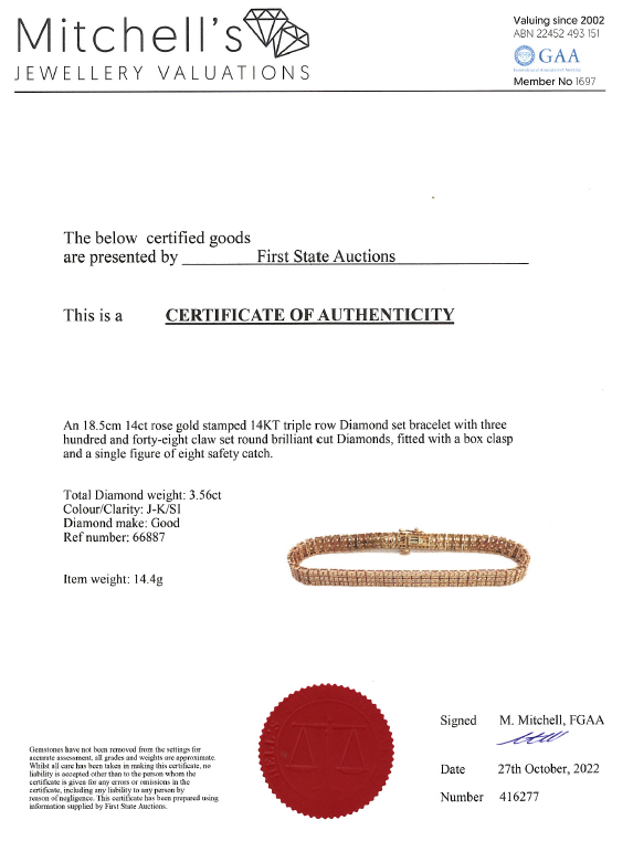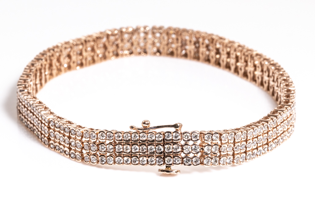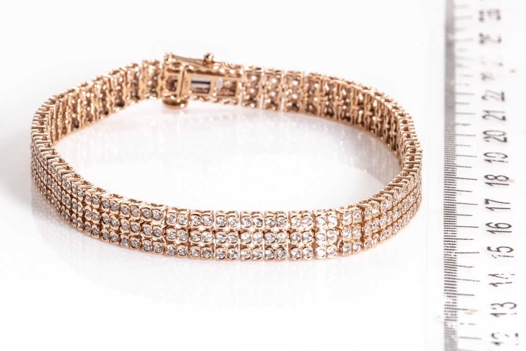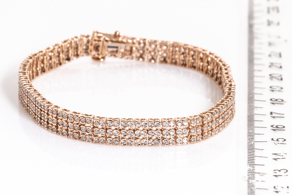 Diamond bracelet with 3 rows 0f 348 round Diamonds totalling 3.56cts (Estimated grading: J-K SI). 14ct rose gold. Length: 18.5cm. Weight: 14.4g. With Certificate #416277. (New)