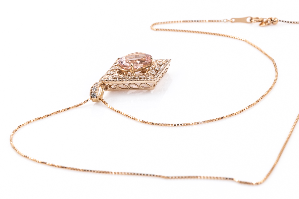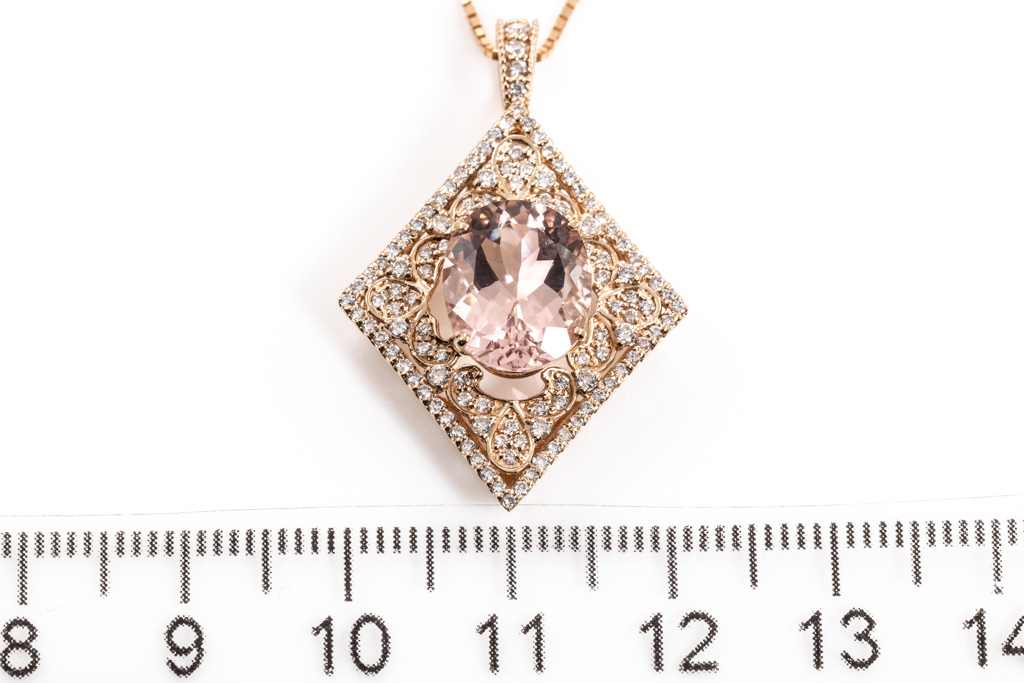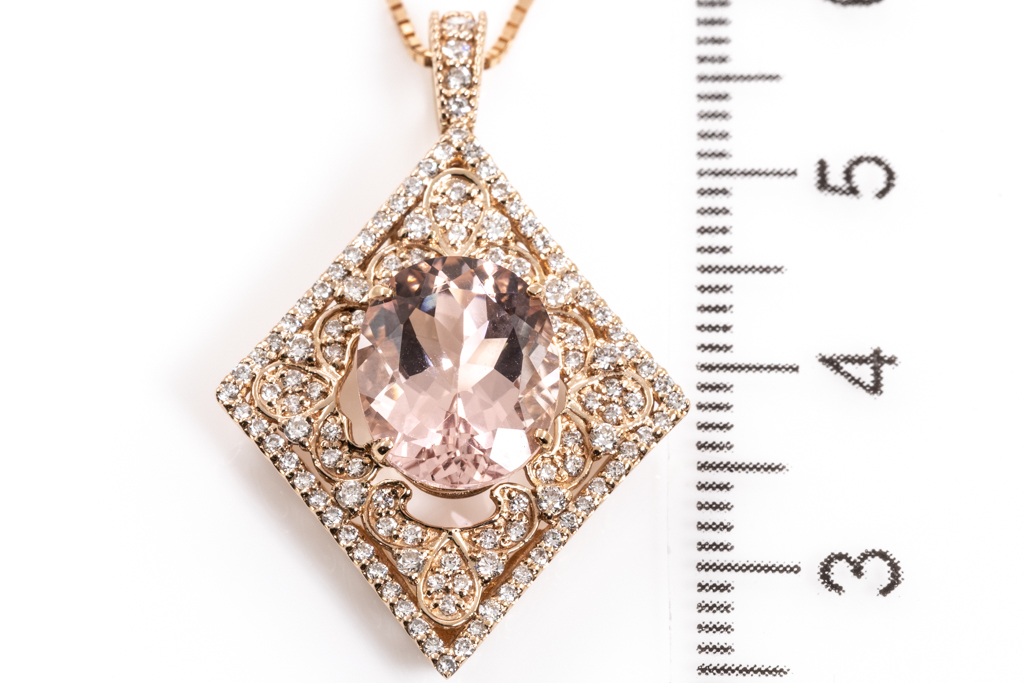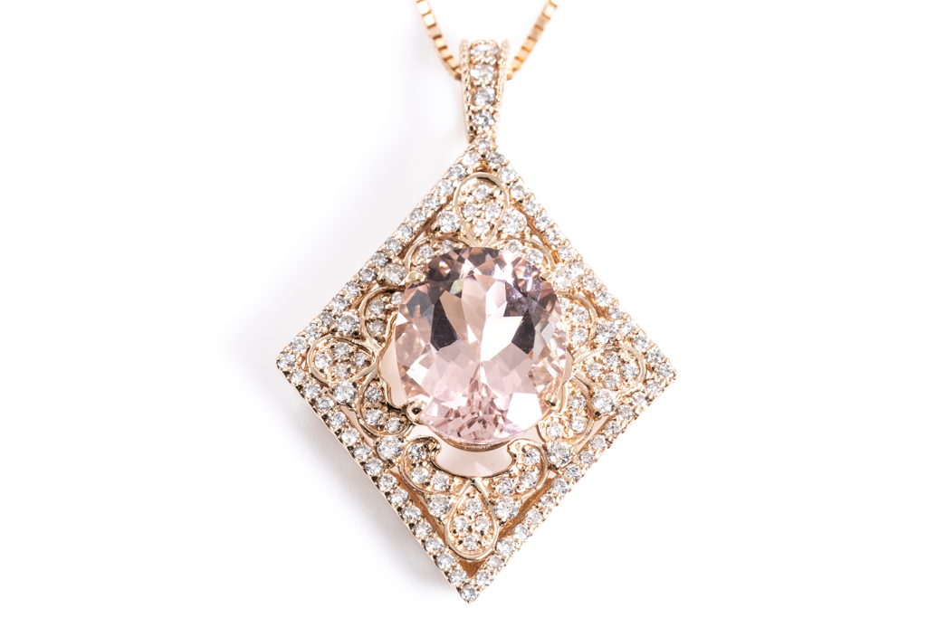 Morganite and Diamond pendant with Morganite of 3.56ct and round Diamonds totalling 0.56cts (Estimated grading: J-K SI). 18ct rose gold with 18ct rose gold 44cm adjustable chain. Weight: 6.4g. (Pre-owned)