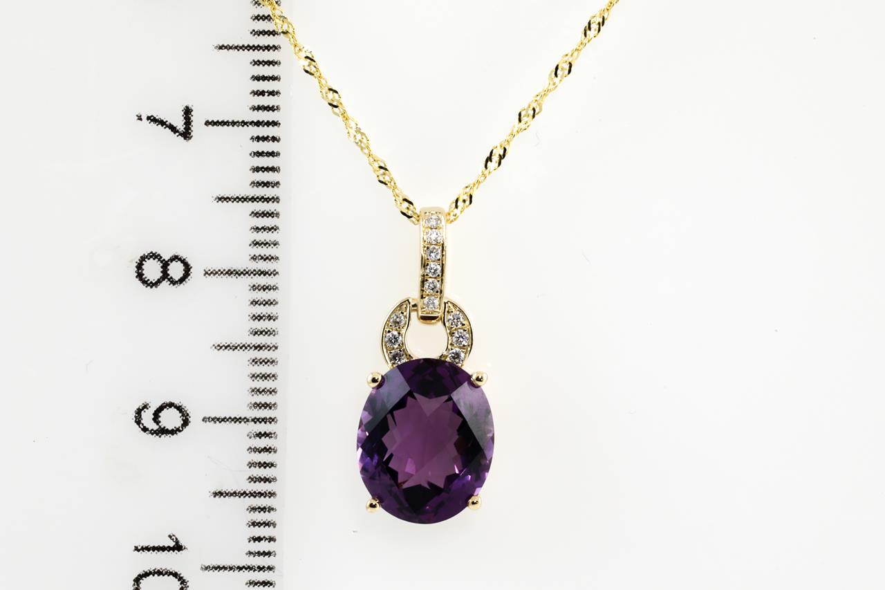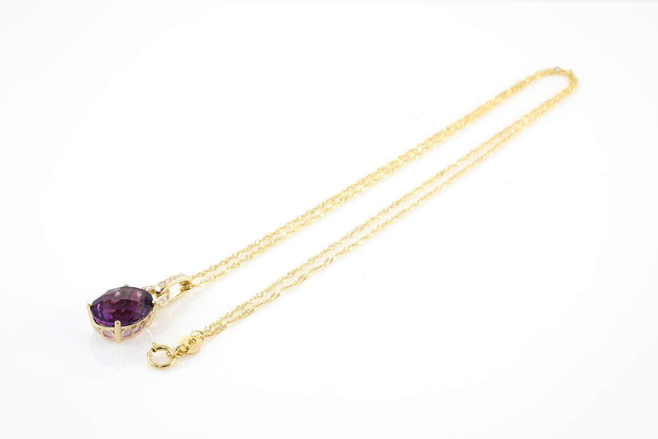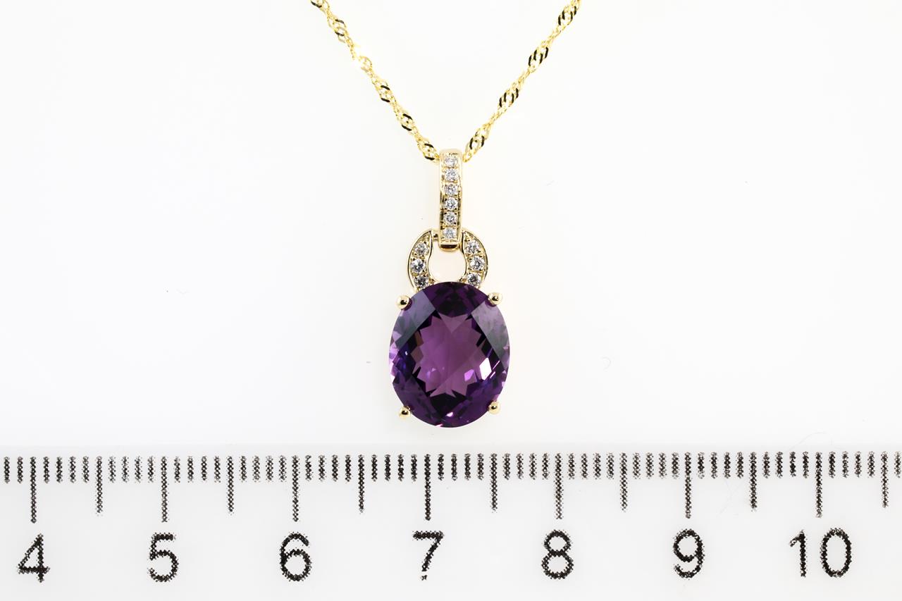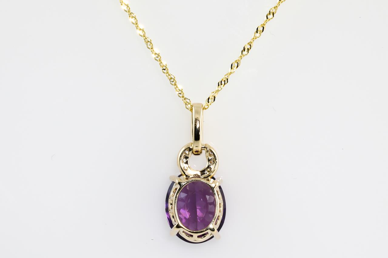 Amethyst and Diamond pendant with oval shape Amethyst of 3.57ct and Diamonds totalling 0.06cts. 14ct Yellow gold with 18ct gold 45cm chain. Weight: 2.7g (New)