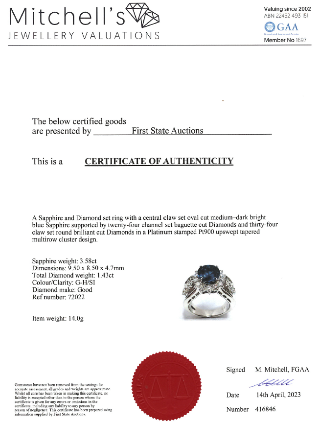 Sapphire and Diamond ring with oval shape Blue Sapphire of 3.58ct and round & baguette cut Diamonds totalling 1.43cts (Estimated grading: G-H SI). Platinum - 900. Ring size J1/2. Weight: 14.0g. With certificate #416846. (Pre-owned)