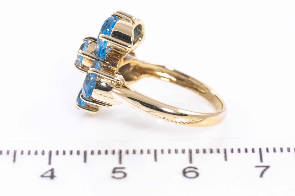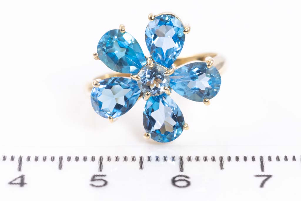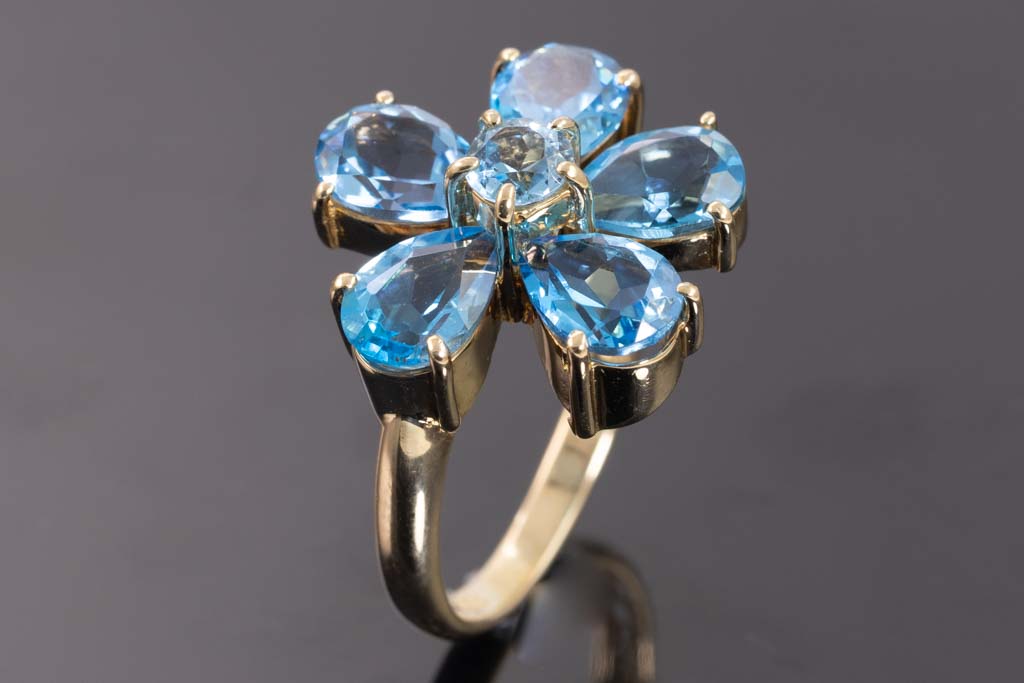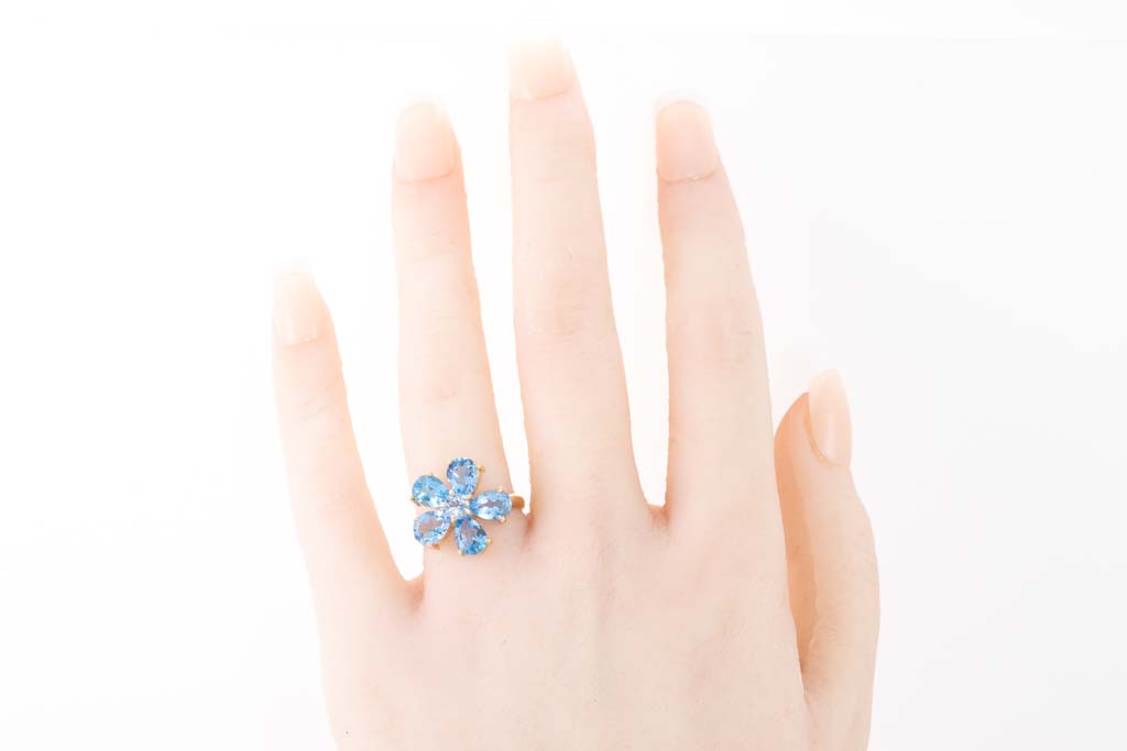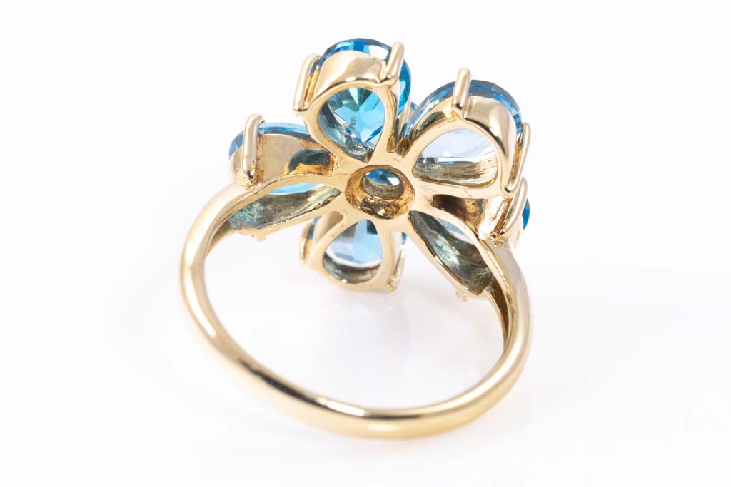 Topaz flower design ring with pear shape and round blue Topaz totalling approximately 3.58cts. 18ct yellow gold. Ring size L. Weight: 4.3g. (Pre-owned)
