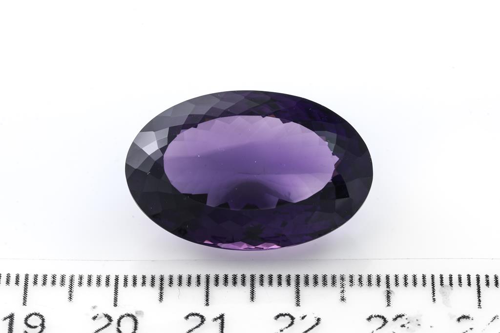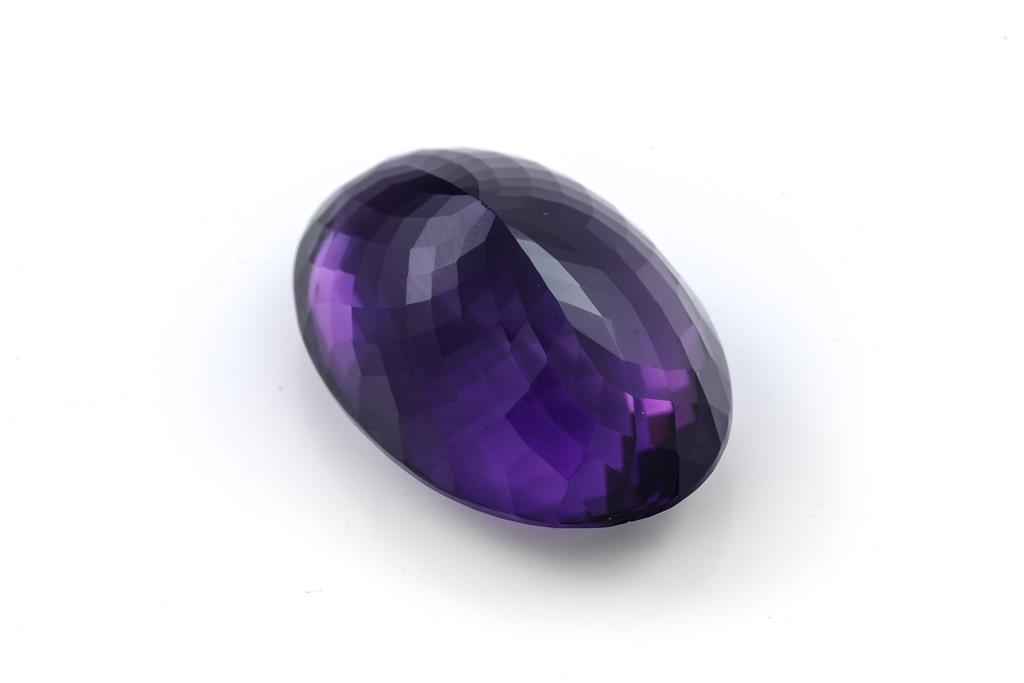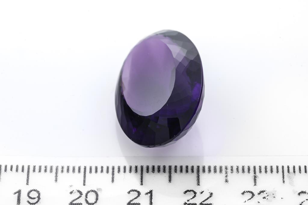 A loose oval shape Amethyst of 35.99ct. Dimensions: 27mm x 17mm x 12.2mm. (As New)
