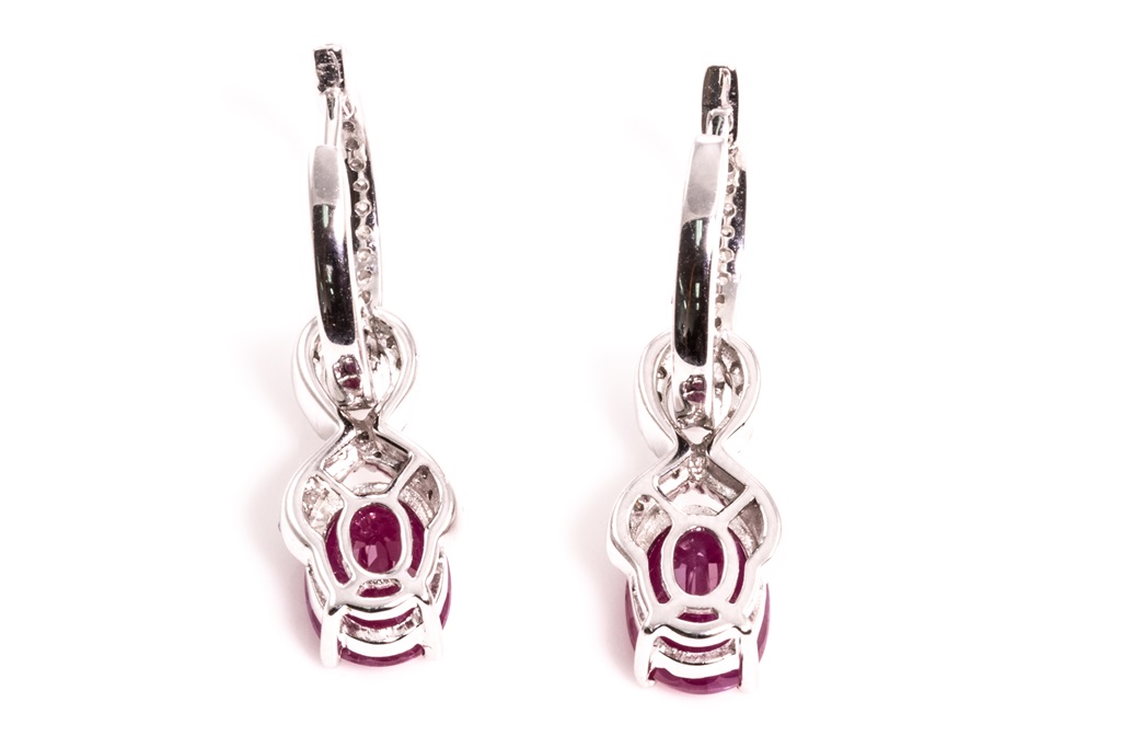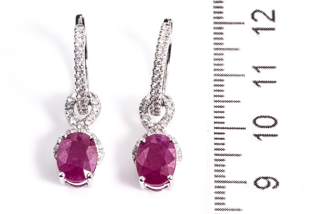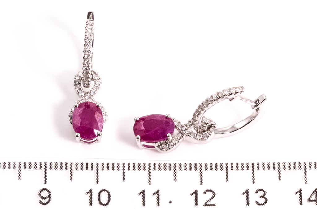 Ruby and Diamond earrings with oval shape Rubies totalling 3.60cts and round Diamonds totalling 0.38cts (Estimated grading: H SI-P1). 14ct white gold. Weight: 4.8g. (AS new)
