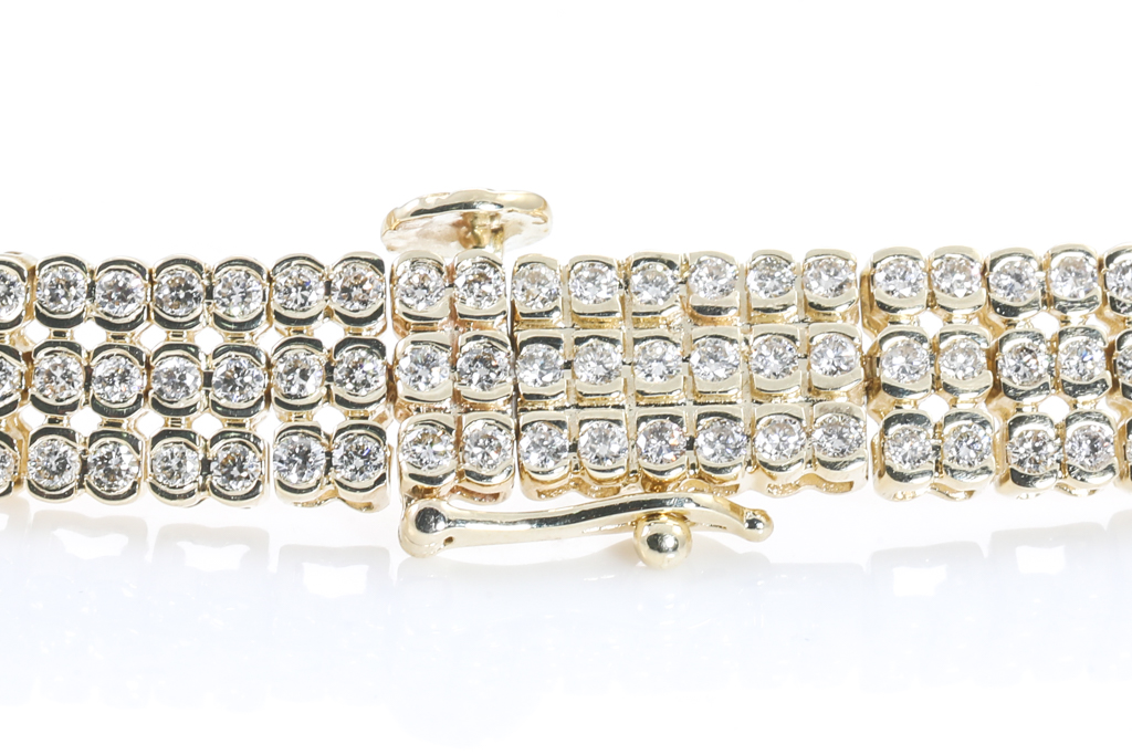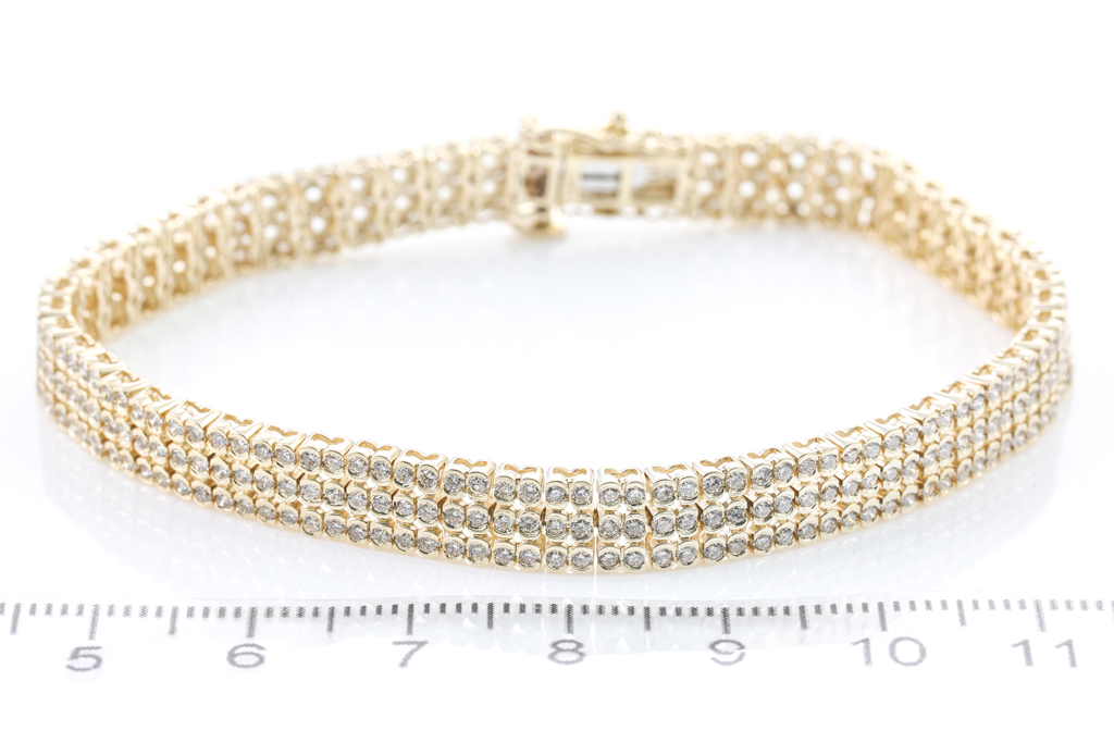Diamond bracelet with 3 rows of 348 round Diamonds totalling 3.61cts (Estimated grading: J-K SI). 14ct yellow gold. Length: 18.5cm. Weight: 13.9g. With Certificate #416276. (New)