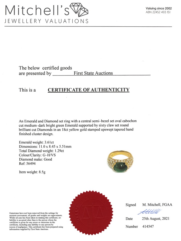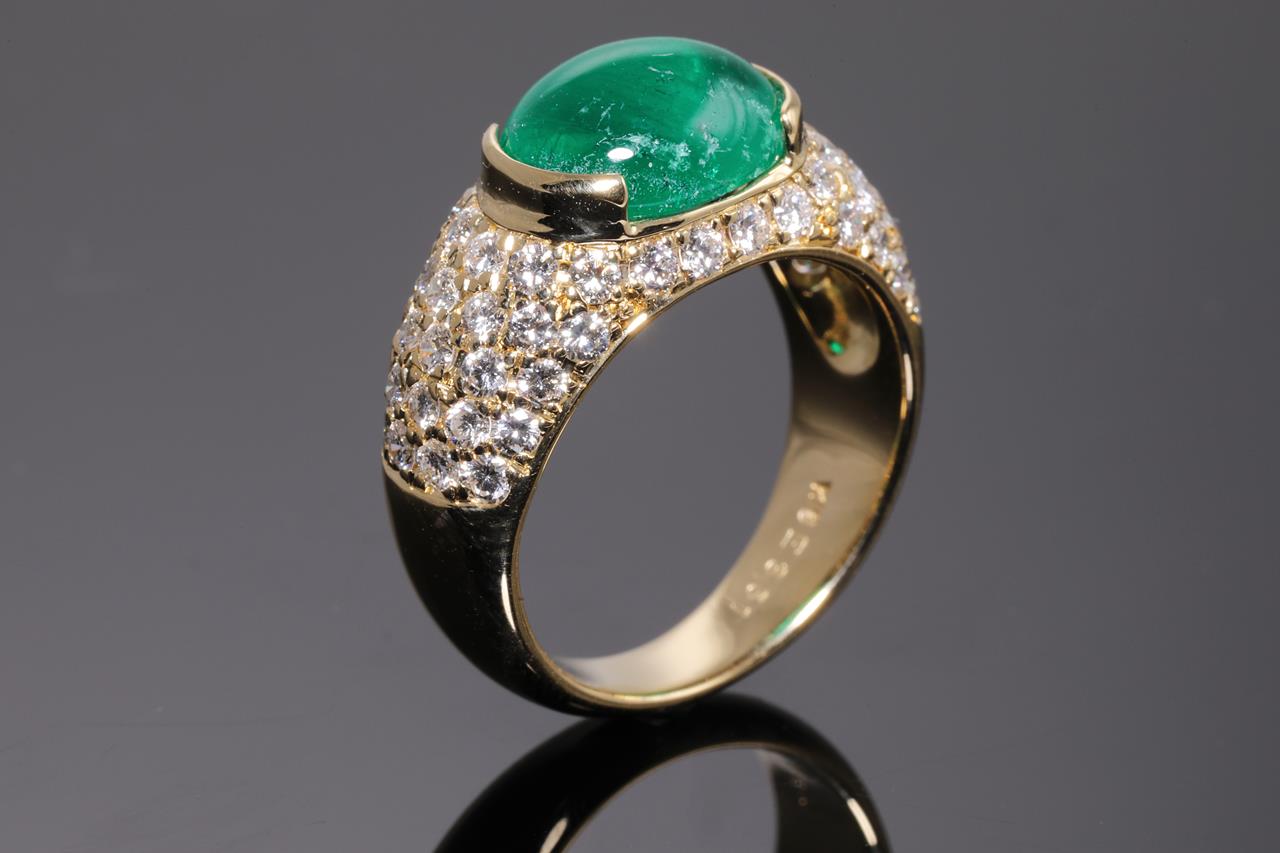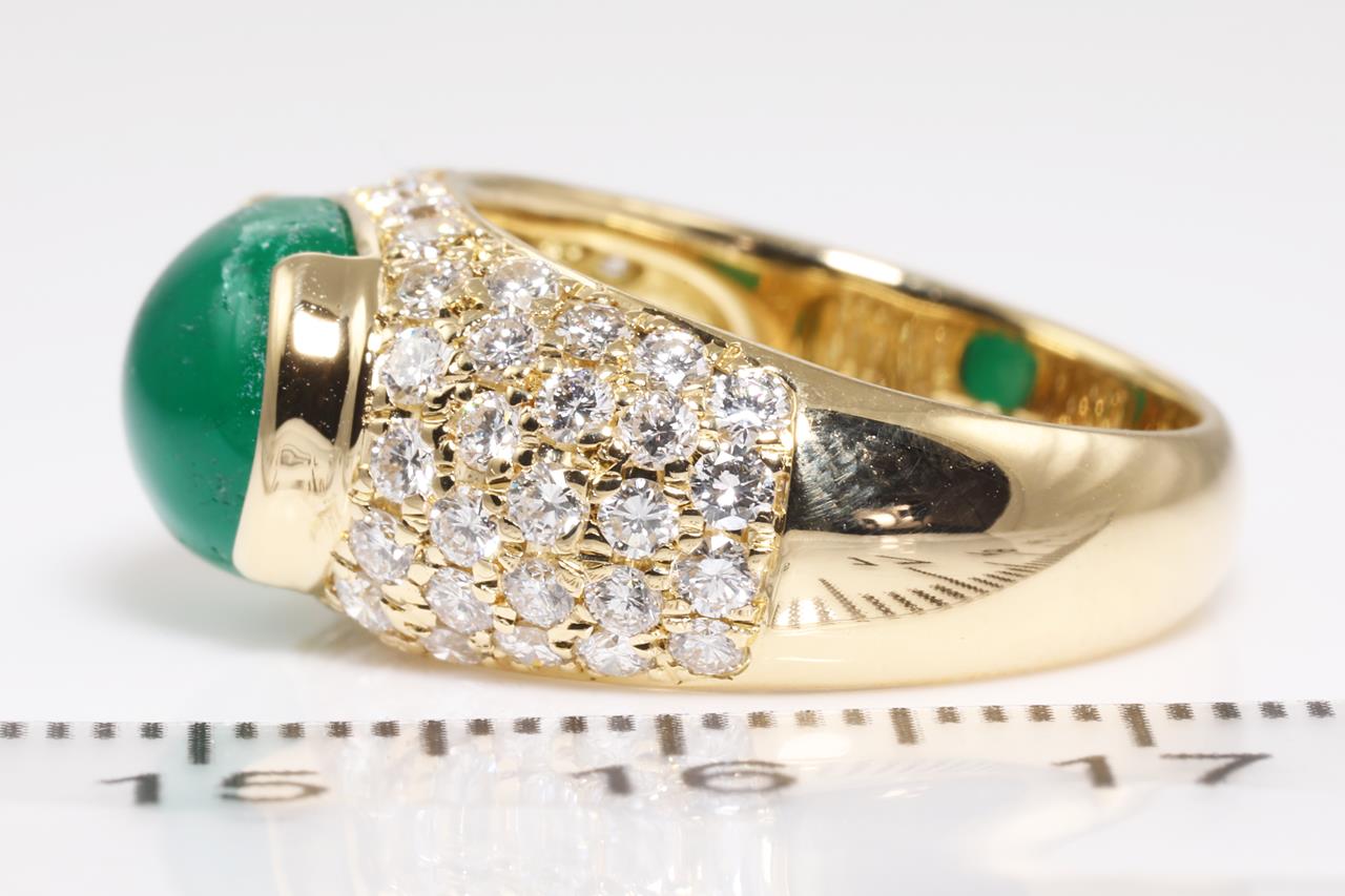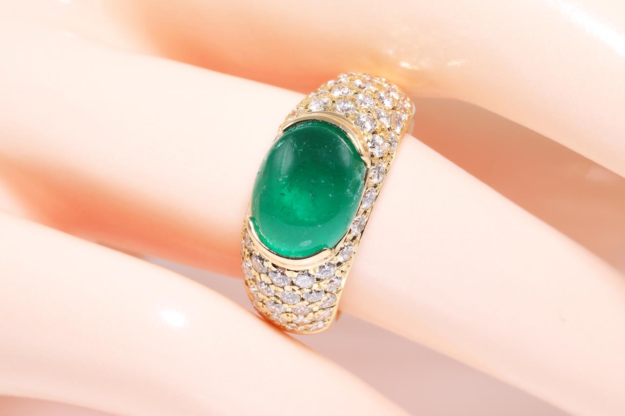 Emerald and Diamond ring with an oval cabochon cut Emerald of 3.61ct and round Diamonds totalling 1.29cts (Estimated grading: G-H VS). 18ct yellow gold. Ring size L1/2 - ring resizing is not recommended. Weight: 8.5g. With certificate #414547. (Pre-owned)