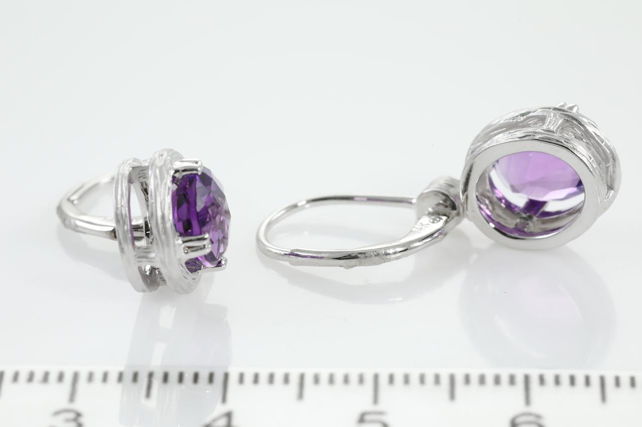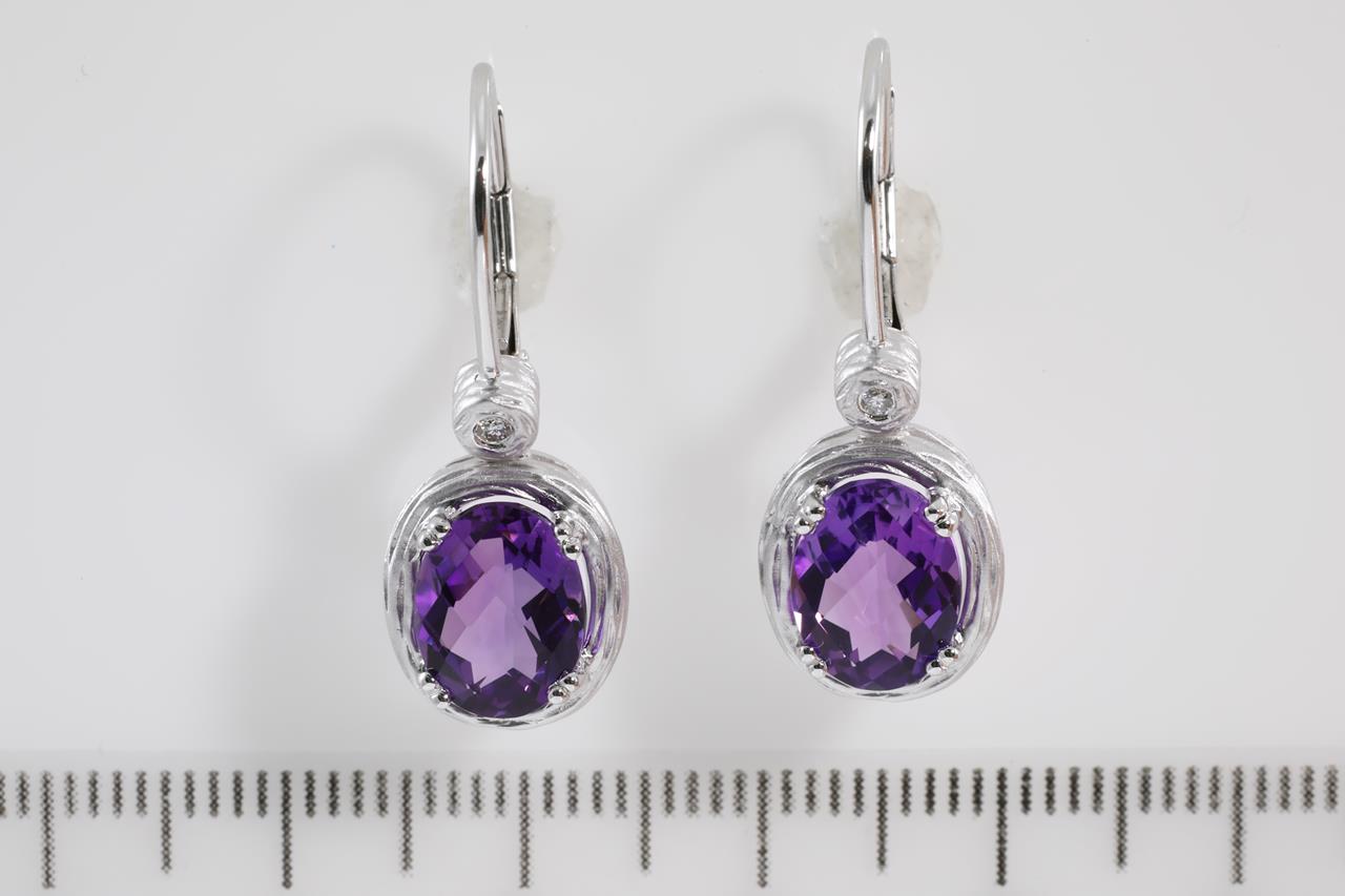 Amethyst and Diamond hinged back earrings with oval checkerboard cut Amethyst totalling 3.64cts and Diamonds totalling 0.03cts. 14ct white gold. Weight: 5.4g. (New)