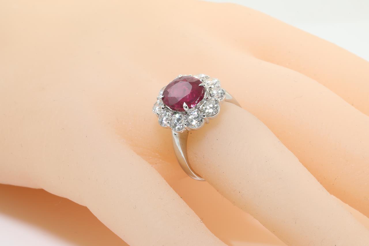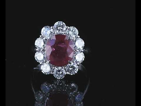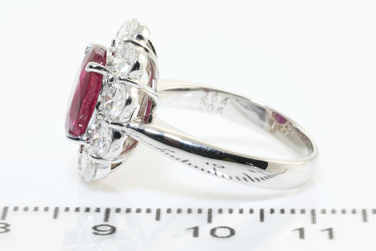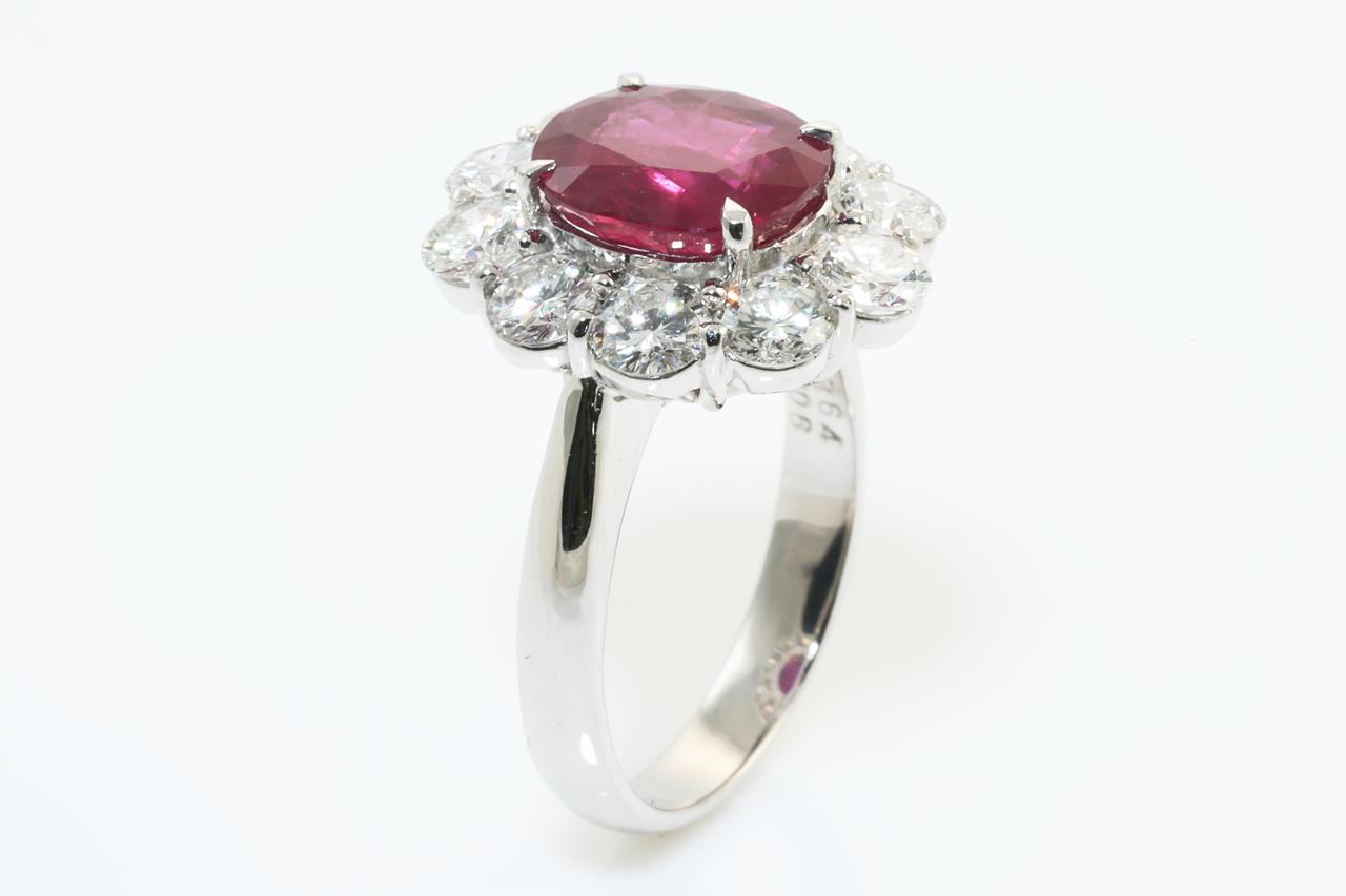 Ruby and Diamond ring with oval shape Thai Ruby of 3.64ct (with GRS Report #GRS2015-099387) and Diamonds totalling 2.06cts (Estimated grading: G VS-SI). Platinum. Ring size: M. Weight: 9.0g (Pre-owned)