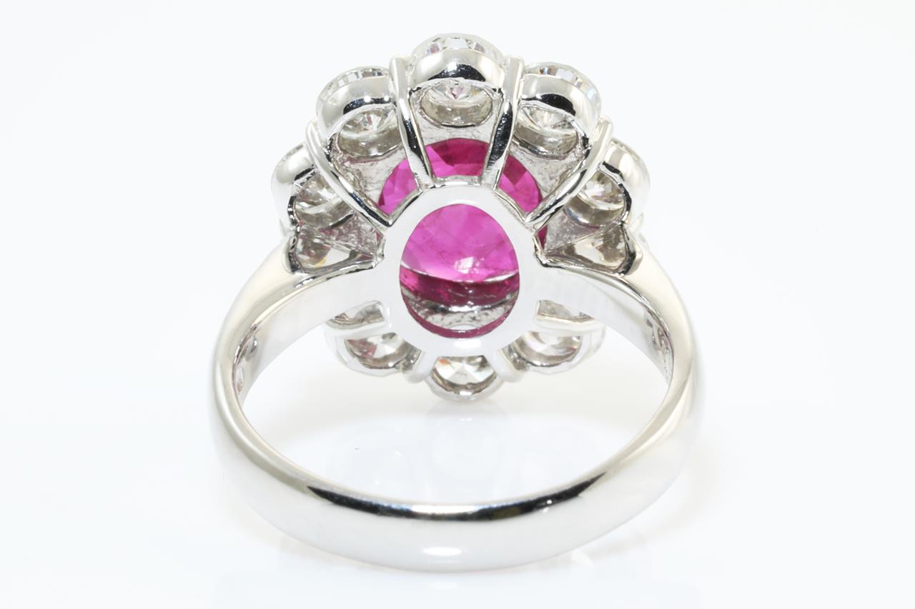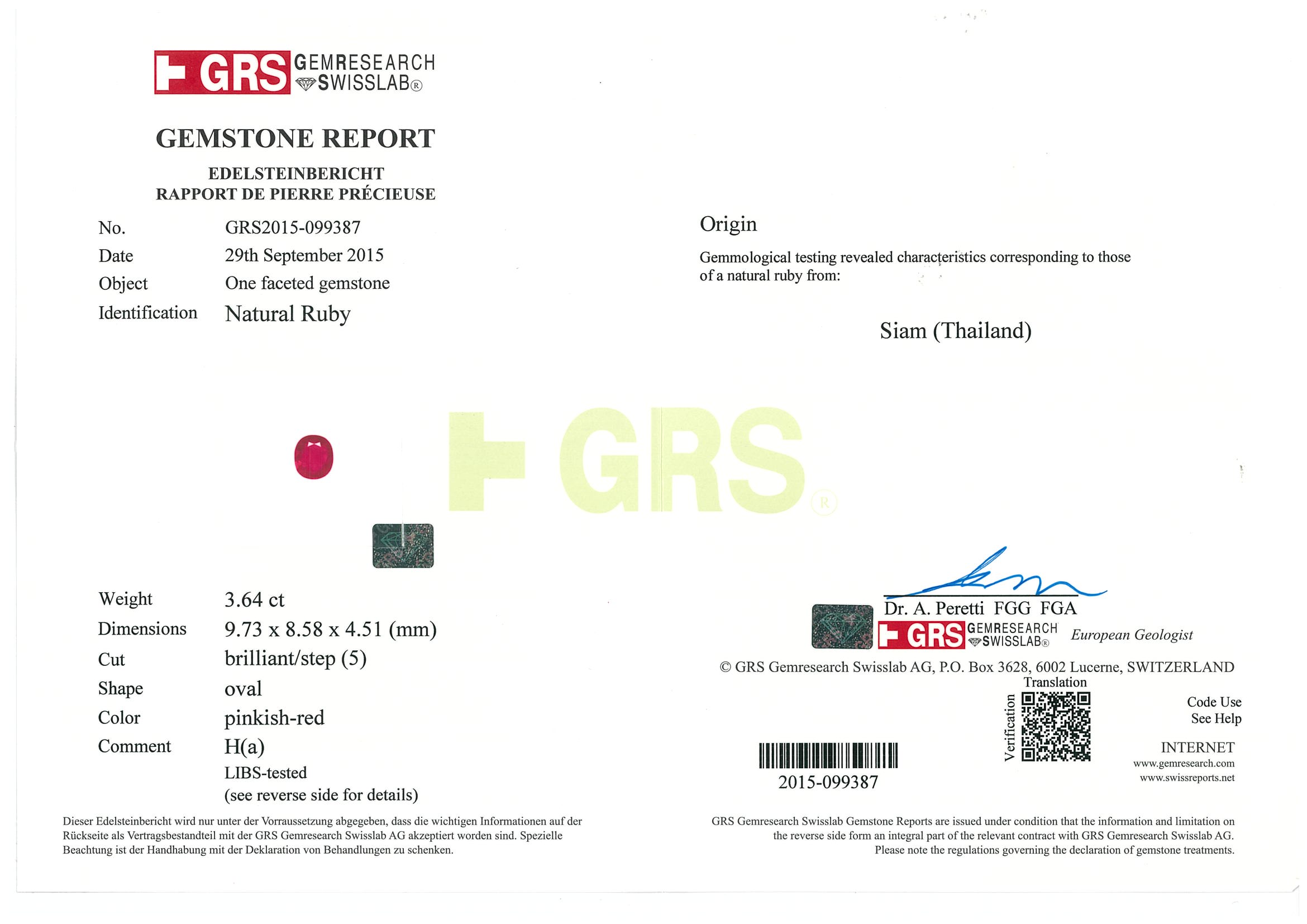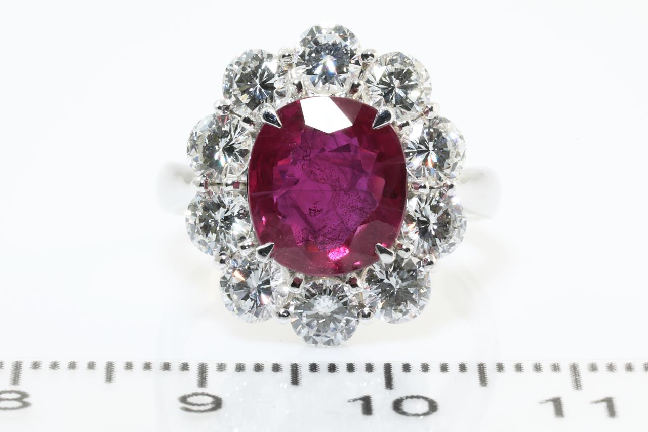 Ruby and Diamond ring with oval shape Thai Ruby of 3.64ct (with GRS Report #GRS2015-099387) and Diamonds totalling 2.06cts (Estimated grading: G VS-SI). Platinum. Ring size: M. Weight: 9.0g (Pre-owned)
