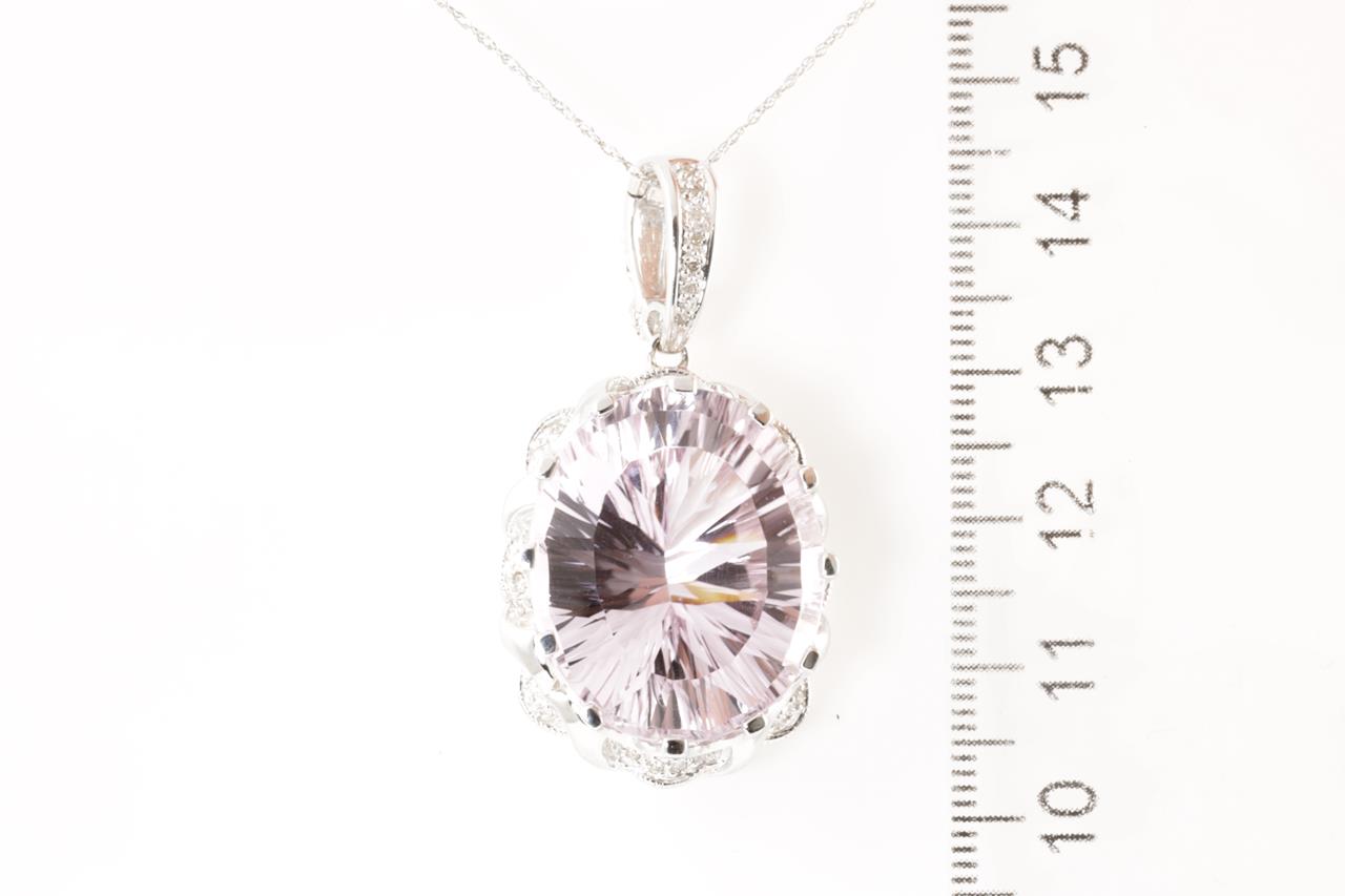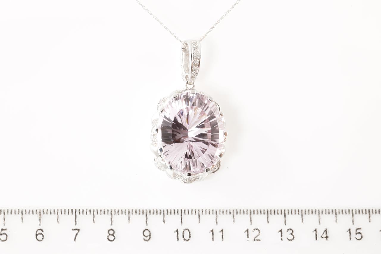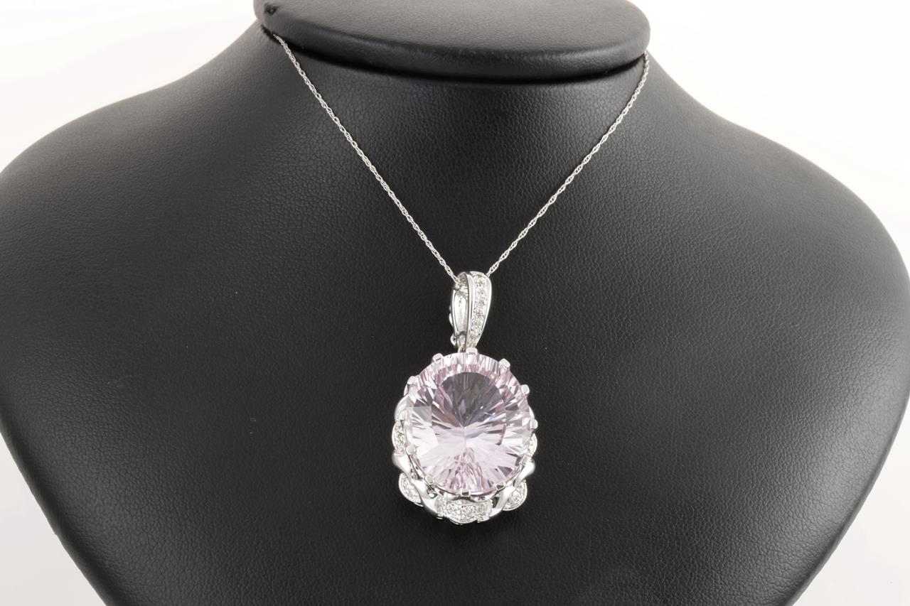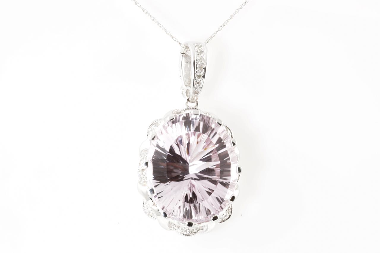 Quartz and Diamond pendant with an oval pink Quartz of approximately 36.52ct and round Diamonds totalling approximately 0.14cts. 14ct white gold with 14ct gold 45.5cm chain. Weight 14.4g. (Pre-owned)