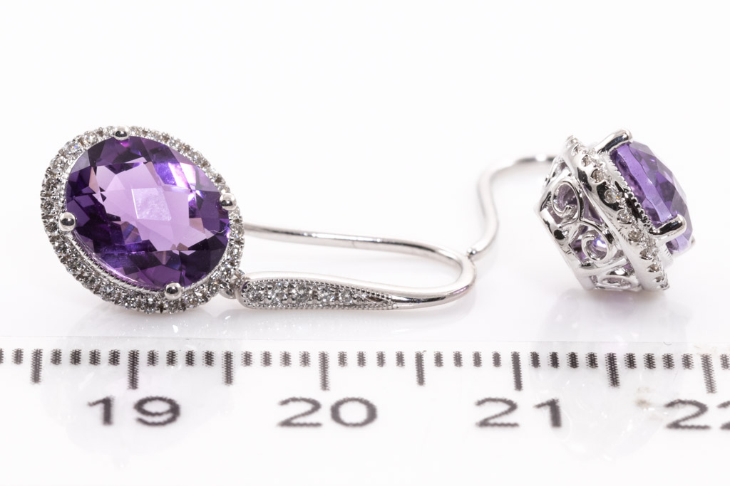 Amethyst and Diamond shepherds hook earrings with oval shape checkerboard cut Amethysts totalling 3.65cts and round Diamonds totalling 0.27cts. 14ct white gold. Weight: 3.5g. (New)