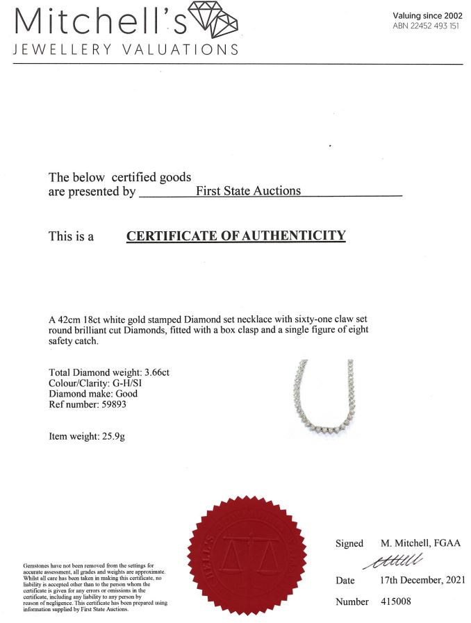 Diamond necklace with 61 round Diamonds totalling approximately 3.66cts (Estimated Grading: G-H SI). 18ct white gold. Length 42cm. Weight 25.9g. With Certificate #415008. (Pre-owned)