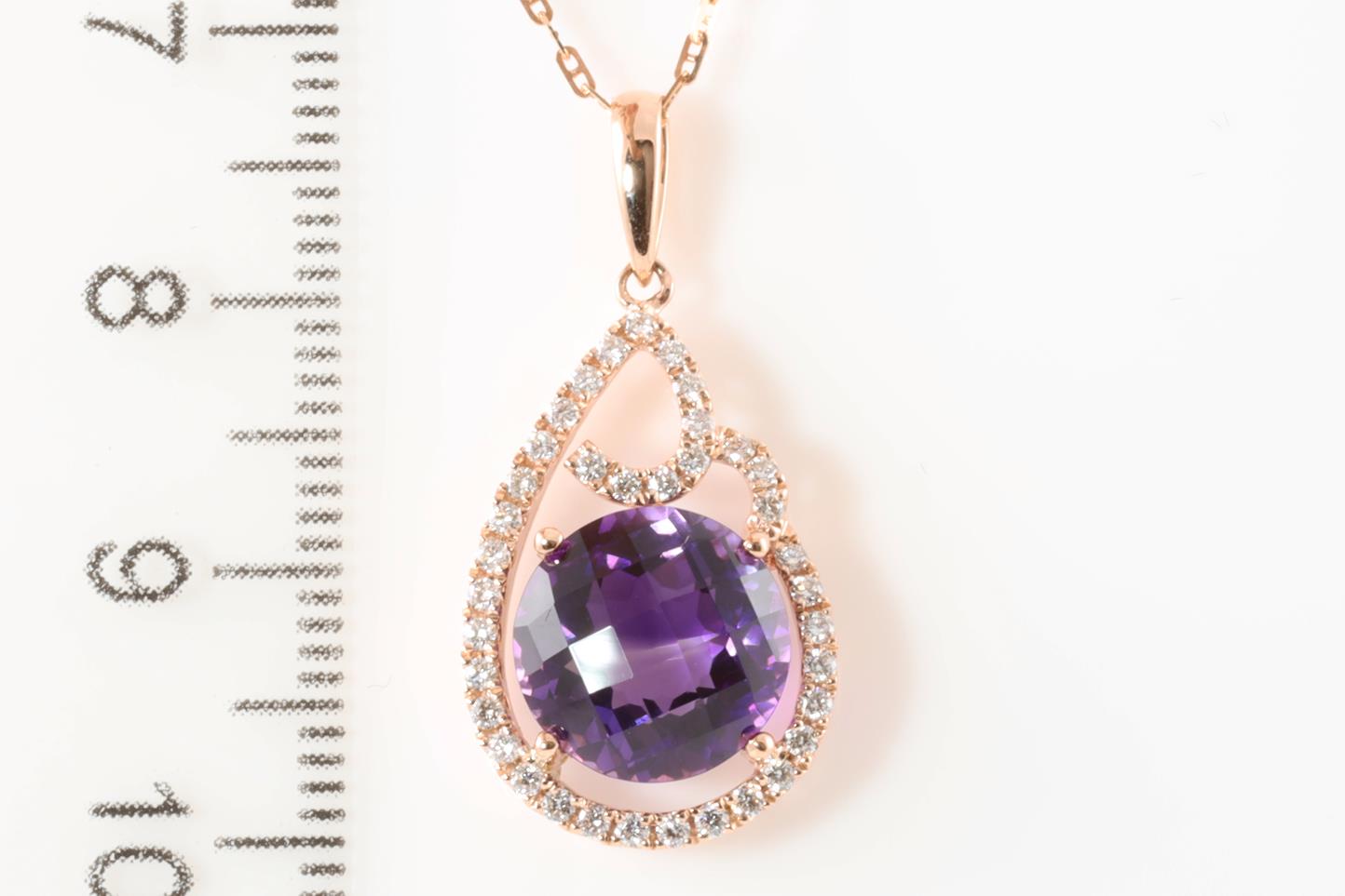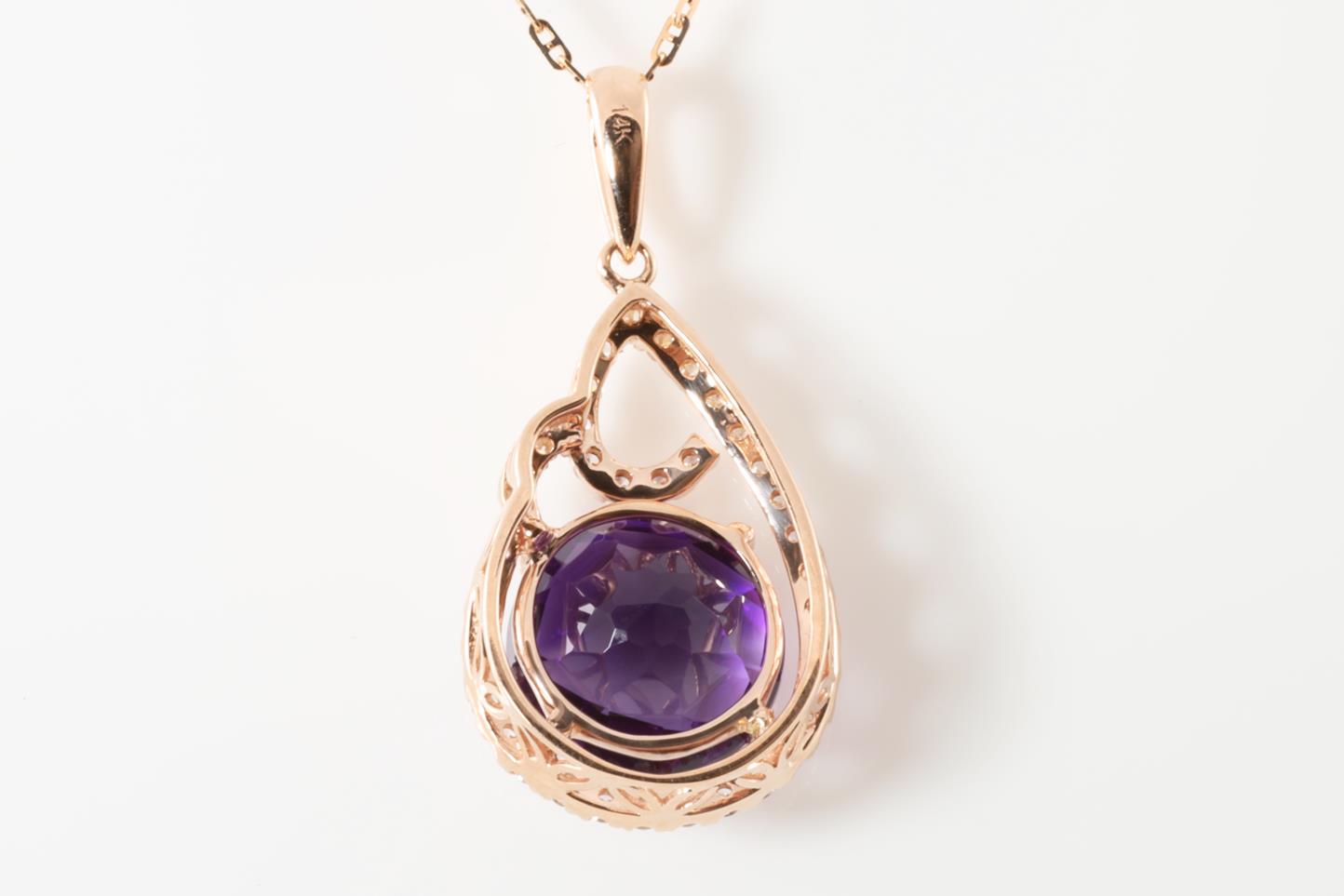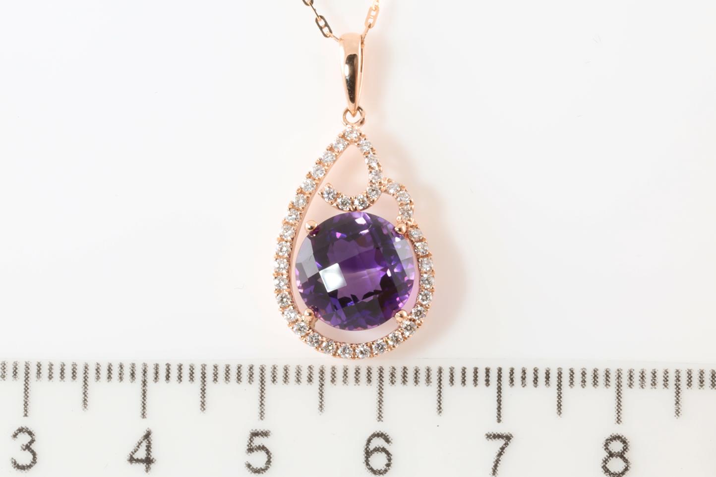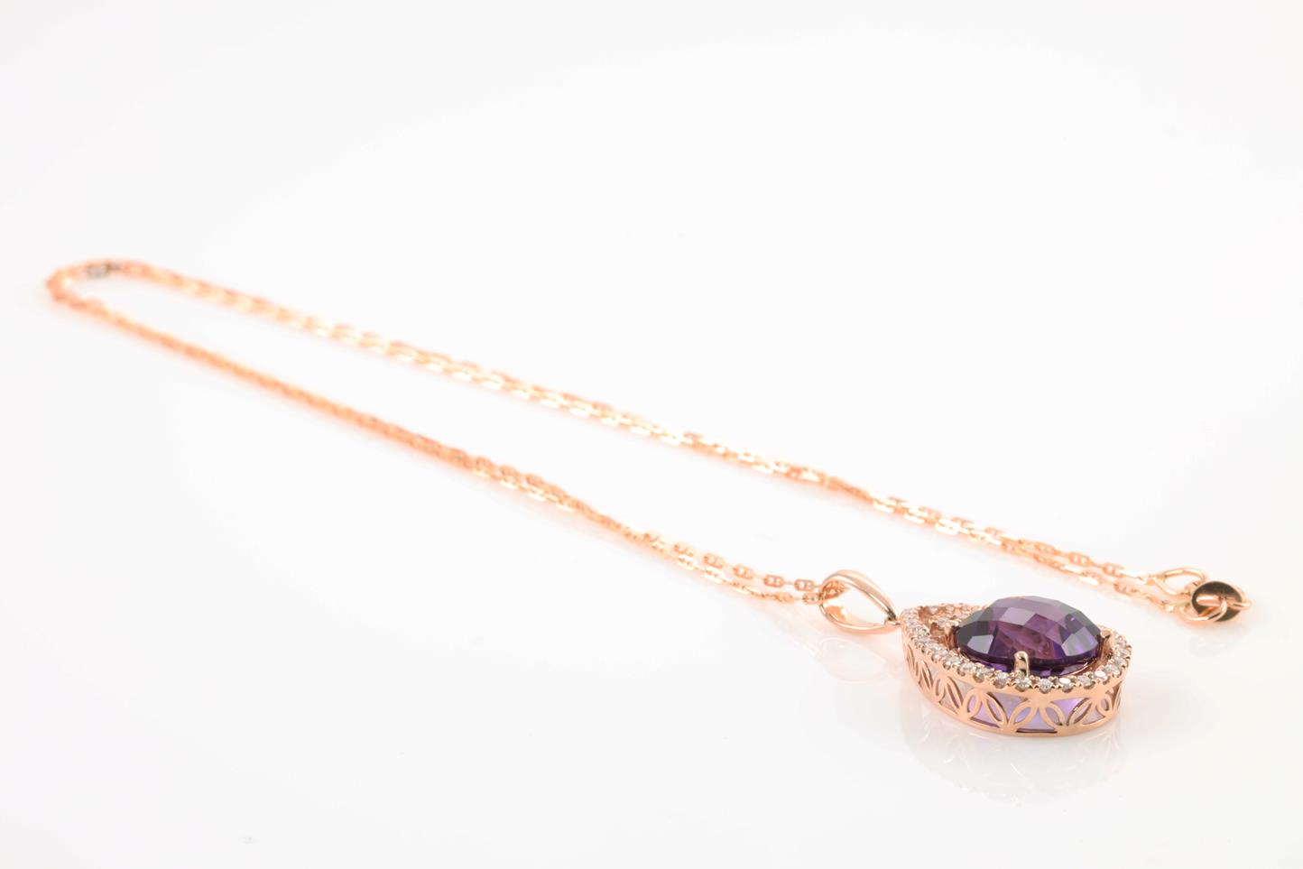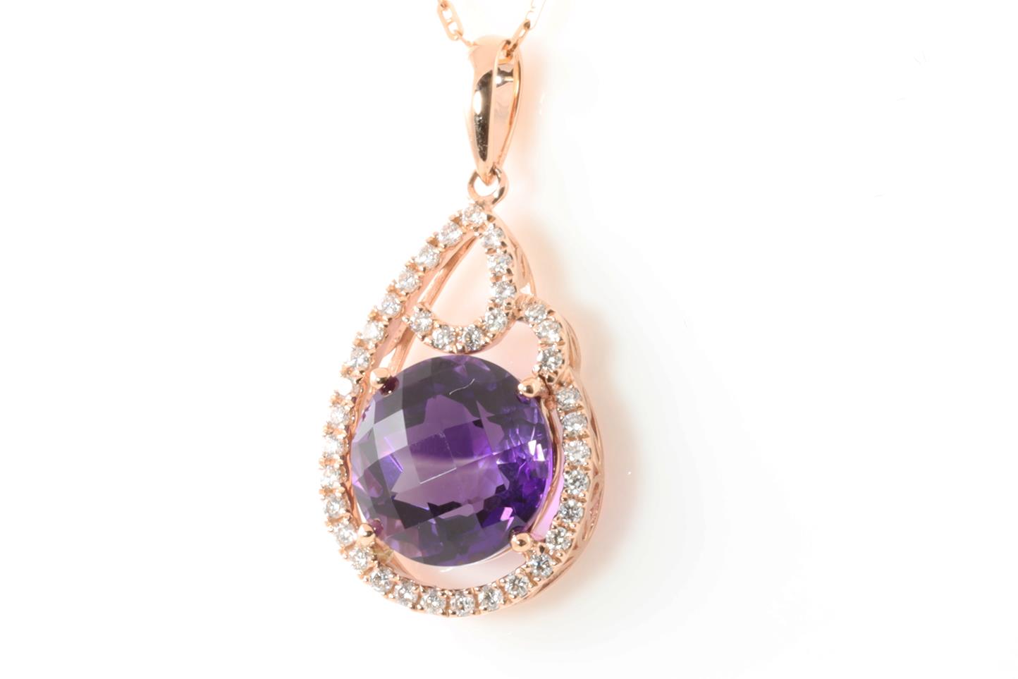 Amethyst and Diamond pendant with round Amethyst of 3.67ct and Diamonds totalling 0.28cts. 14ct rose gold with rose gold 45cm chain. Weigth: 4.3g (New)