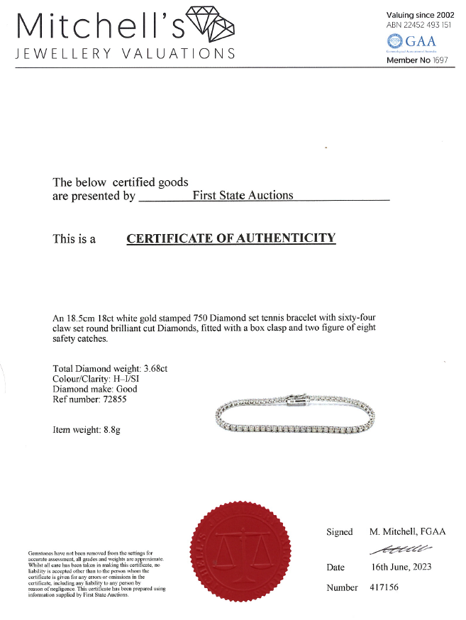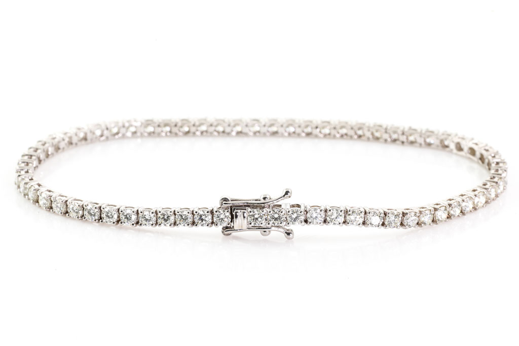 Diamond tennis bracelet with 64 round Diamonds totalling 3.68cts (Estimated grading: H-I SI). 18ct white gold. Length: 18.5cm. Weight: 8.8g. With Certificate #417156. (New)