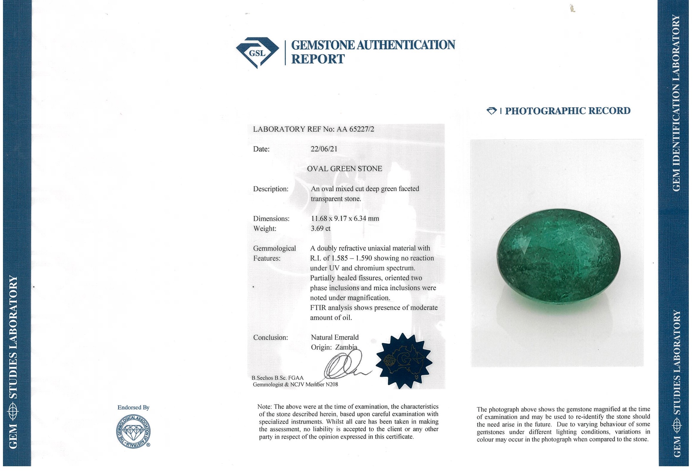 A loose oval cut Zambian Emerald of 3.69ct (with GSL Gemstone report AA 65227/2). (As New)