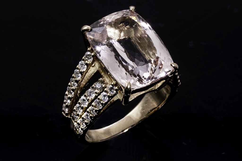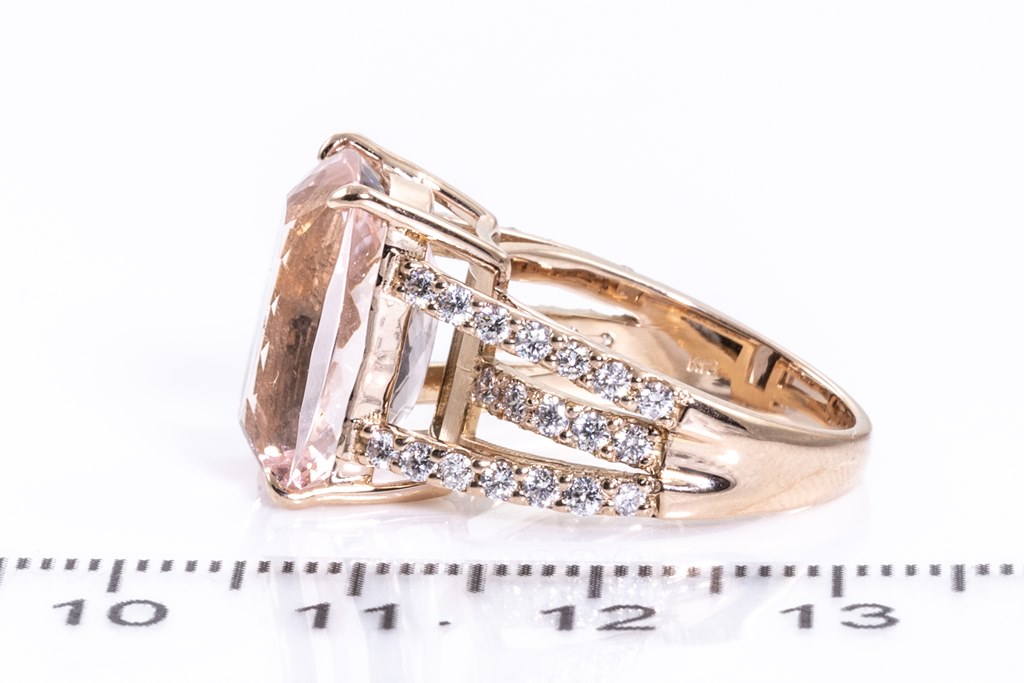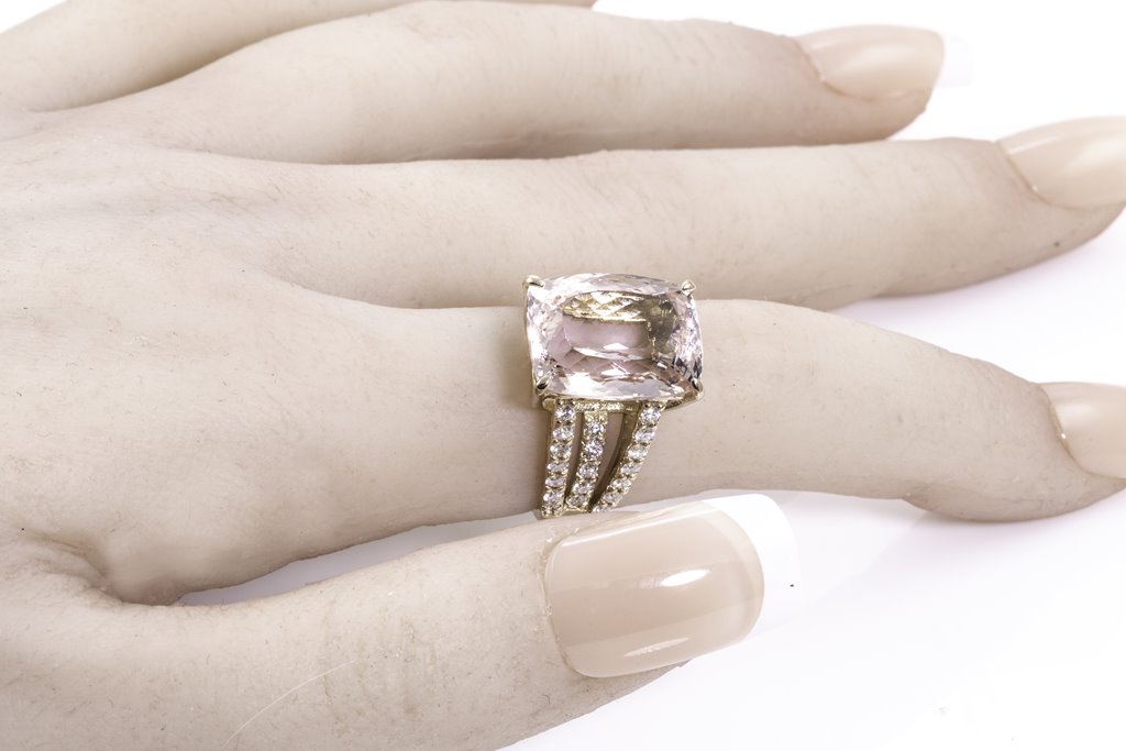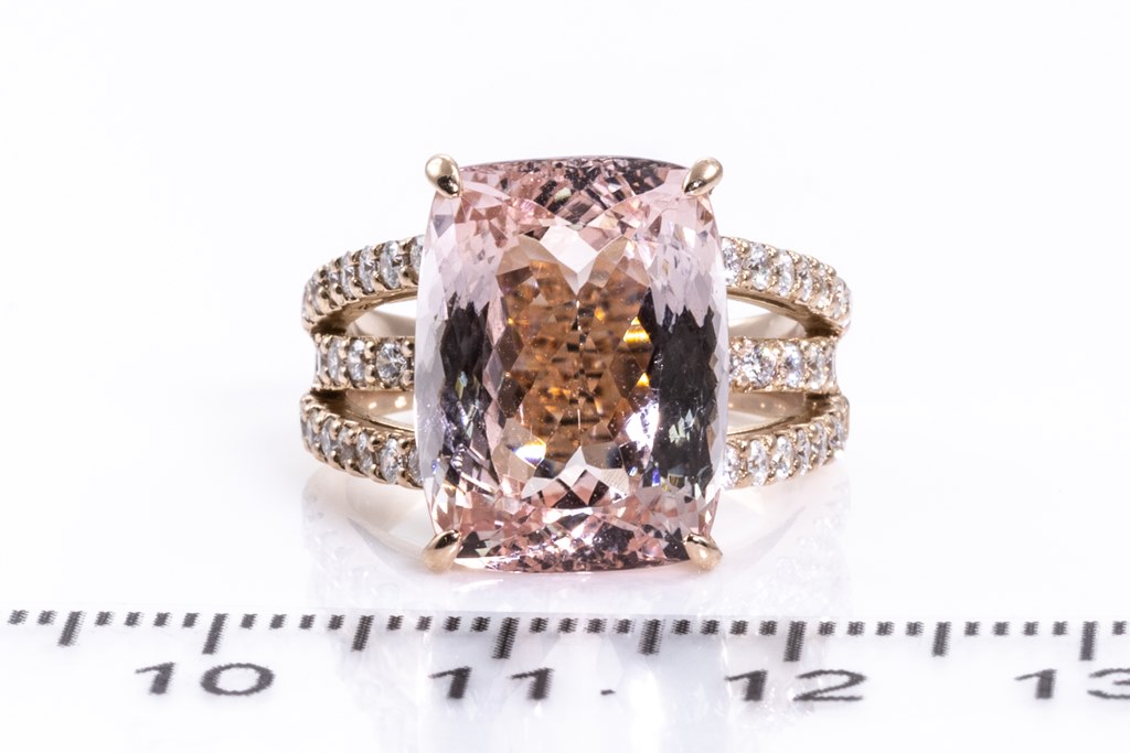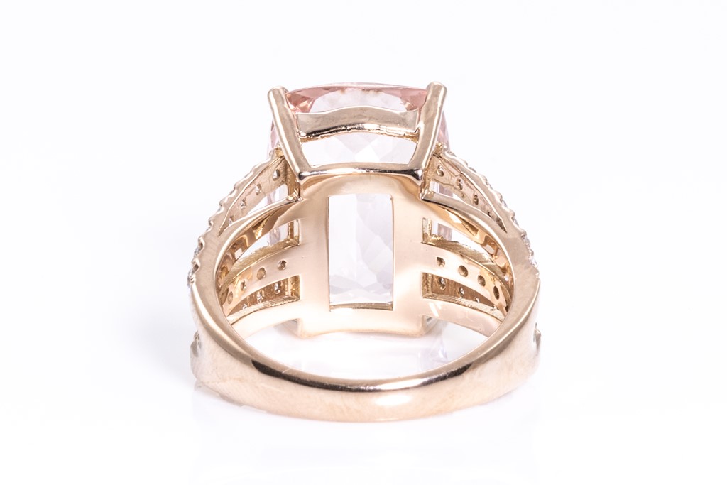 Morganite and Diamond ring with a cushion cut Morganite of 3.70ct (note very minor chip on table facet) and round Diamonds totalling 0.67cts (Estimated grading: H SI). 18ct rose gold. Ring size: L - ring resizing is not recommended. Weight: 7.6g. (Pre-owned)