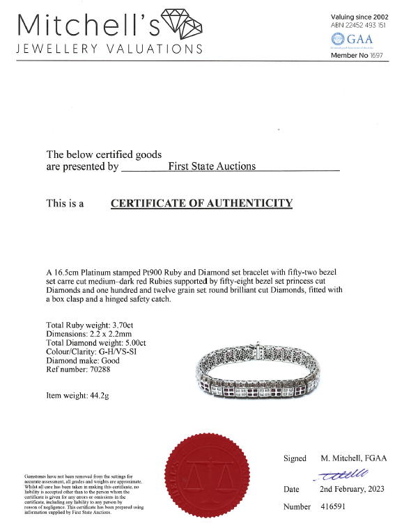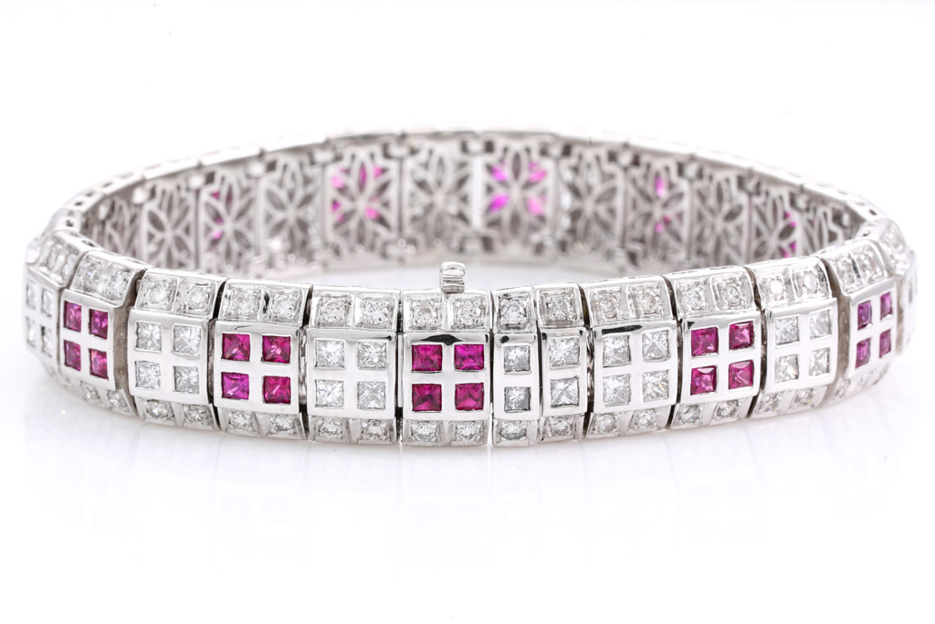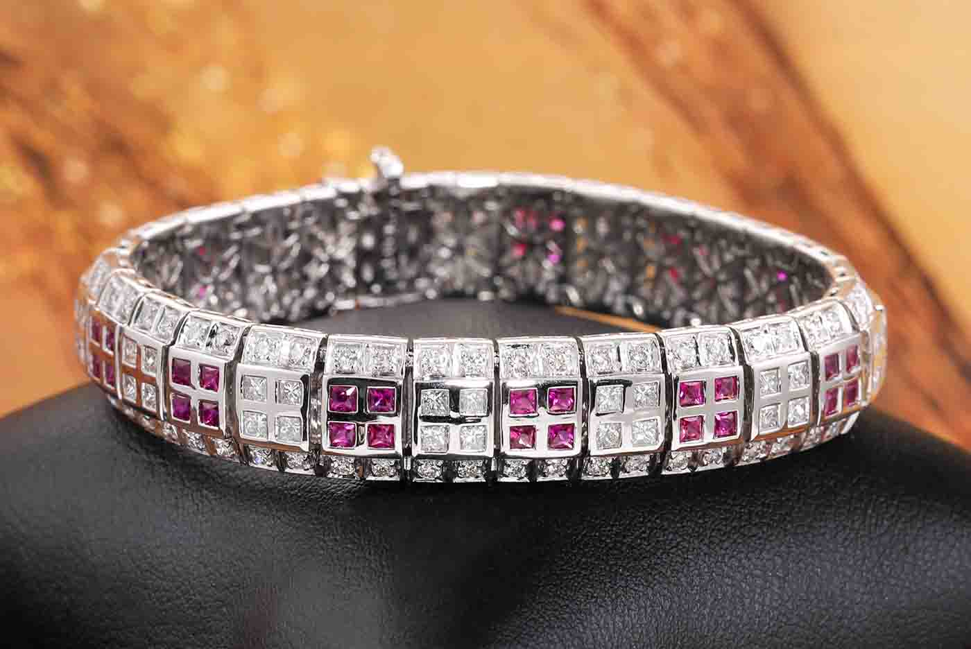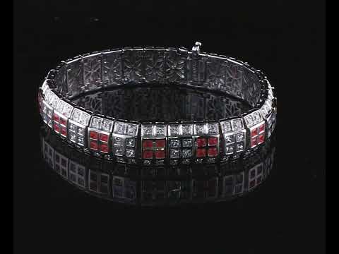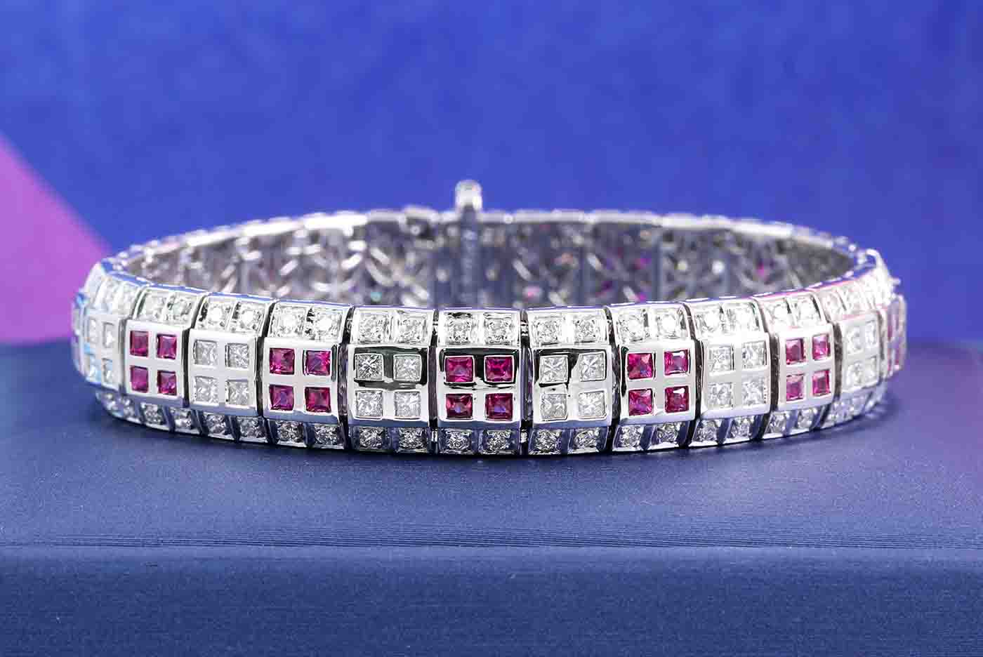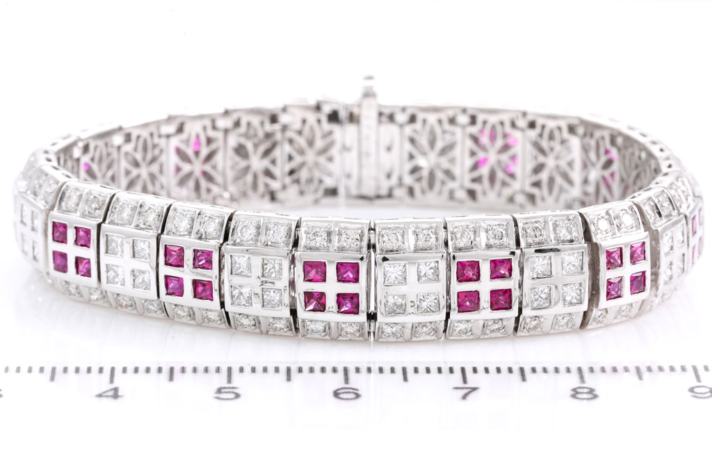 Ruby and Diamond Bracelet with carre cut Rubies totalling 3.70cts and round & princess cut Diamonds totalling 5.00cts (Estimated grading: G-H VS-SI). Platinum. Length: 16.5cm. Weight: 44.2g. With Certificate #416591. (pre-owned)
