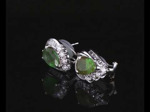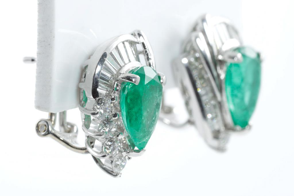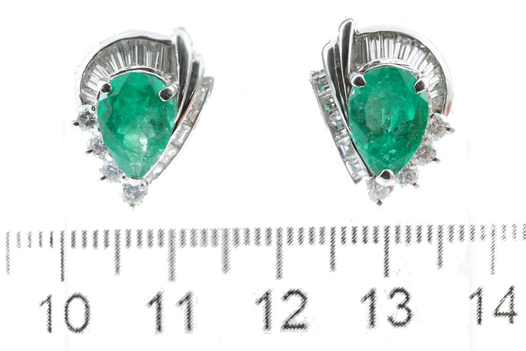 Emerald and Diamond Earrings with pear shape Emeralds totalling 3.73cts and round baguette & carre cut Diamonds totalling 1.64cts (Estimated grading: G SI - note: 2 chipped baguette Diamonds). 18ct & 14ct white gold with platinum posts. Weight: 10.0g. With GIA report #. (Pre-owned)