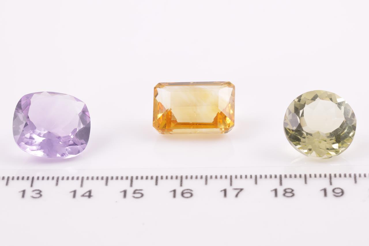 3 Loose gemstones totalling 37.40ct. Rectangular cushion Citrine approx size 17.1 x 11.6 x 8.8mm, round Lemon Quartz approx size 14.8 x 9.0mm and cushion Pink Amethyst approx size 16.0 x 16.0 x 8.0mm. (New)