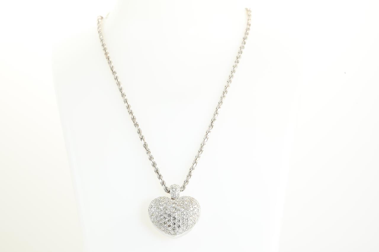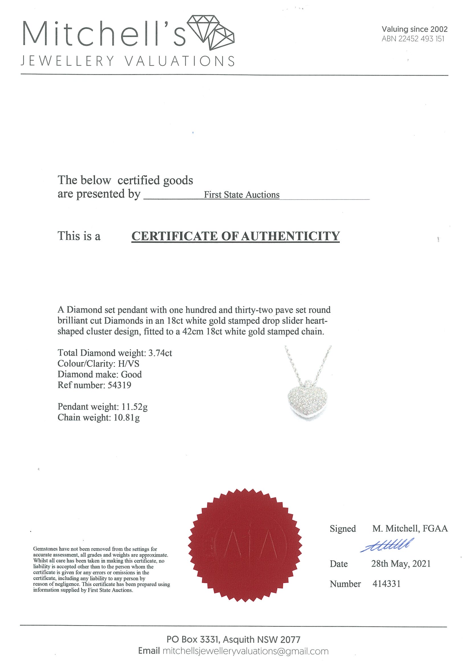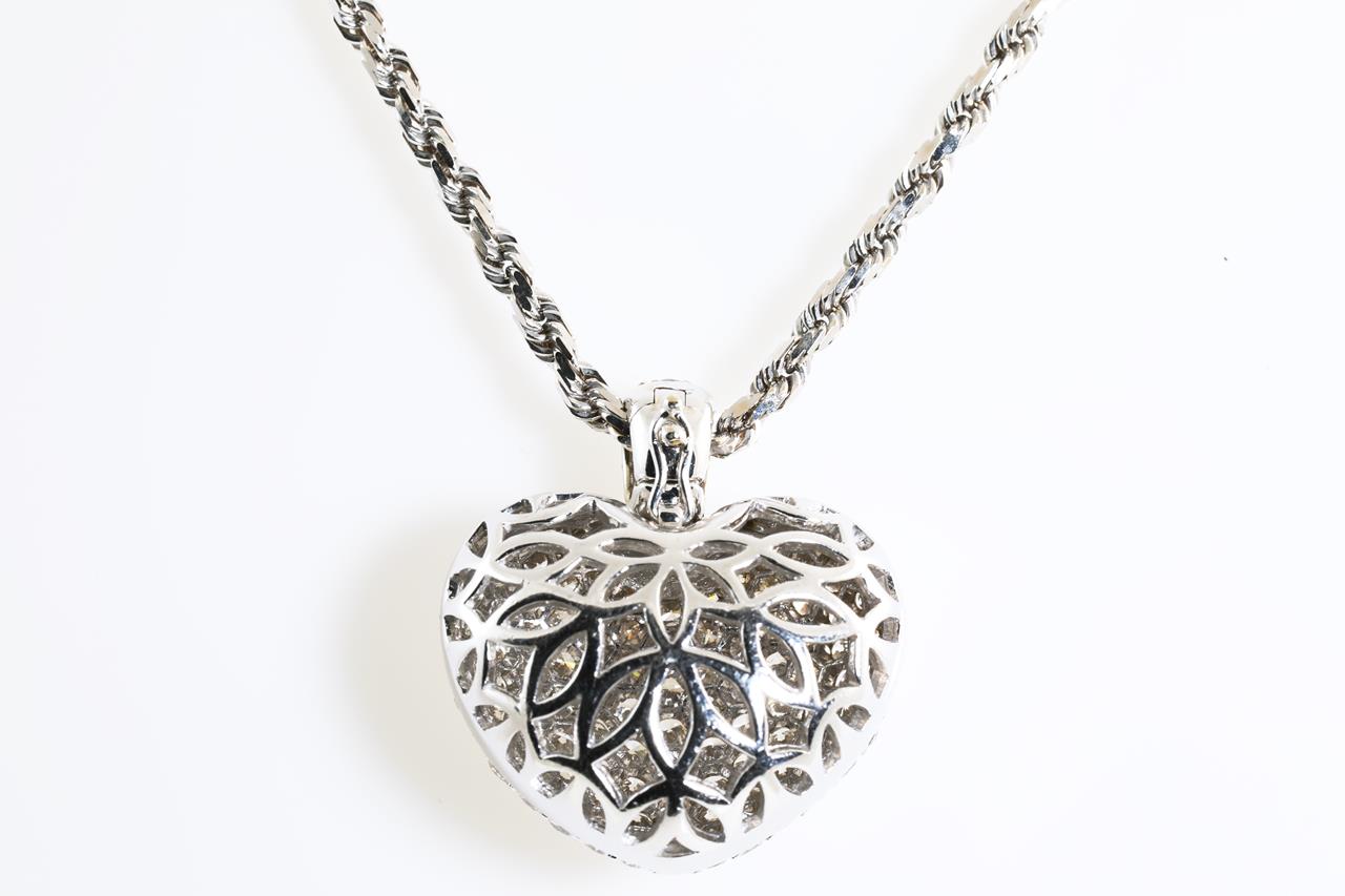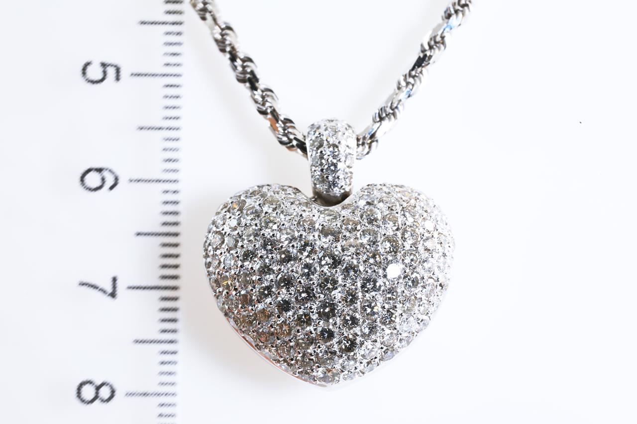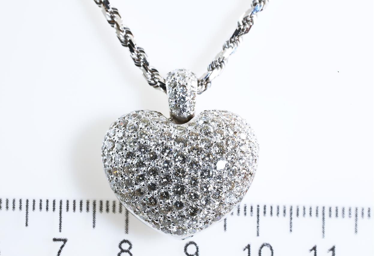 Diamond heart enhancer pendant with round Diamonds totalling 3.74cts (Estimated grading: H VS). 18ct white gold with 42cm chain. Weight: 22.3g. With certificate #414331 (Pre-owned).