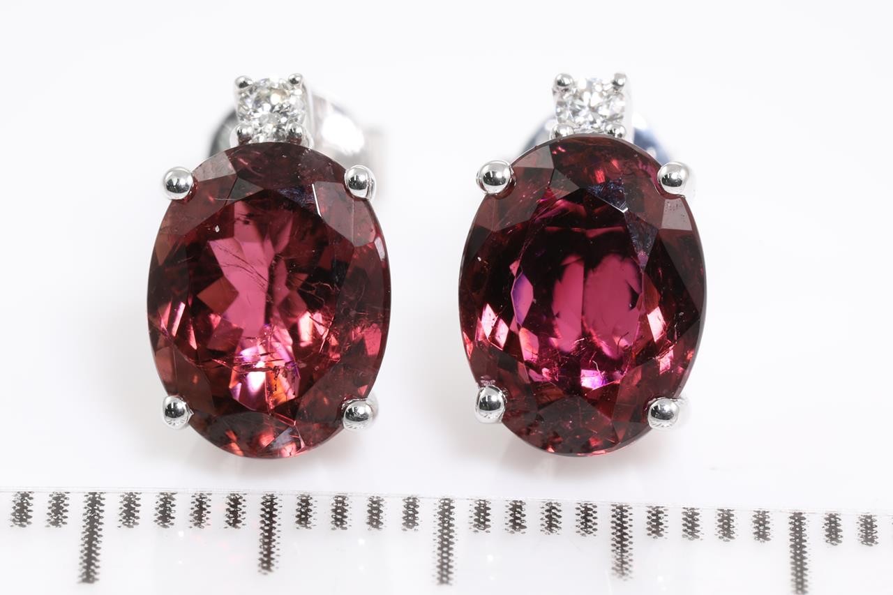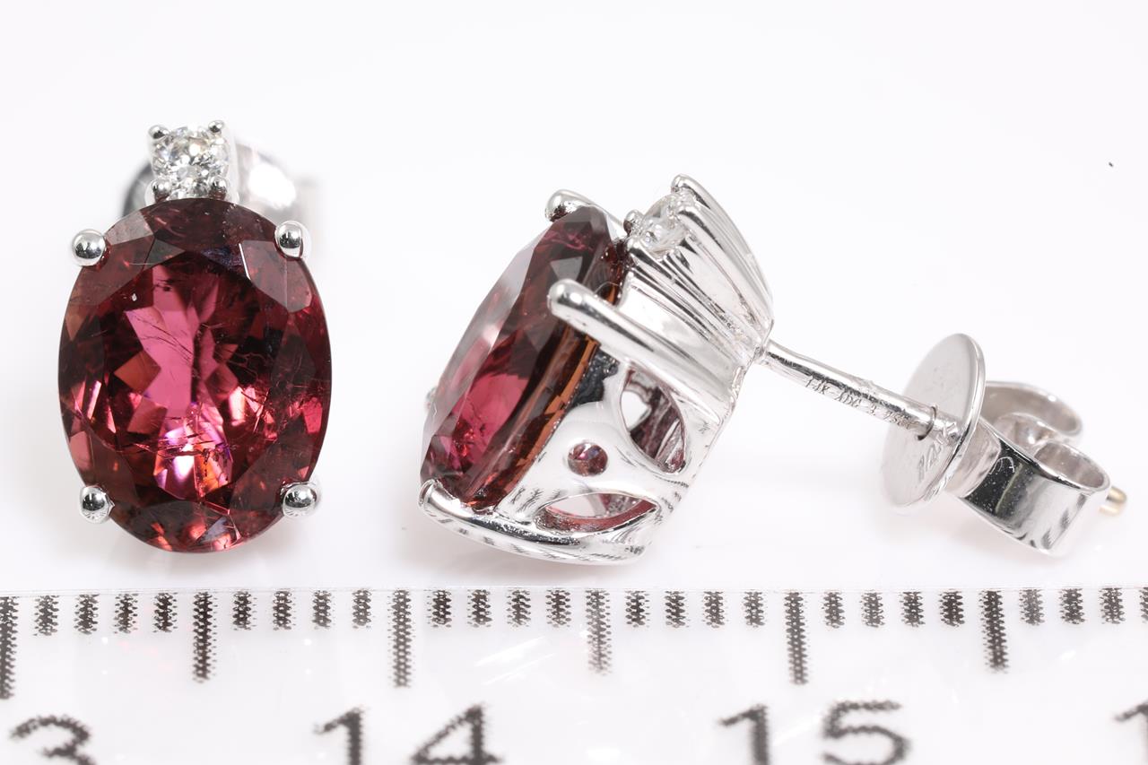 Tourmaline and Diamond earrings with oval reddish pink Tourmalines totalling 3.75cts and Diamonds totalling 0.06cts. 14ct white gold. Weight: 3.1g. (As new)