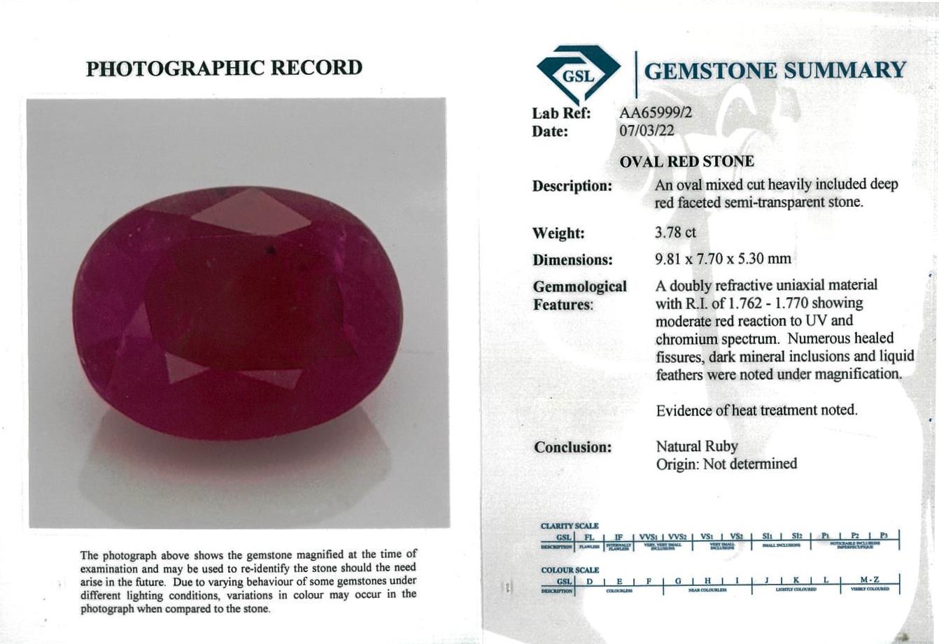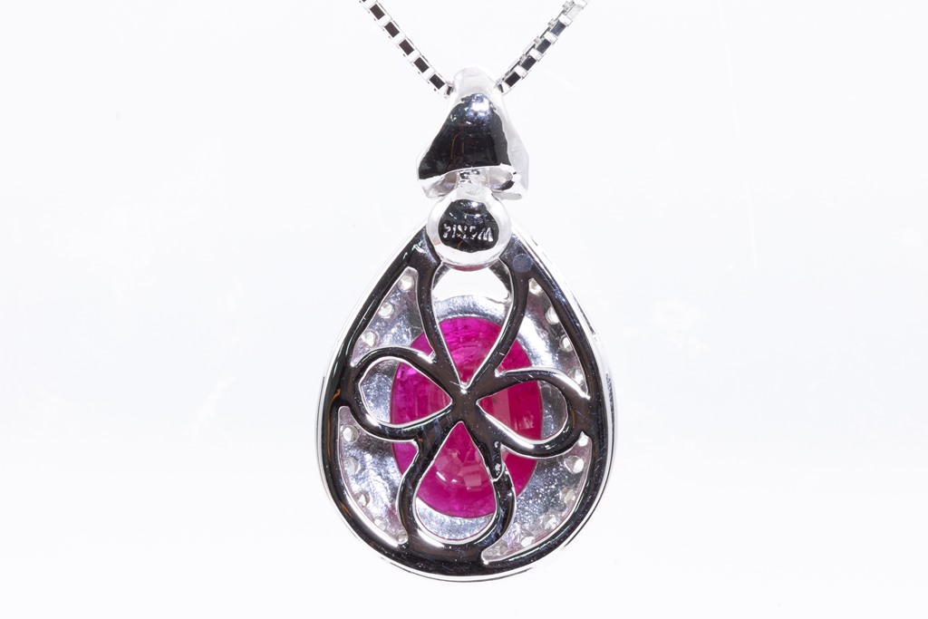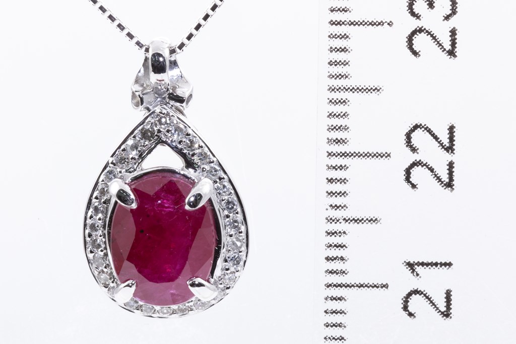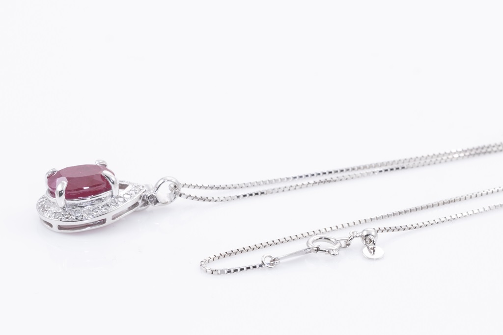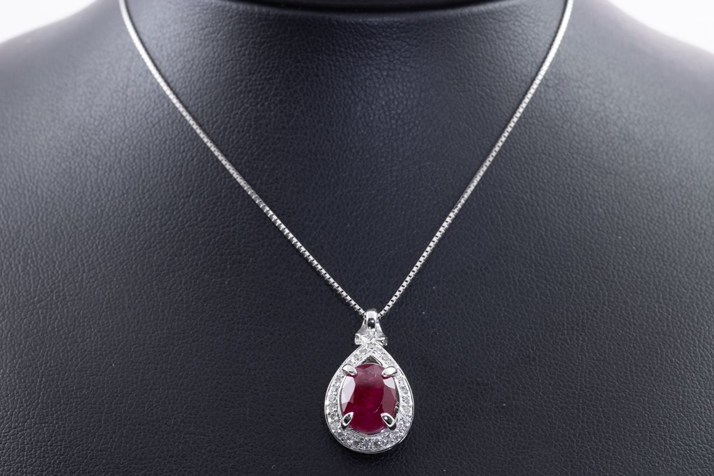 Ruby and Diamond pendant with an oval Ruby of 3.78ct (With GSL summary report #AA65999/2) and Diamonds totalling 0.25cts. 14ct white gold with 18ct white gold adjustable 44cm chain. Weight: 6.1g. (New)