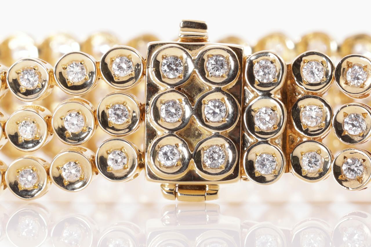 Diamond three row bracelet with round Diamonds totalling 3.80cts (Estimated grading: H-I SI). 18ct yellow gold. Length: 21cm. Weight: 29.9g. With certificate #415103. (Pre-owned)