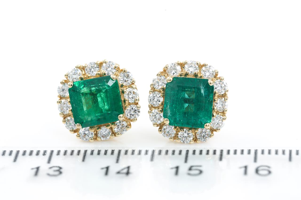 Emerald and Diamond earrings with 2 emerald cut Emeralds totalling 3.80cts and round Diamonds totalling 1.00cts (Estimated grading: H-I SI). 14ct yellow gold Weight: 4.4g With Certificate# 415445. (As New)