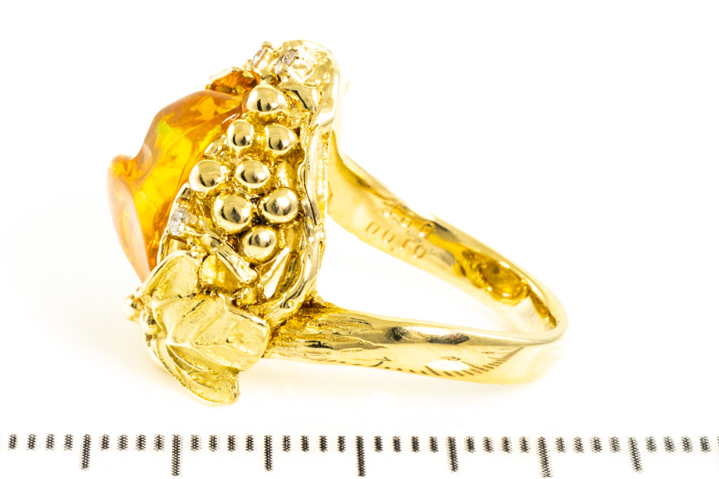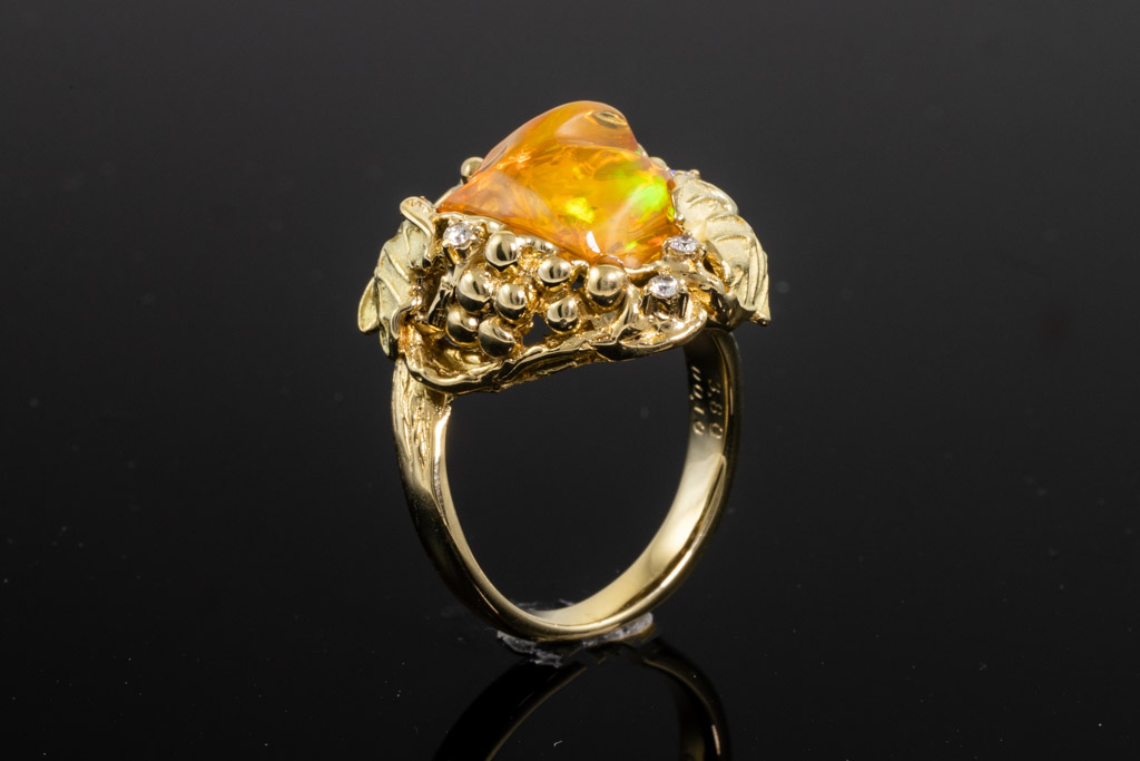 Opal and Diamond ring with freestyle shape Fire Opal of 3.80ct and round Diamonds totalling 0.10cts. 18ct yellow gold. Ring size L1/2. Weight: 11.5g. (Pre-owned)